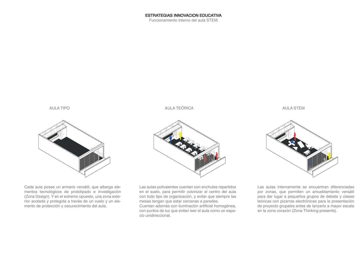 Cada aula posee un armario versátil, que alberga elementos tecnológicos de prototipado e investigación (Zona Design). Y en el extremo opuesto, una zona exterior acotada y protegida a través de un vuelo y un elemento de protección y oscurecimiento del aula.
