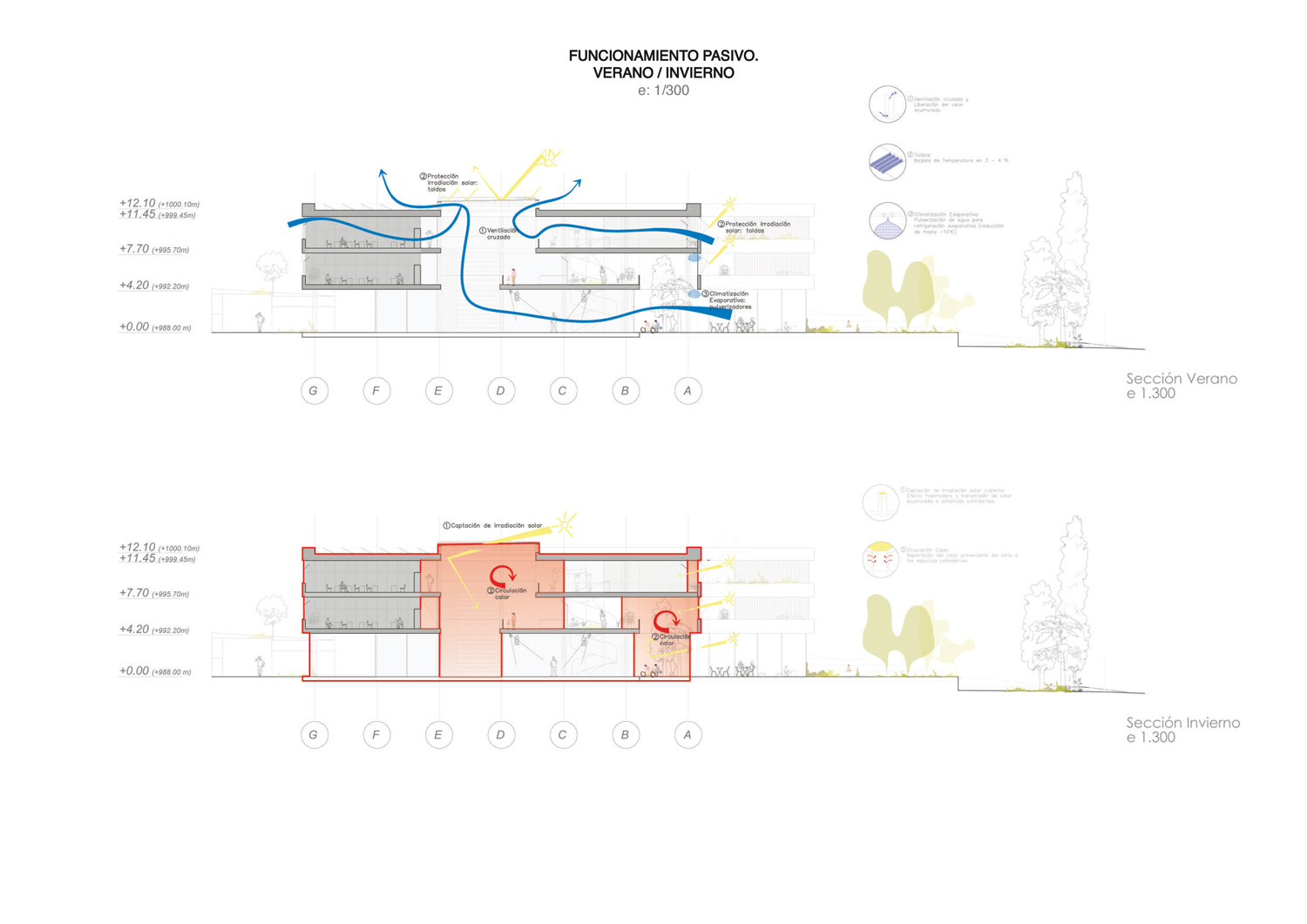 Esto, unido a los espacios invernaderos adjuntos a las zonas de trabajo y los patios interiores atemperados, hacen que todos los espacios estén aclimatados pasivamente, sin necesidad de ningún apoyo energético de gran envergadura, pudiendo ventilarse en verano a través de las rachas de vientos dominantes, o cerrarse y hermetizarse, usando el calor generado por la terraza invernadero y cubierta acristalada.