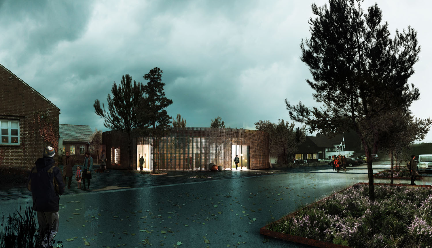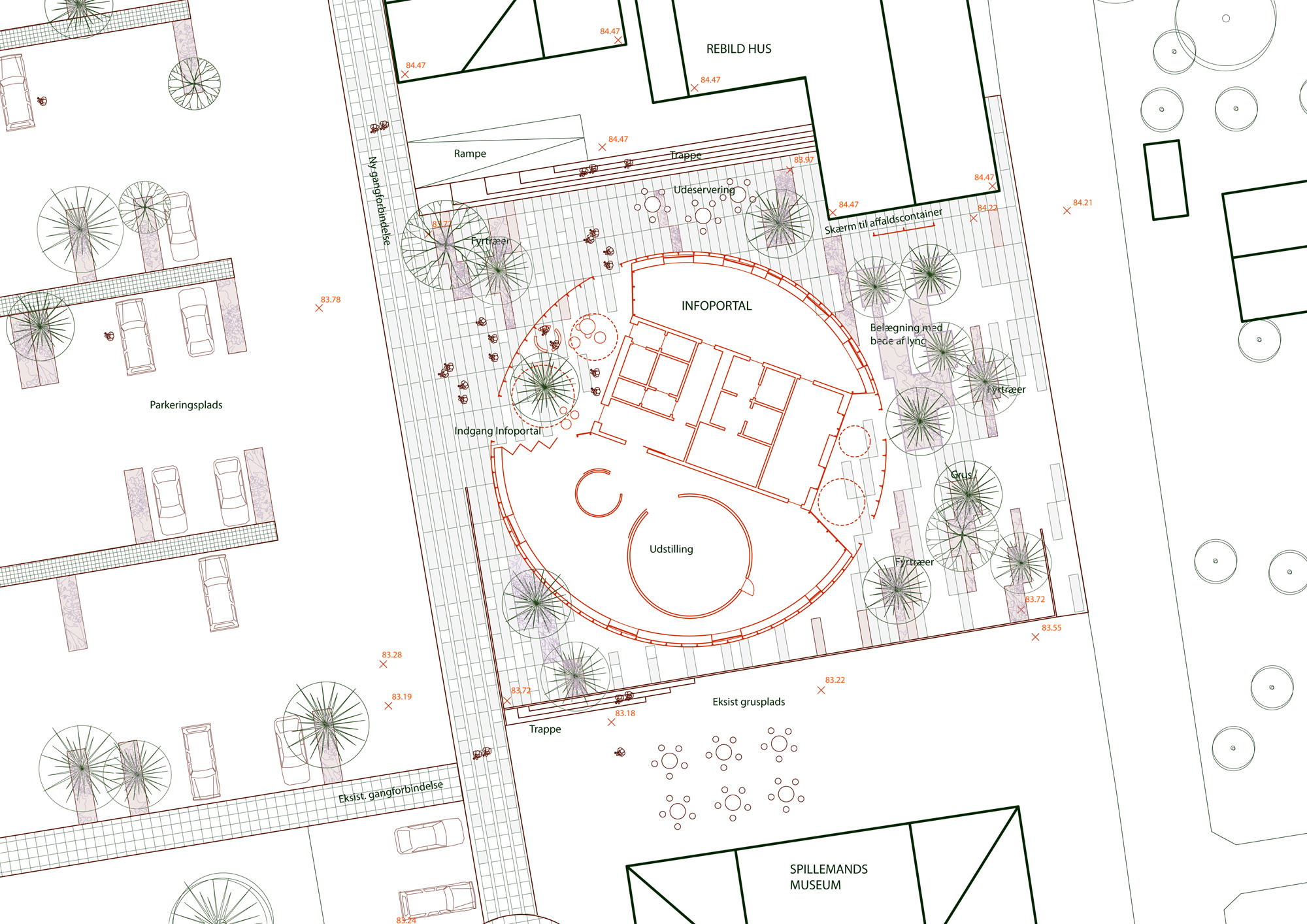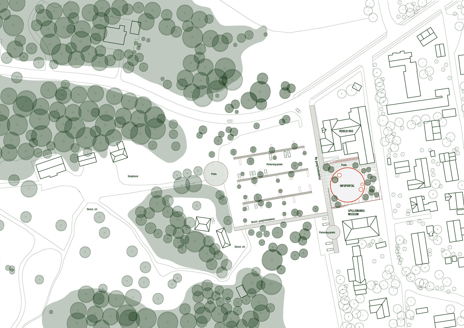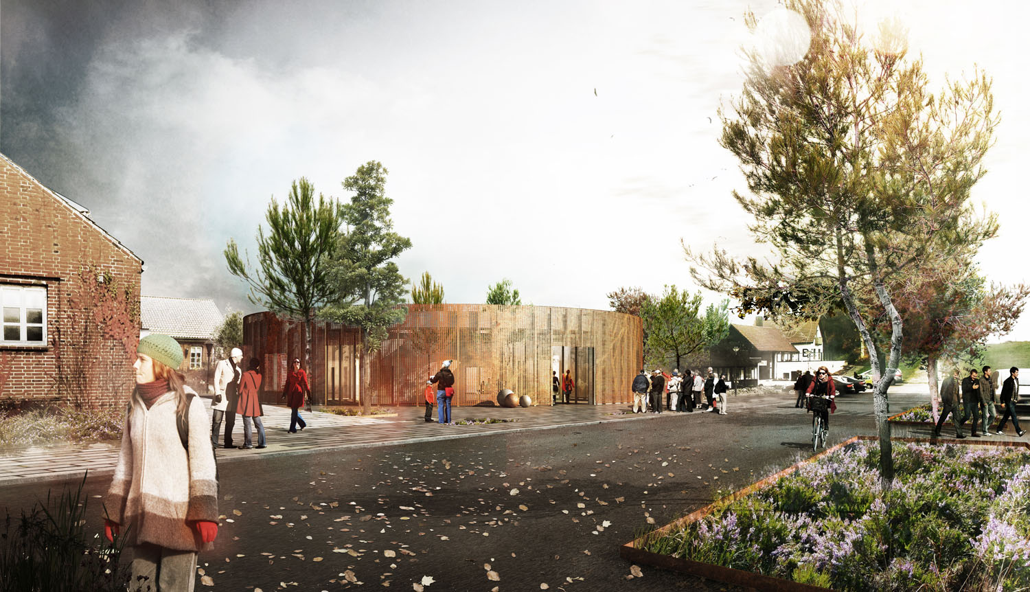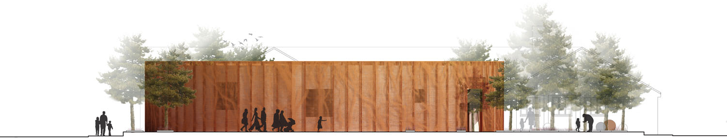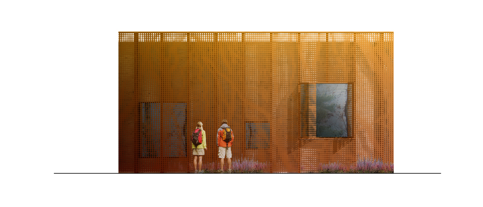 Rebild National Parkoffers some of the most dramatic and ‘authentic’ landscape in Denmark. The new Info Portal is placed on the edge of the town Rebild and the Rebild National Park. The project plays with the existing surrounding landscape, and the new building becomes a part of the National Park rather than a part of the city. The landscape is stretched from west towards the parking lot and further towards the site. A round building stands out in between the two existing buildings, Rebild Hus and The House and Folk Museum. The striking facade screen is very attractive and makes the visitor sense the light and life fragments of the indoor narratives. The facade material is Corten-steel plate with a beautiful red patina and a surprising pattern that mimics the trunks and foliage of the big forest. Behind the screen is a covered outdoor area – a courtyard. From here the visitor can look into the indoor exhibition area and have the most important information about Rebild National Park. The courtyard both gives an introduction both to the Information Portal and to The Rebild National Park.