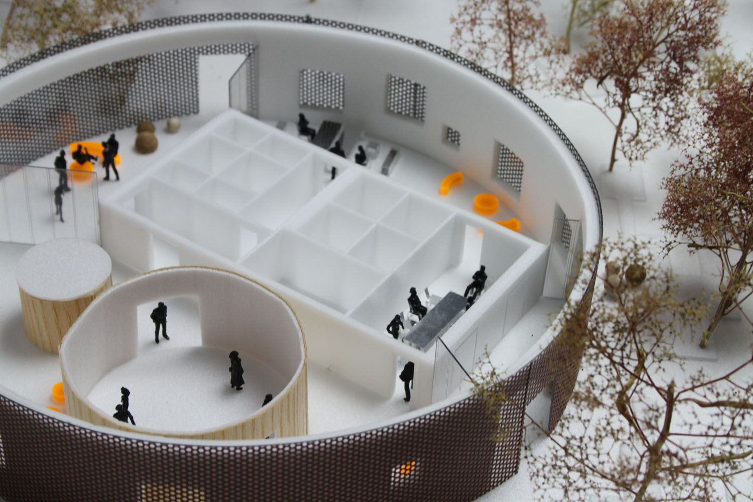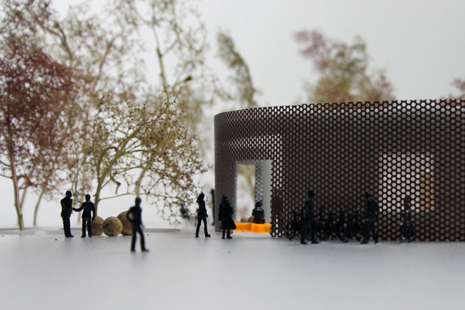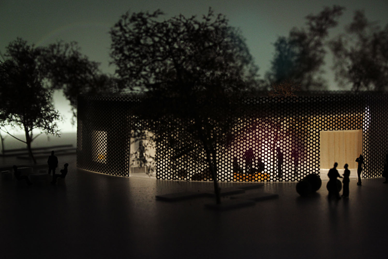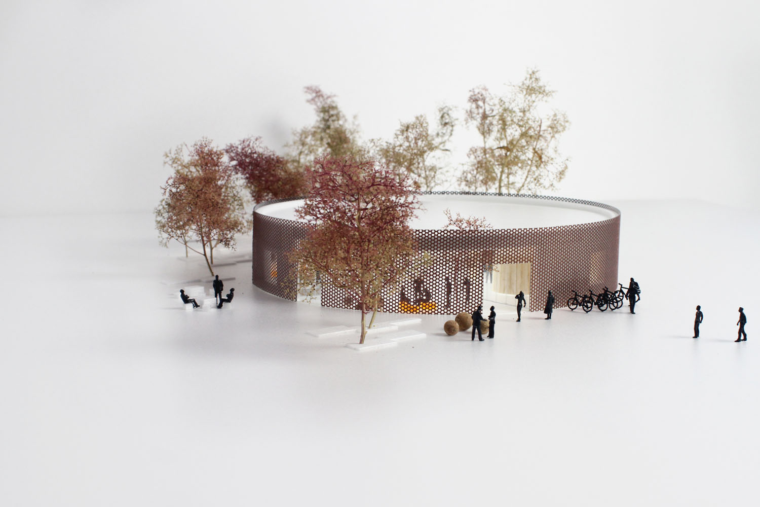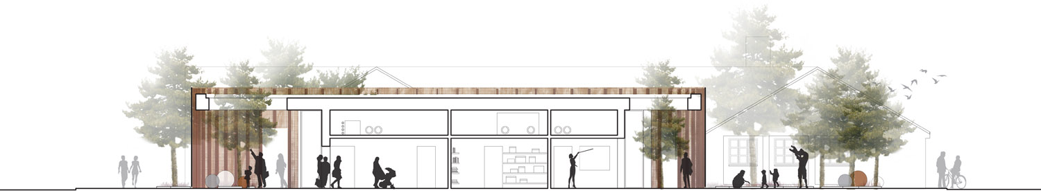 Rebild National Parkoffers some of the most dramatic and ‘authentic’ landscape in Denmark. The new Info Portal is placed on the edge of the town Rebild and the Rebild National Park. The project plays with the existing surrounding landscape, and the new building becomes a part of the National Park rather than a part of the city. The landscape is stretched from west towards the parking lot and further towards the site. A round building stands out in between the two existing buildings, Rebild Hus and The House and Folk Museum. The striking facade screen is very attractive and makes the visitor sense the light and life fragments of the indoor narratives. The facade material is Corten-steel plate with a beautiful red patina and a surprising pattern that mimics the trunks and foliage of the big forest. Behind the screen is a covered outdoor area – a courtyard. From here the visitor can look into the indoor exhibition area and have the most important information about Rebild National Park. The courtyard both gives an introduction both to the Information Portal and to The Rebild National Park.
