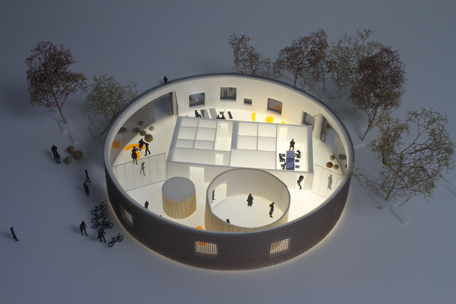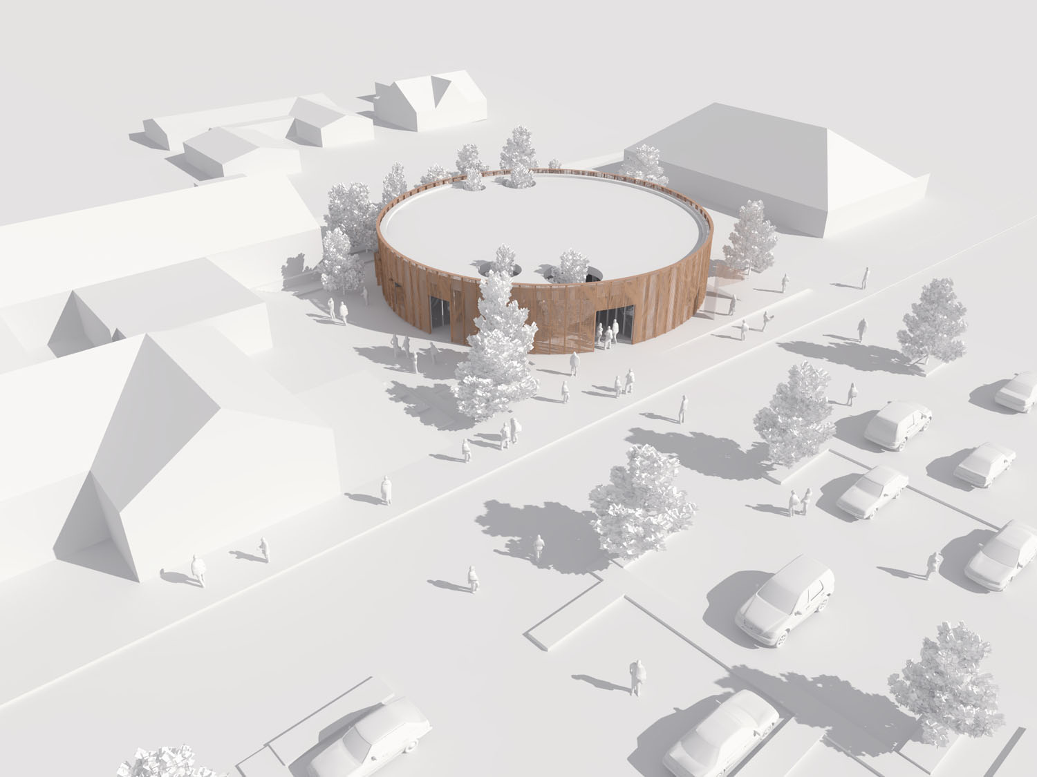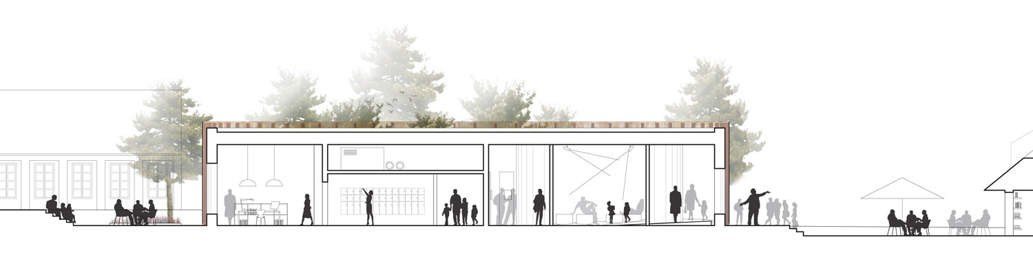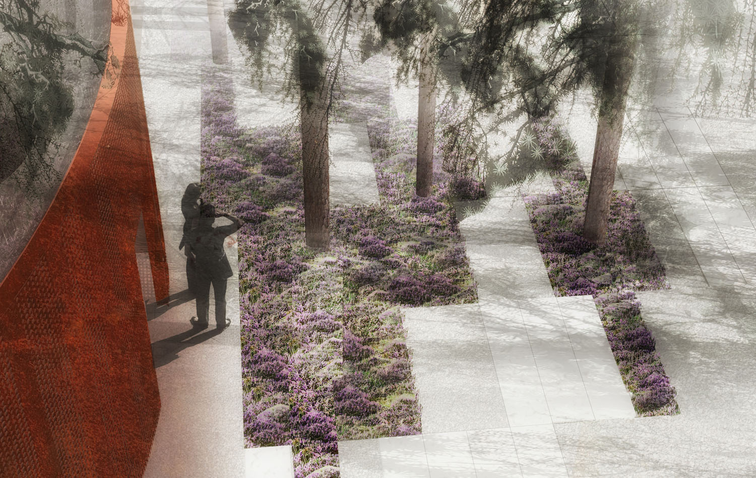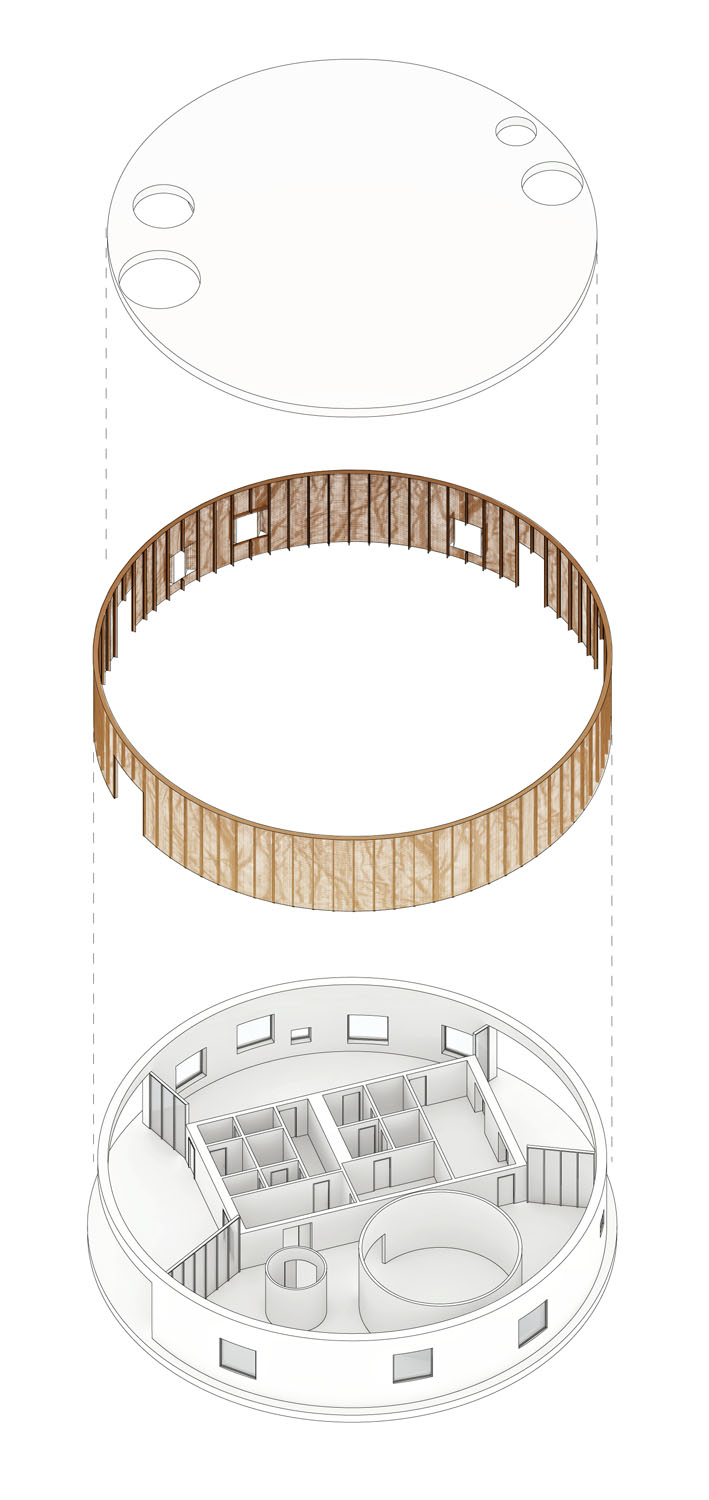 Rebild National Parkoffers some of the most dramatic and ‘authentic’ landscape in Denmark. The new Info Portal is placed on the edge of the town Rebild and the Rebild National Park. The project plays with the existing surrounding landscape, and the new building becomes a part of the National Park rather than a part of the city. The landscape is stretched from west towards the parking lot and further towards the site. A round building stands out in between the two existing buildings, Rebild Hus and The House and Folk Museum. The striking facade screen is very attractive and makes the visitor sense the light and life fragments of the indoor narratives. The facade material is Corten-steel plate with a beautiful red patina and a surprising pattern that mimics the trunks and foliage of the big forest. Behind the screen is a covered outdoor area – a courtyard. From here the visitor can look into the indoor exhibition area and have the most important information about Rebild National Park. The courtyard both gives an introduction both to the Information Portal and to The Rebild National Park.
