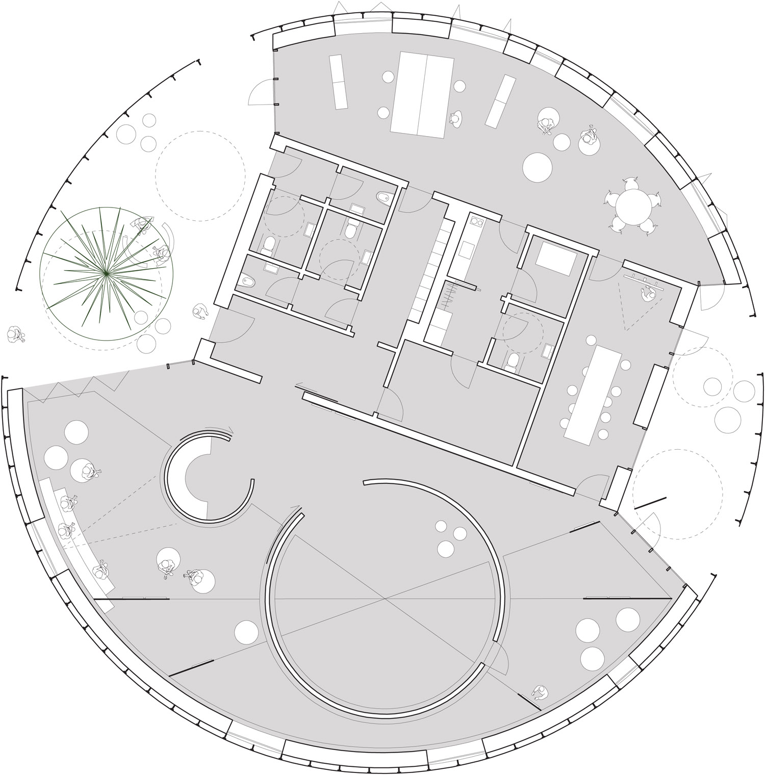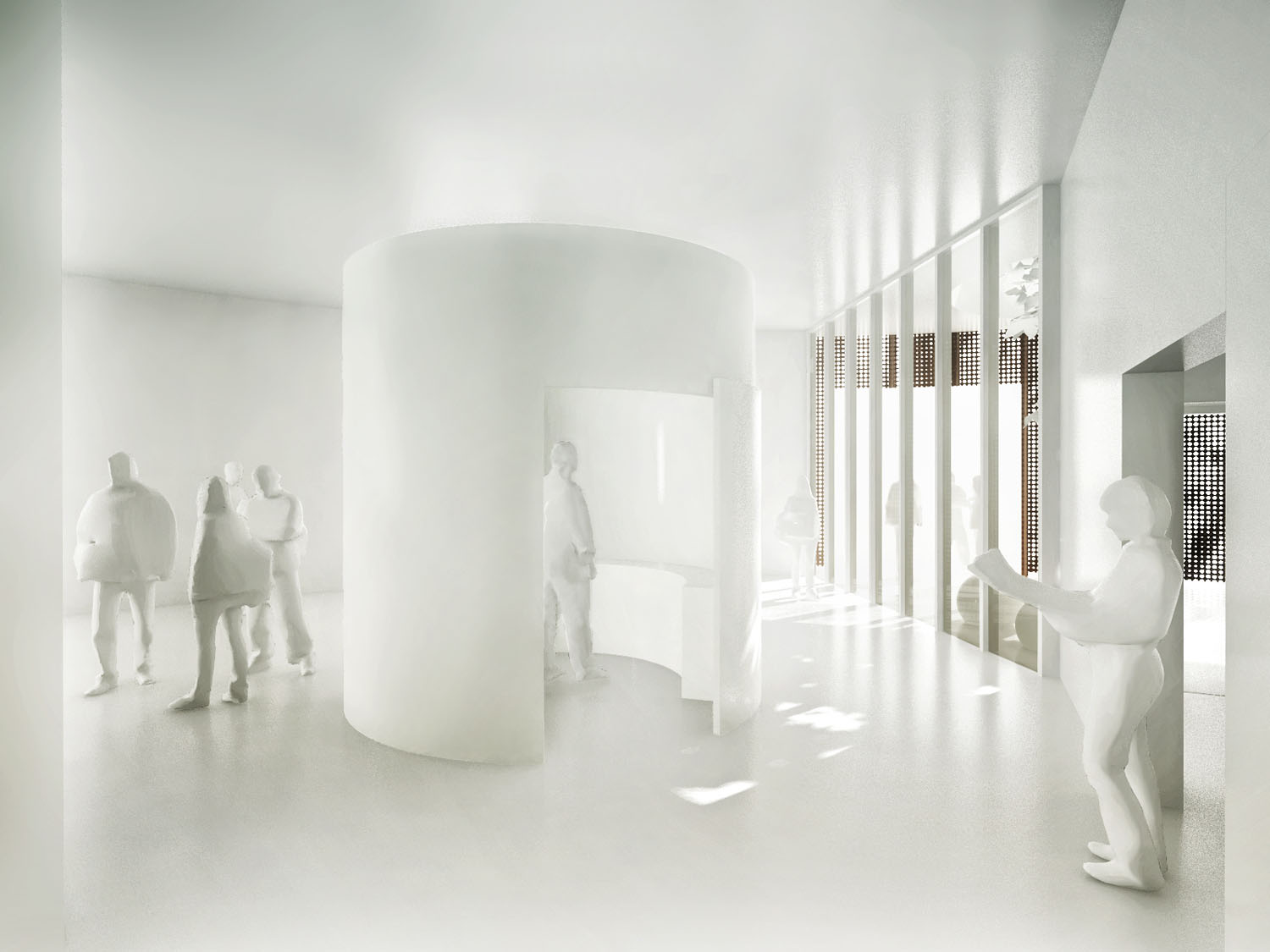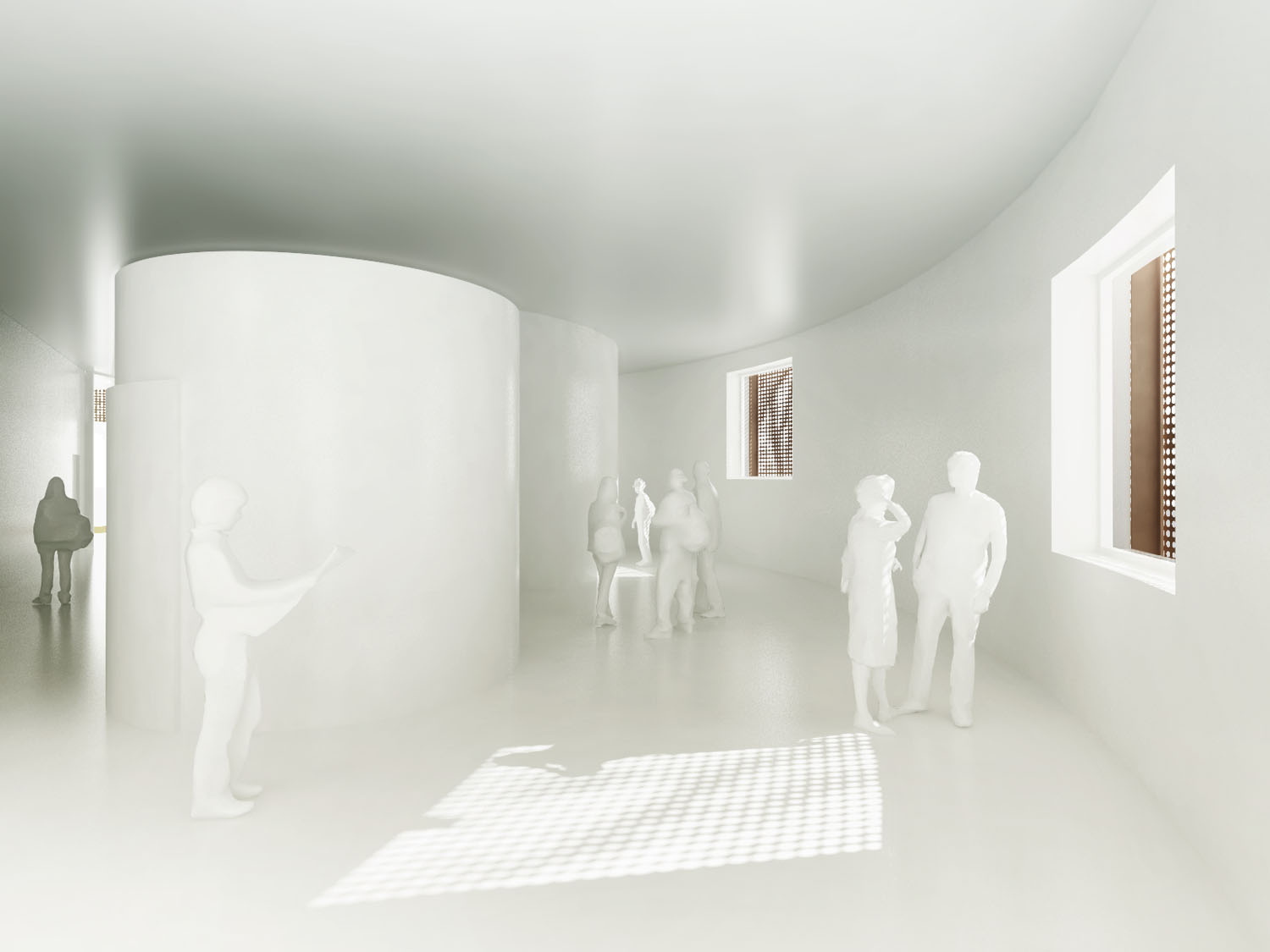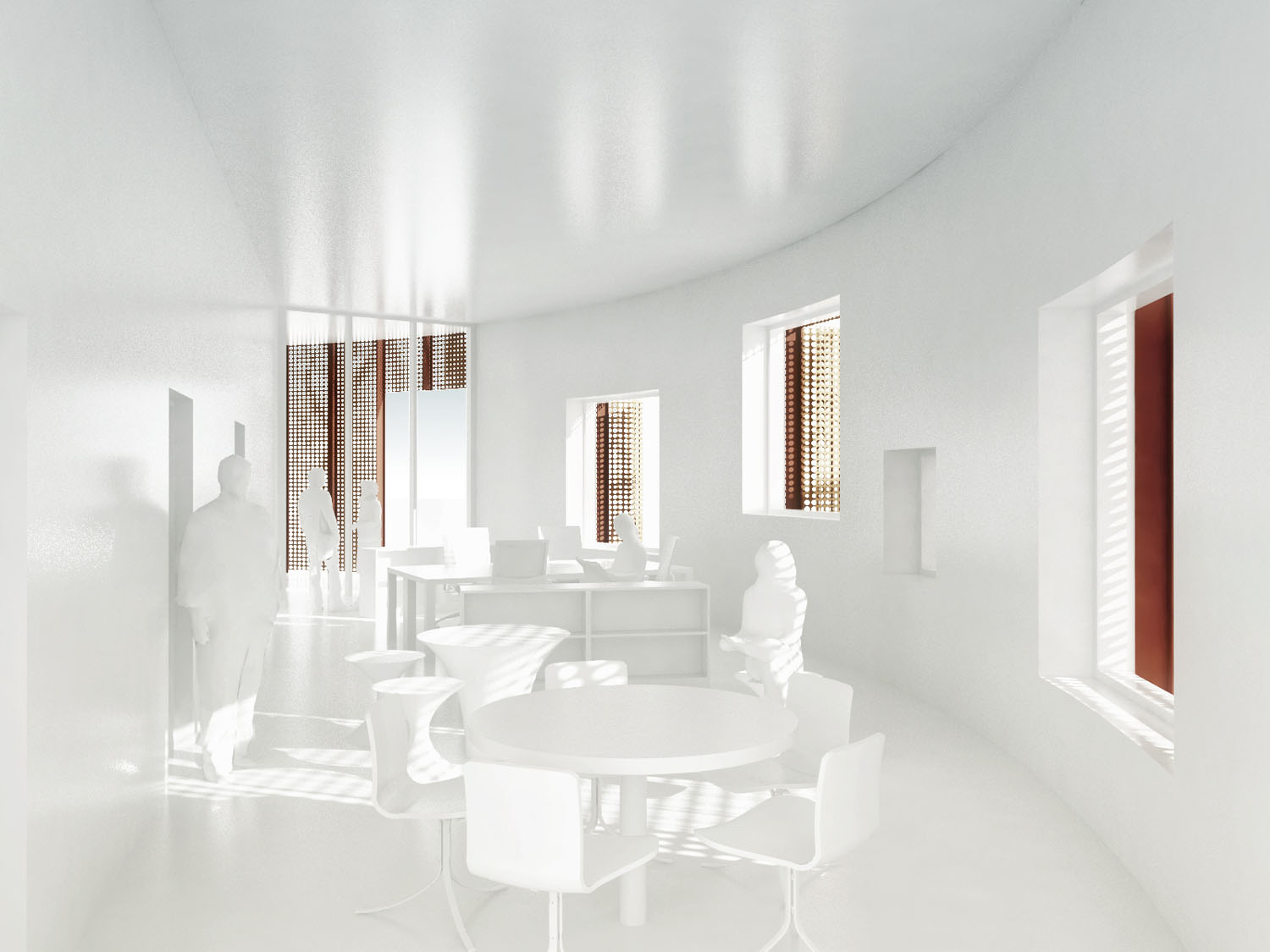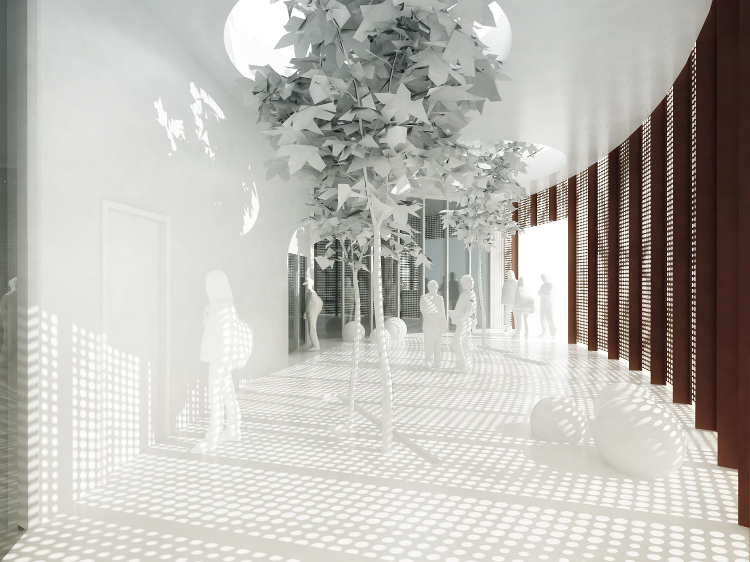 Rebild National Parkoffers some of the most dramatic and ‘authentic’ landscape in Denmark. The new Info Portal is placed on the edge of the town Rebild and the Rebild National Park. The project plays with the existing surrounding landscape, and the new building becomes a part of the National Park rather than a part of the city. The landscape is stretched from west towards the parking lot and further towards the site. A round building stands out in between the two existing buildings, Rebild Hus and The House and Folk Museum. The striking facade screen is very attractive and makes the visitor sense the light and life fragments of the indoor narratives. The facade material is Corten-steel plate with a beautiful red patina and a surprising pattern that mimics the trunks and foliage of the big forest. Behind the screen is a covered outdoor area – a courtyard. From here the visitor can look into the indoor exhibition area and have the most important information about Rebild National Park. The courtyard both gives an introduction both to the Information Portal and to The Rebild National Park.