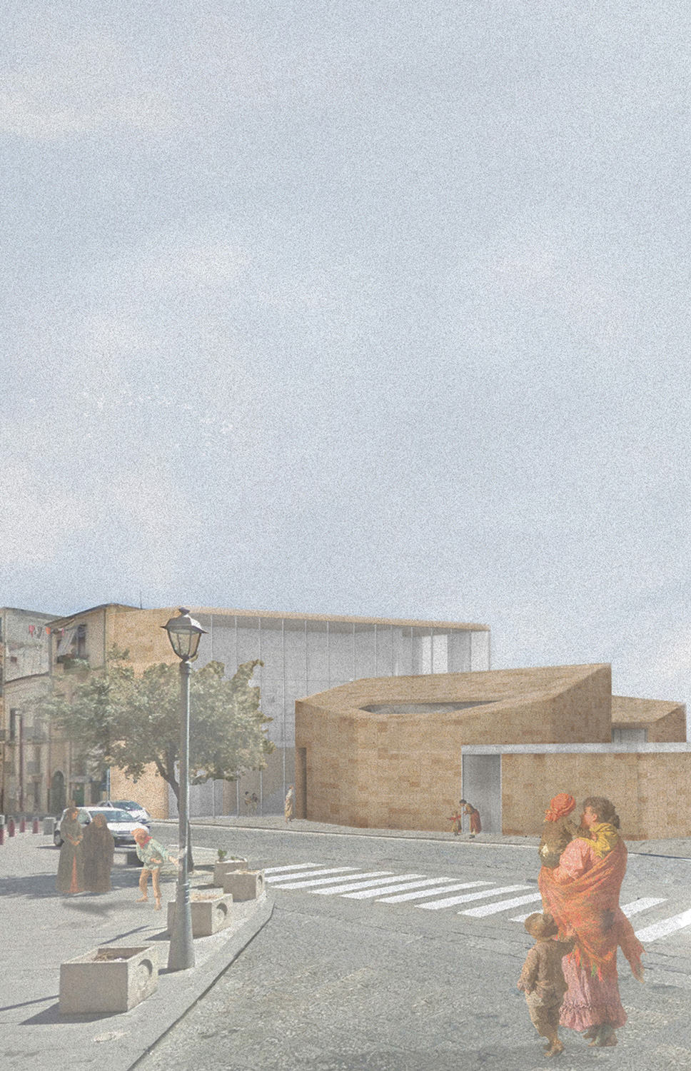 The project wants to create a new relationship between the new city of Ercolano and the ancient archeological site, through a contemporary sign within the urban pattern.