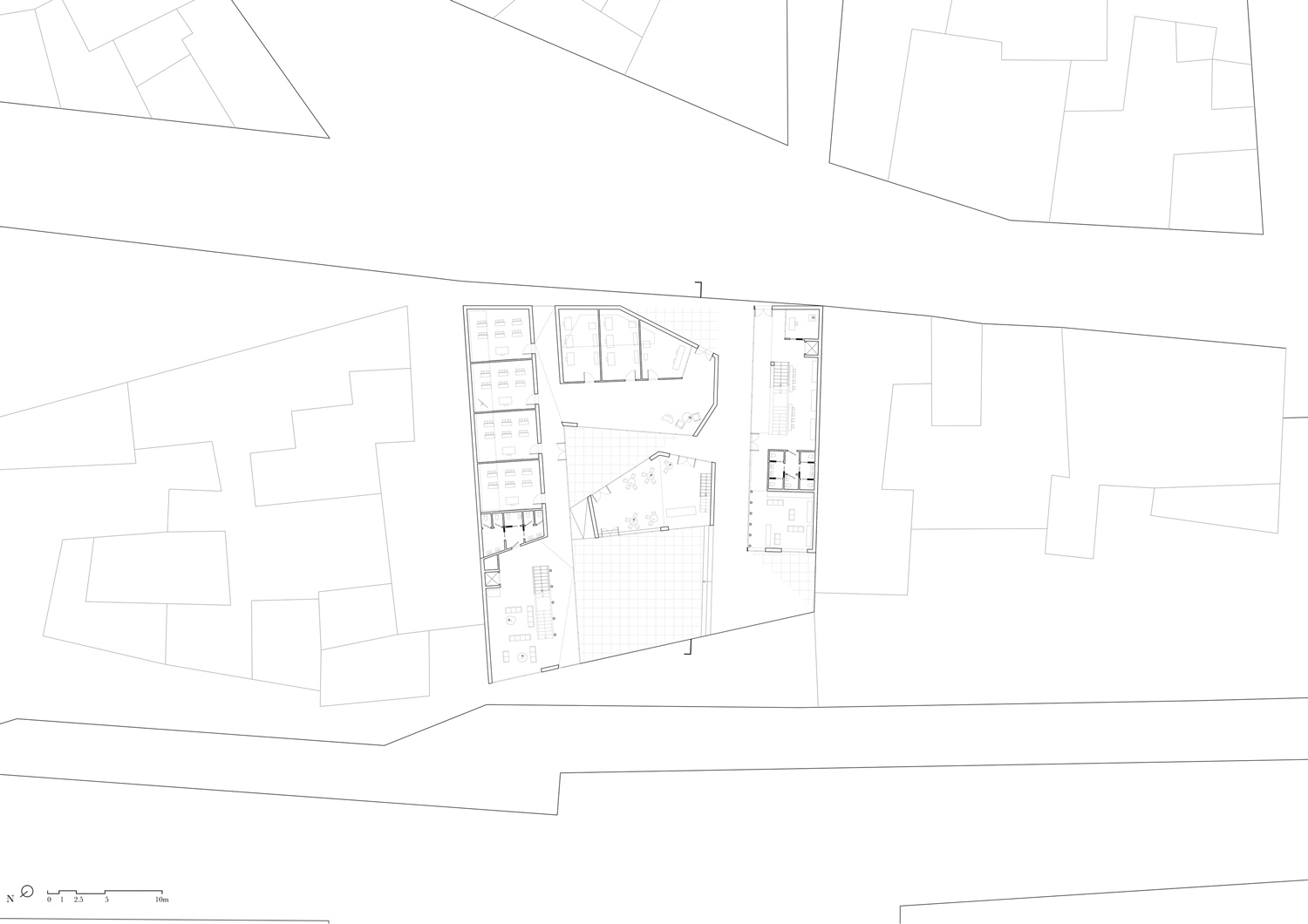The planimetry consists of single objects, which, isolated or juxtaposed, aim to design open spaces dedicated to the community. The composition, moreover, is affected by the analogy with the building technique of the opus incertum.