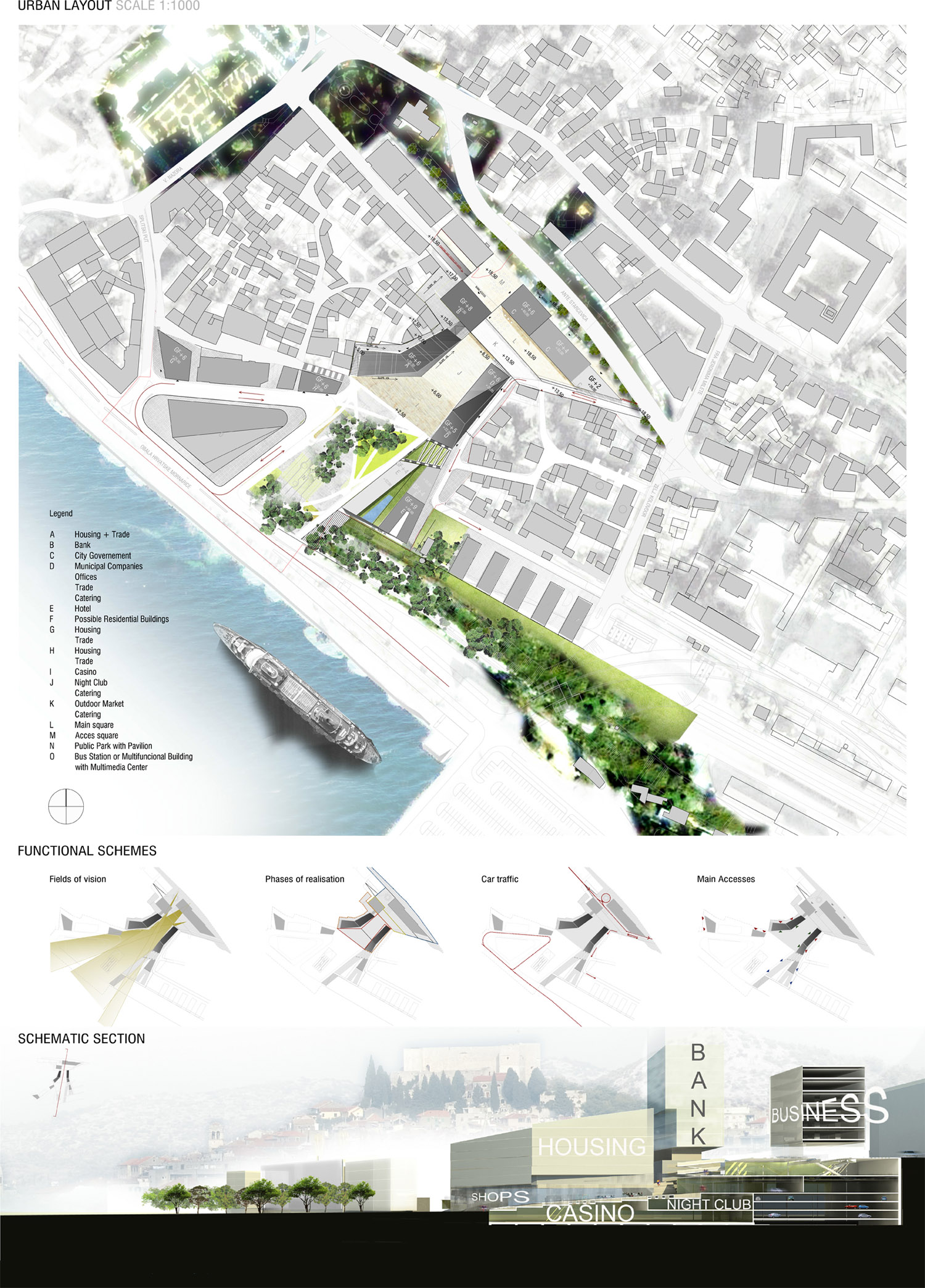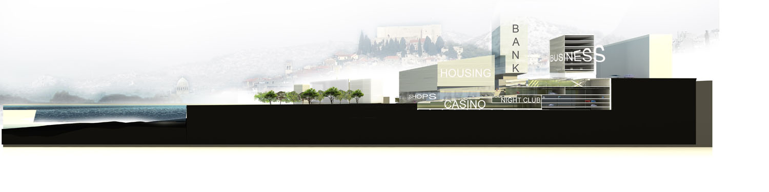 El vacío entre las islas marca un eje que continua en tierra firme, en la Draga. Hay una estructura geológica, que provoca vacíos y llenos, que se encuentra en el lugar. Nosotros queremos respetarla, continuarla, construirla. Construimos en los límites del lugar. A derecha y a izquierda los volúmenes consolidan la topografía. Al fondo, siguiendo el eje de la calle, nuestros edificios la construyen, y hacen de puerta hacia todo el conjunto. El centro es espacio público, vacío con varios tratamientos: pasando gradualmente de la mayor urbanidad en la plaza sobre la calle a mayor presencia de la naturaleza en el límite con el mar.