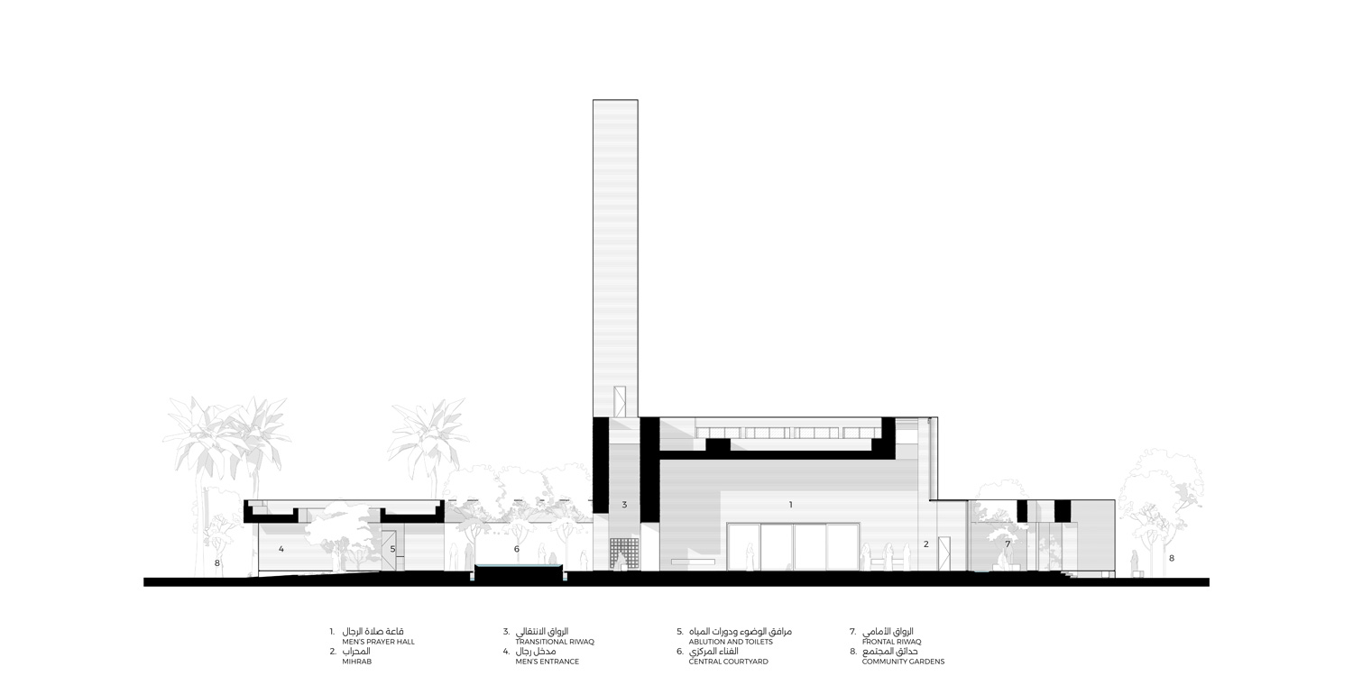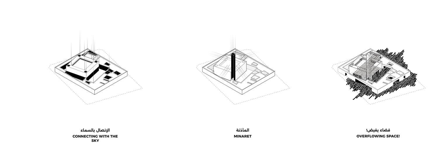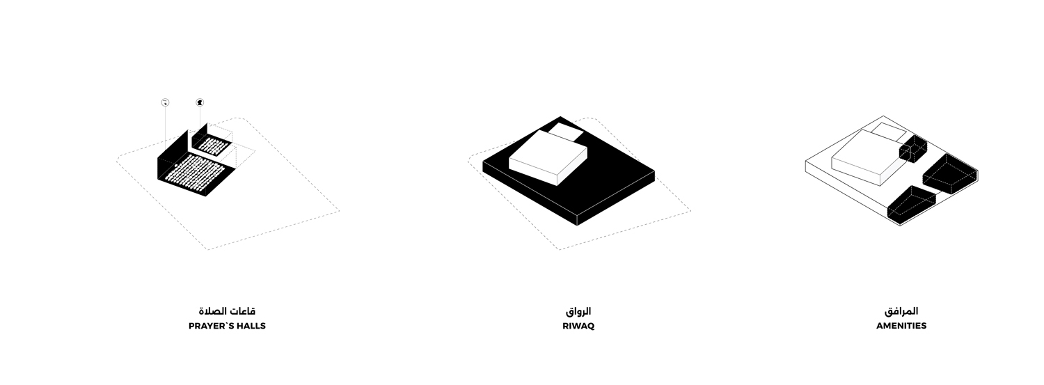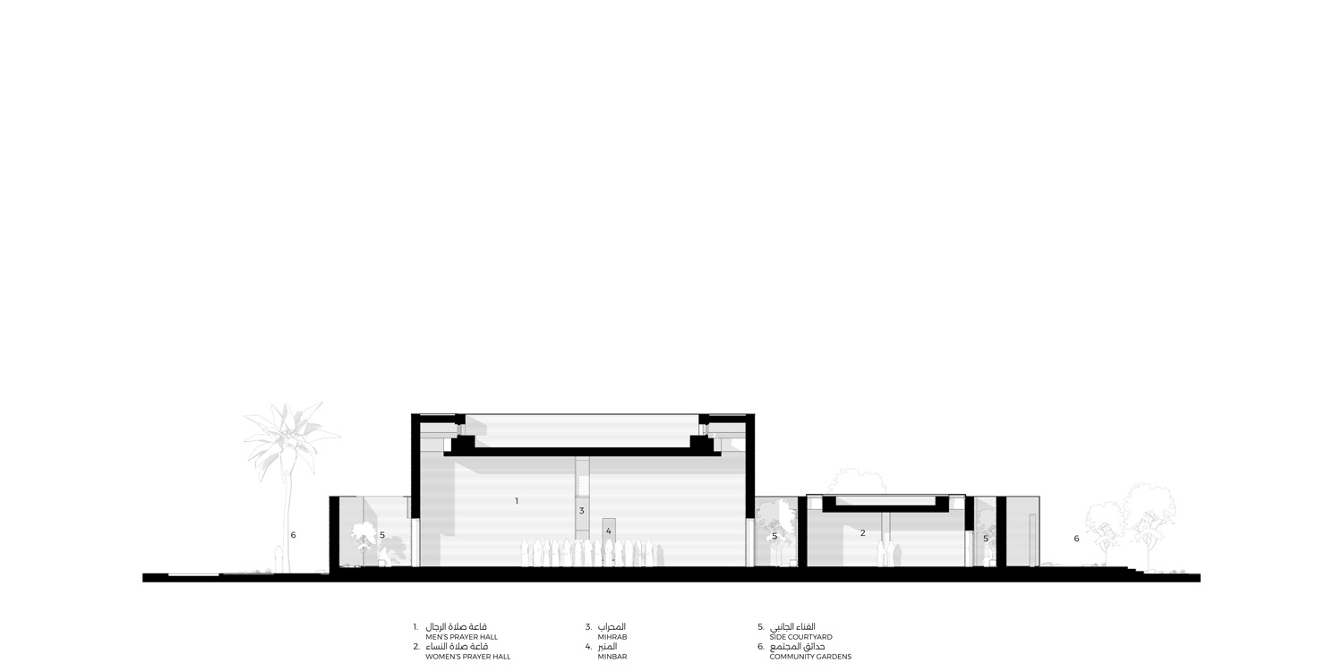 Jami’ Al Rahmaniya is located in the Al Rahmaniya Suburb of Sharjah, UAE, and can accommodate 500 worshipers. Through our understanding, the mosque’s space is not limited to its physical structure (the destination) but also includes the spiritual experience it represents (the journey). Based on this idea, the mosque’s space goes beyond the concept of the physical building. We began the design process by defining the direction of the Qibla wall, which represents the sides of the prayer halls. The spatial experience of the mosque was designed to be fair for women and men, with the women’s prayer hall located on the same level as the men’s prayer hall, without the need to build an additional floor. We then surrounded the prayer halls with a Riwq that defines the mosque and its relationship to its context, allowing us to add the necessary amenities without building additional extensions. Next, we defined the site entrance and organized the path of vehicles within the boundaries of the land, adding the required parking spaces. We carved courtyards into the Riwaq to create an intermediate space between the prayer halls and the outdoor spaces to formulate a space that connected to the sky in the House of God. Finally, we added a simple minaret as a visual sign for visitors to guide visitors. We also extended the prayer rows outside the prayer halls so that the building integrates with the urban fabric through the continuity of these rows, which contributes to creating community gardens in the mosque space.