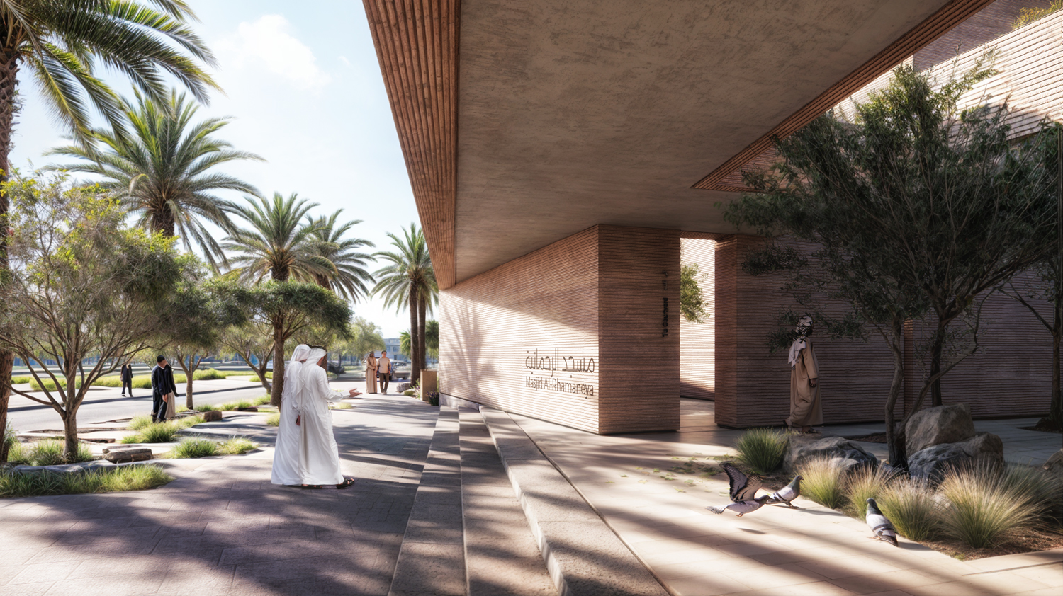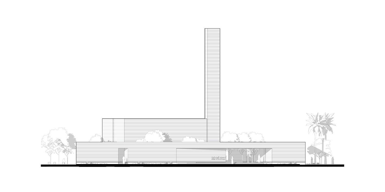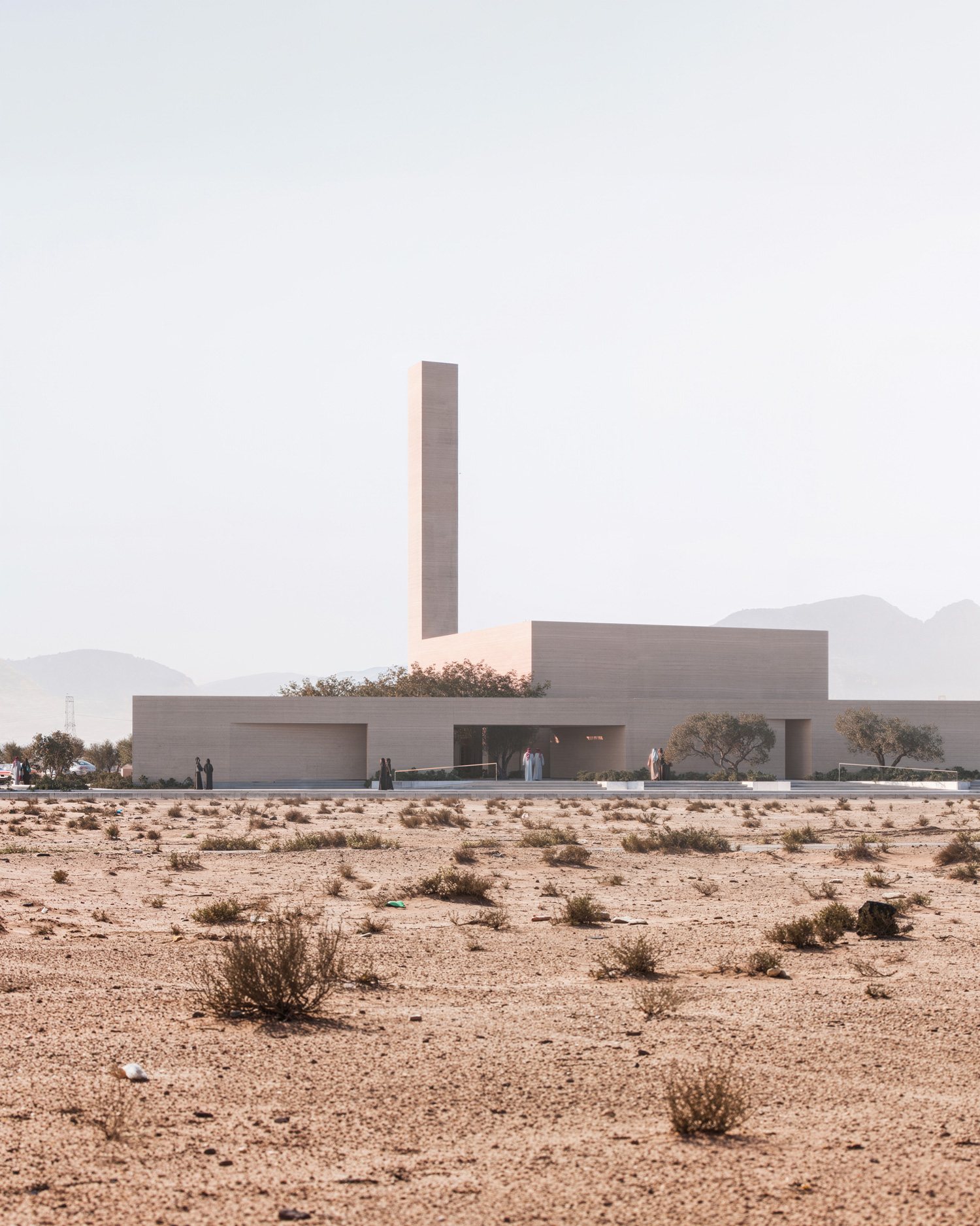 Jami’ Al Rahmaniya is located in the Al Rahmaniya Suburb of Sharjah, UAE, and can accommodate 500 worshipers. Through our understanding, the mosque’s space is not limited to its physical structure (the destination) but also includes the spiritual experience it represents (the journey). Based on this idea, the mosque’s space goes beyond the concept of the physical building. We began the design process by defining the direction of the Qibla wall, which represents the sides of the prayer halls. The spatial experience of the mosque was designed to be fair for women and men, with the women’s prayer hall located on the same level as the men’s prayer hall, without the need to build an additional floor. We then surrounded the prayer halls with a Riwq that defines the mosque and its relationship to its context, allowing us to add the necessary amenities without building additional extensions. Next, we defined the site entrance and organized the path of vehicles within the boundaries of the land, adding the required parking spaces. We carved courtyards into the Riwaq to create an intermediate space between the prayer halls and the outdoor spaces to formulate a space that connected to the sky in the House of God. Finally, we added a simple minaret as a visual sign for visitors to guide visitors. We also extended the prayer rows outside the prayer halls so that the building integrates with the urban fabric through the continuity of these rows, which contributes to creating community gardens in the mosque space.