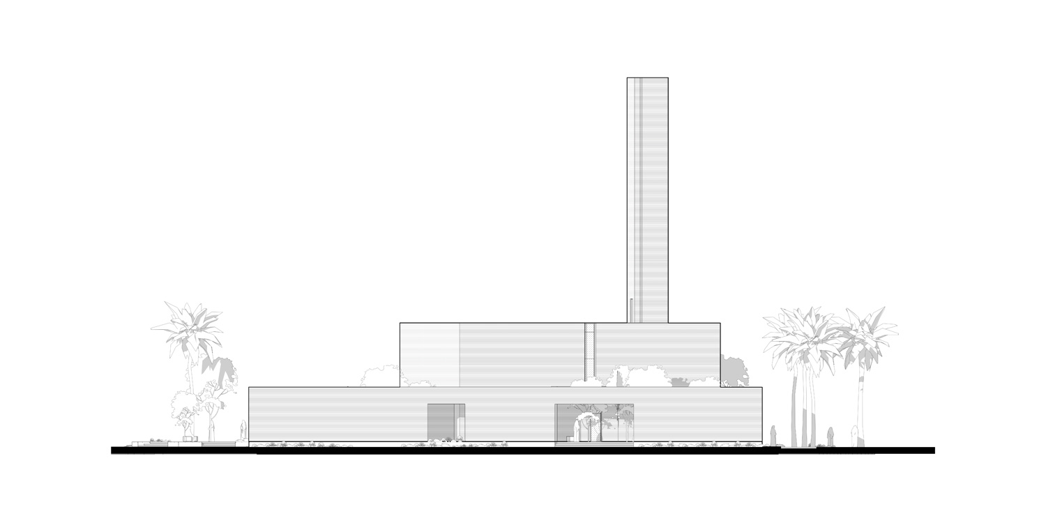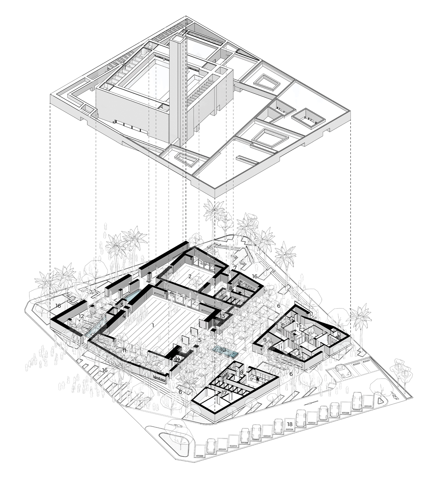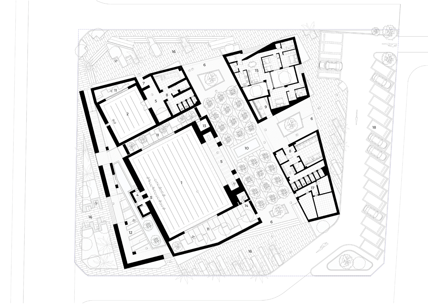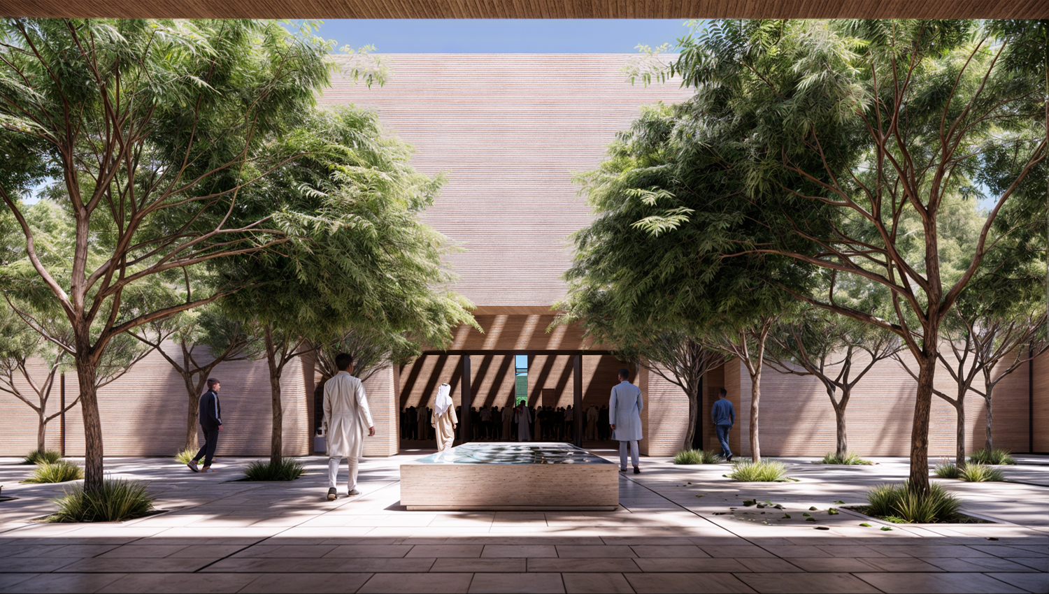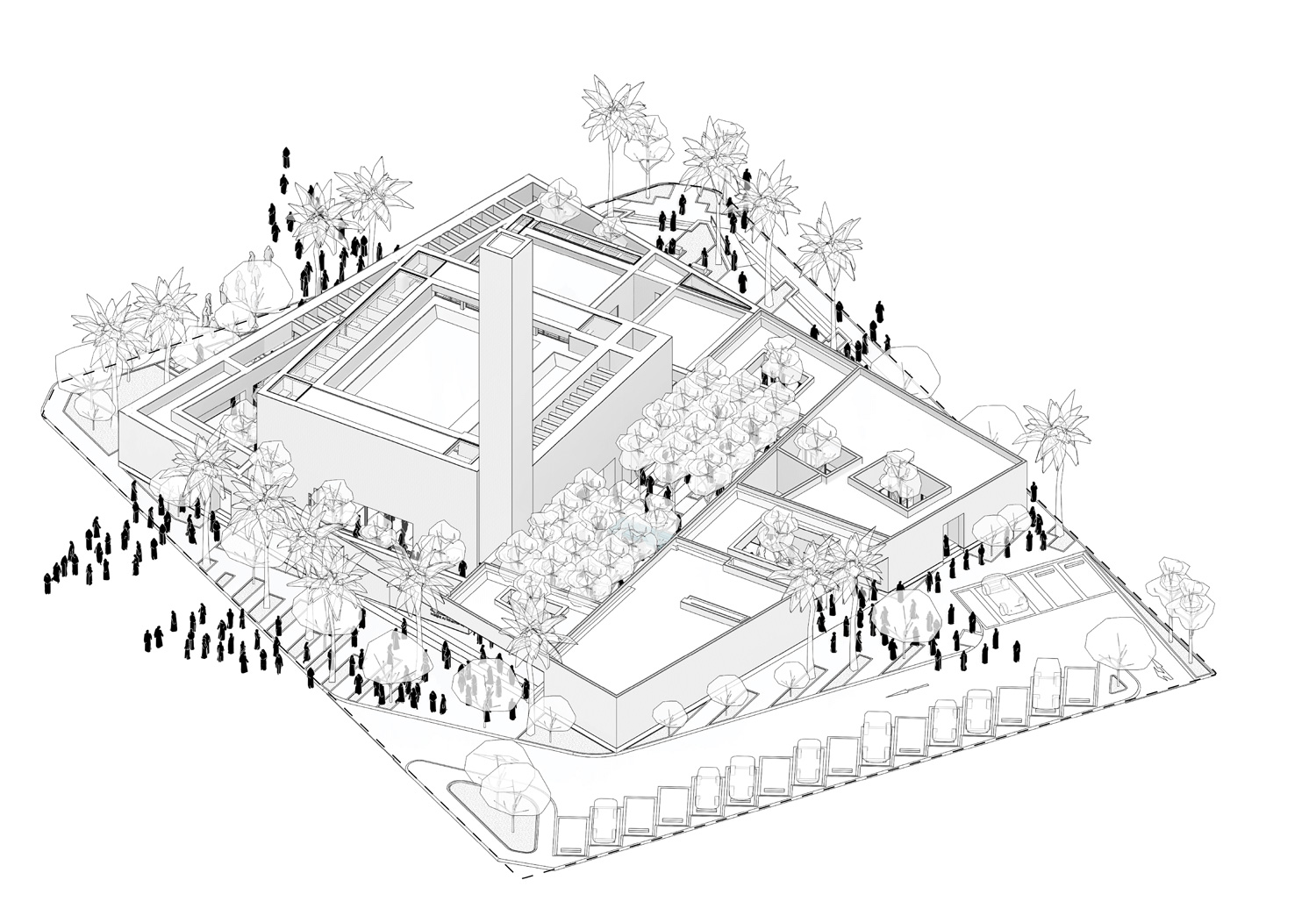 From a distance, the architecture appears solid and heavy; however, it quickly fades during the journey through the mosque’s spaces. The Jami’ appears light and permeable through the surrounding Riwaq as the building is integrated into its urban fabric. Once built and present in the area, the Jami’ will bring a spatial awareness or experience in a broader and perhaps abstract way, even if that space has not materialized, as its persistence overflows beyond its physical boundaries. The formulation of the mosque’s space here is ongoing, as the space is generated based on the needs of its community, whether by connecting its rows beyond its physical boundaries to accommodate the increase in the number of worshippers or even as a garden and public space for the neighborhood. Hence, the mosque’s space here appears flexible—a space that gathers and simultaneously separates. The journey through Jami’s spaces begins by passing through Riwaq, which contains ablution and restroom amenities. The prayer then moves to a central courtyard with a water feature symbolizing purity and cleanliness and a tree garden symbolizing paradise. The prayer then heads to a transitional space between the prayer hall and the central courtyard, which includes benches and shoe racks, preparing prayers to enter the prayer hall. From there, the worshipper moves into the prayer hall, which can extend outside through side courtyards and be accessed from the central courtyard, offering outdoor spaces for worship and contemplation. The Qibla wall, located at the front of the prayer hall, is a solid mass that includes the minbar and the mihrab, allowing natural daylight to pass through the prayer hall. Behind the Qibla wall is a flexible space that provides an area for social gatherings and contemplation throughout the day and shelters workers during breaks.