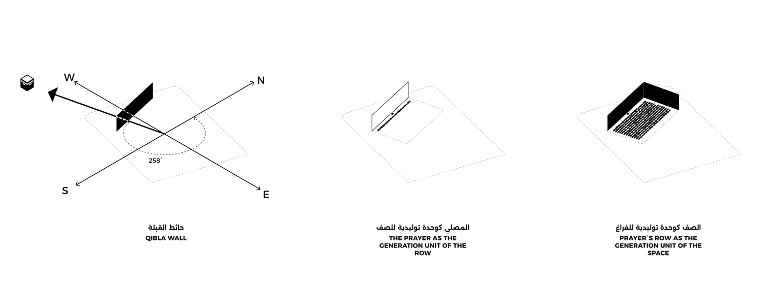A mosque only needs to be identified by its location and does not require a structure in the material sense. The mosque faces the Kaaba through the Qibla wall (the center of the prayers geometry), and worshippers gather to perform prayers by forming rows that create the generative module of the mosque’s space. Accordingly, the real generator of the mosque’s space becomes not the functional space but the function of the space itself. For example, suppose the number of worshipers exceeds the mosque’s capacity. Their rows extend beyond their physical boundaries to accommodate this increase without physically expanding the space. Here, the concept of space extends beyond, as the space becomes expandable and space that makes spaciousness, and the physical structure disappears through the connection of the rows of worshipers outside its boundaries. This is what we can call the space of the mosque.