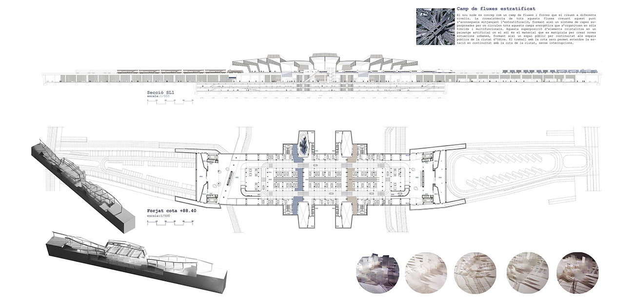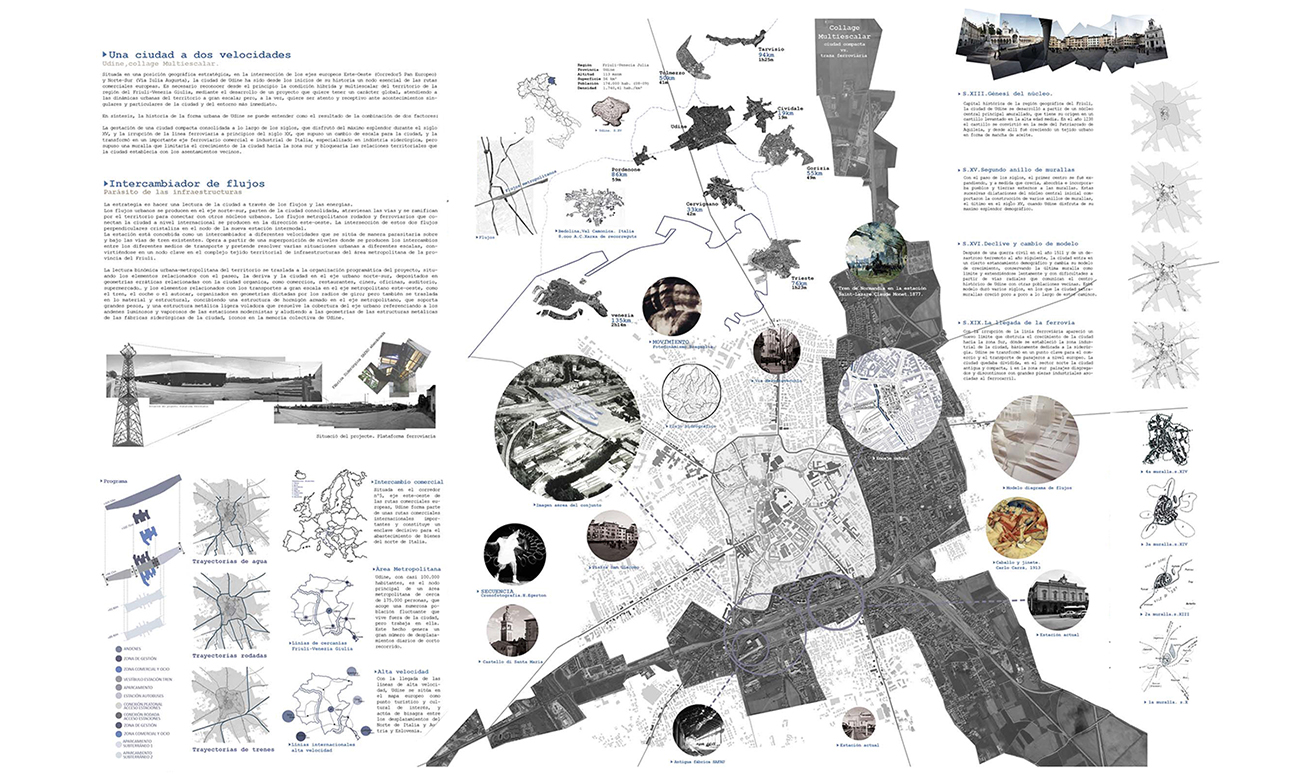 Dos ciudades superpuestas a dos velocidades distintas. Con el paso de los años estas industrias han sido abandonadas. El proyecto plantea replantear la relación entre las dos Udines, valorando la reprogramación de las fábricas abandonadas para abrirlas a la ciudad y planteando una nueva estación intermodal, que debe ser el dispositivo que relacione y dé coherencia a las dos partes de la ciudad que actualmente permanecen aisladas e inconexas por las vías de tren. Se trata de permeabilizar un límite. En un escenario de cambio de modelo energético, las redes de tren van ser elementos clave en el transporte del futuro a corta, media y larga distancia, que van a permitir realizar un uso dilatado del territorio de manera limpia y eficaz, a la vez que sus estaciones, deberían ser núcleos energéticos potentes capaces de generar nuevas sinergias en las ciudades.