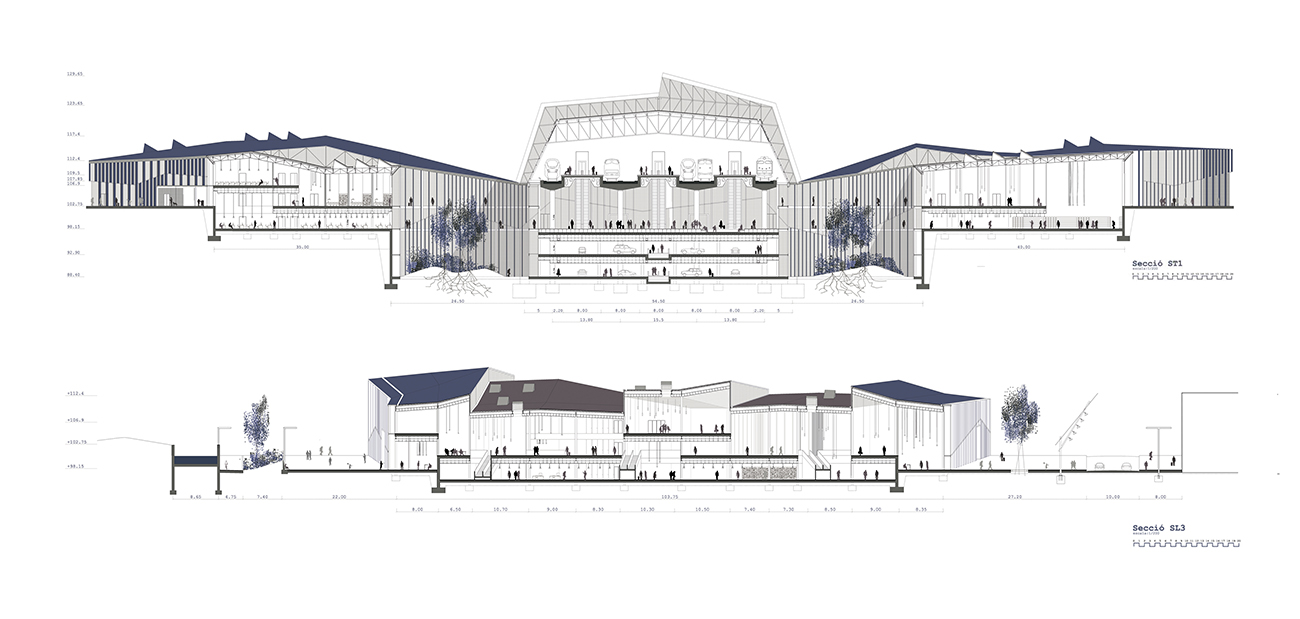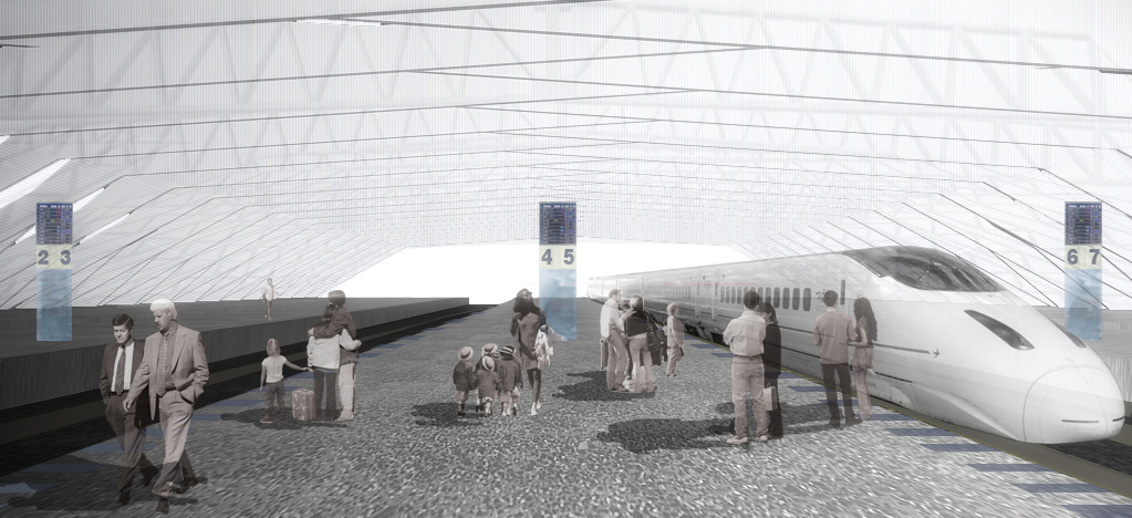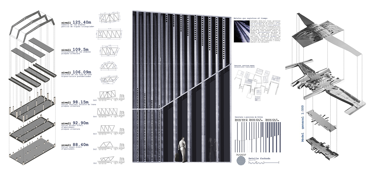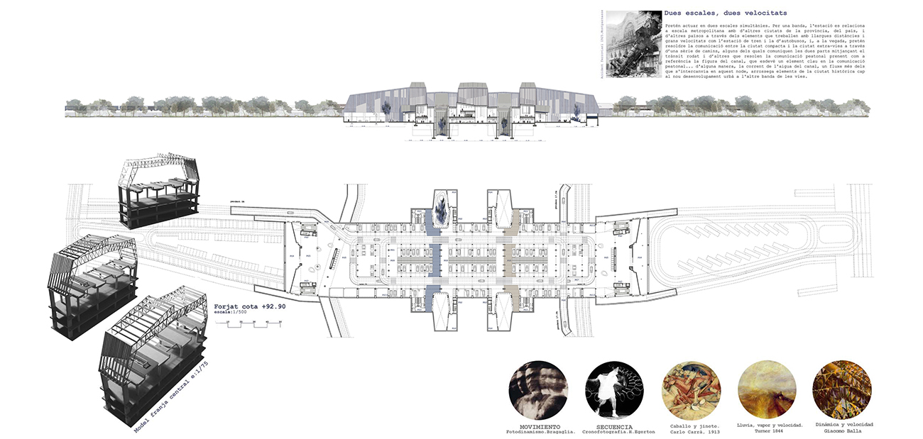 La nueva estación se concibe como un intercambiador de flujos a diferentes velocidades que se sitúa de manera parasitaria sobre y bajo las vías de tren existentes. Opera a partir de una superposición de niveles y plataformas donde se producen los intercambios entre los diferentes medios de transporte y pretende resolver varías situaciones urbanas a diferentes escalas que quiere tener un carácter global, pero al mismo tiempo ser sensible a los acontecimientos particulares del entorno más inmediato. La estrategia es hacer una lectura de la ciudad a través de los flujos y las energías. Los flujos urbanos se producen en el eje norte-sur, son caminos históricos que parten de la ciudad consolidada, atraviesan las vías y se ramifican por el territorio para conectar con otros pueblos de alrededor. Por otro lado, los flujos metropolitanos rodados y ferroviarios que conectan la ciudad a nivel internacional se producen en la dirección este-oeste. La intersección de estos dos flujos perpendiculares cristaliza en el nodo de la nueva estación intermodal.