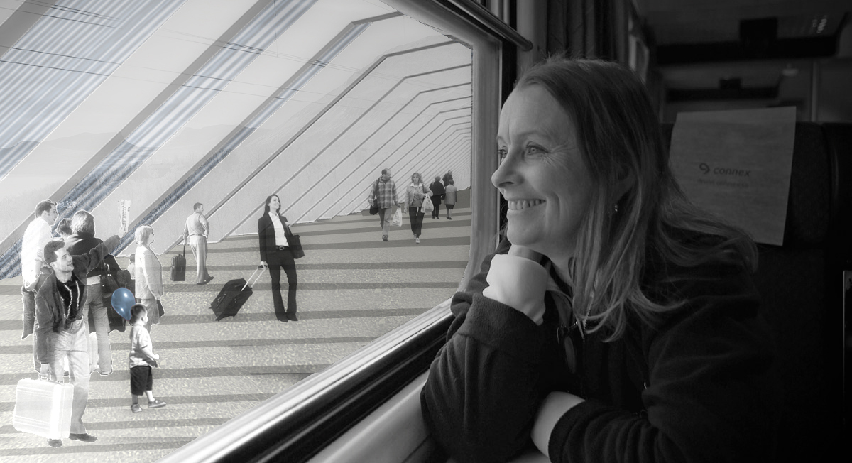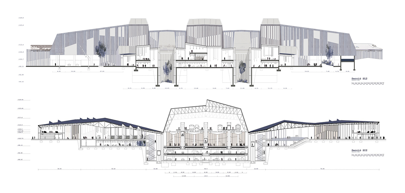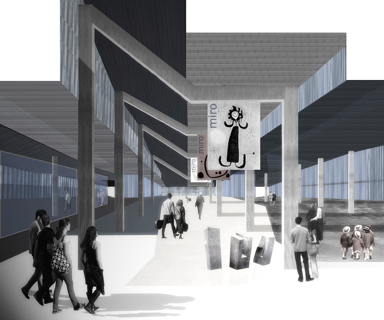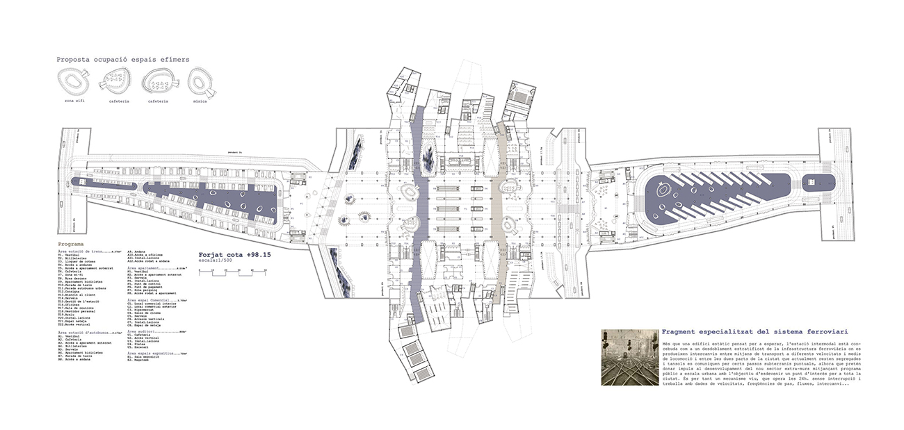 La nueva estación se concibe como un intercambiador de flujos a diferentes velocidades que se sitúa de manera parasitaria sobre y bajo las vías de tren existentes. Opera a partir de una superposición de niveles y plataformas donde se producen los intercambios entre los diferentes medios de transporte y pretende resolver varías situaciones urbanas a diferentes escalas que quiere tener un carácter global, pero al mismo tiempo ser sensible a los acontecimientos particulares del entorno más inmediato. La estrategia es hacer una lectura de la ciudad a través de los flujos y las energías. Los flujos urbanos se producen en el eje norte-sur, son caminos históricos que parten de la ciudad consolidada, atraviesan las vías y se ramifican por el territorio para conectar con otros pueblos de alrededor. Por otro lado, los flujos metropolitanos rodados y ferroviarios que conectan la ciudad a nivel internacional se producen en la dirección este-oeste. La intersección de estos dos flujos perpendiculares cristaliza en el nodo de la nueva estación intermodal.