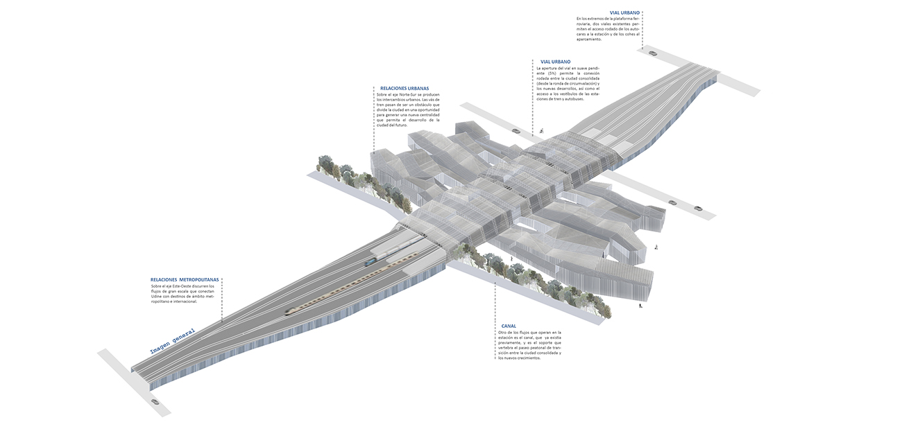 La lectura binómica urbana-metropolitana del territorio se traslada a la organización programática del proyecto, situando los elementos relacionados con el paseo y la ciudad en el eje urbano norte-sur, organizados en geometrías erráticas heredadas del núcleo medieval y renacentista, y los elementos relacionados con los transportes a gran escala en el eje metropolitano este-oeste, como el tren, el coche o el autocar, organizados en geometrías dictadas por los radios de giro; pero también se traslada en lo material y estructural, concibiendo una estructura pesada y compacta de hormigón en el eje metropolitano, y una estructura metálica ligera que resuelve la cobertura del eje urbano, aludiendo a los andenes luminosos y vaporosos de las estaciones modernistas y a las geometrías de las estructuras metálicas de las fábricas siderúrgicas de la ciudad, iconos en la memoria colectiva de Udine.