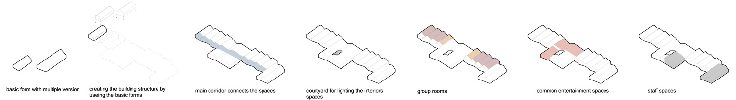 The basic form contains the group room. Each of the small volumes contains one of the required spaces. The bigger shapes contain the bigger functional spaces, and by this the inner functional organization appears on the building shape. It was important, because the surrounding area is heterogeneous, and the new building form was created by using the space structure during the formation process. The inner functional organization is a simple and transparent space structure, which is organized and connected by the main pathway. This corridor connects all the rooms, functions and the entrance hall also. The corridor is become wider in front of the group rooms, let bigger space for the children and staff.