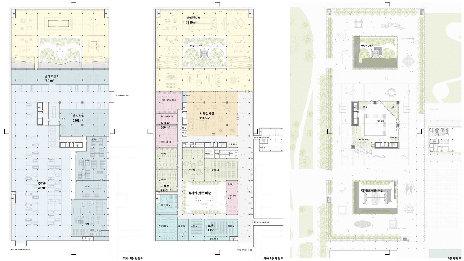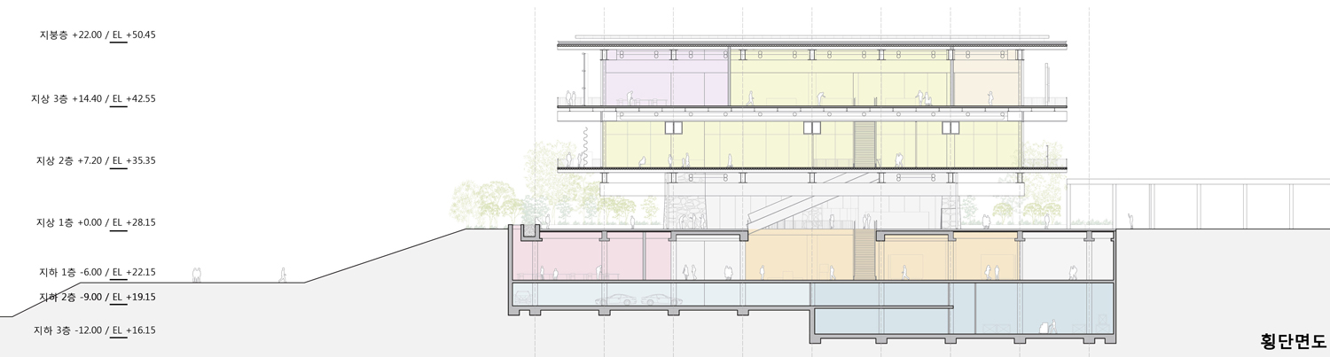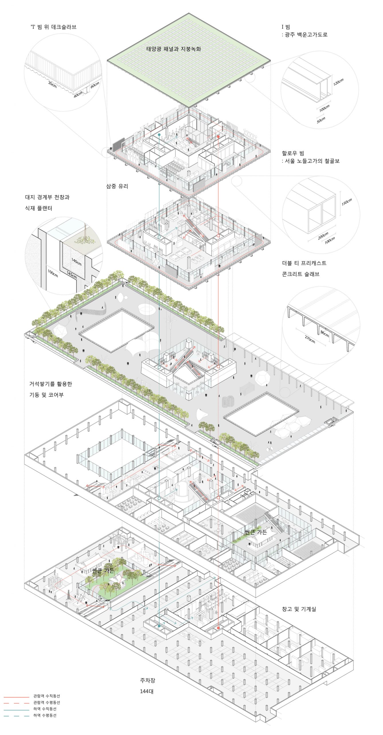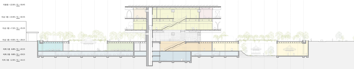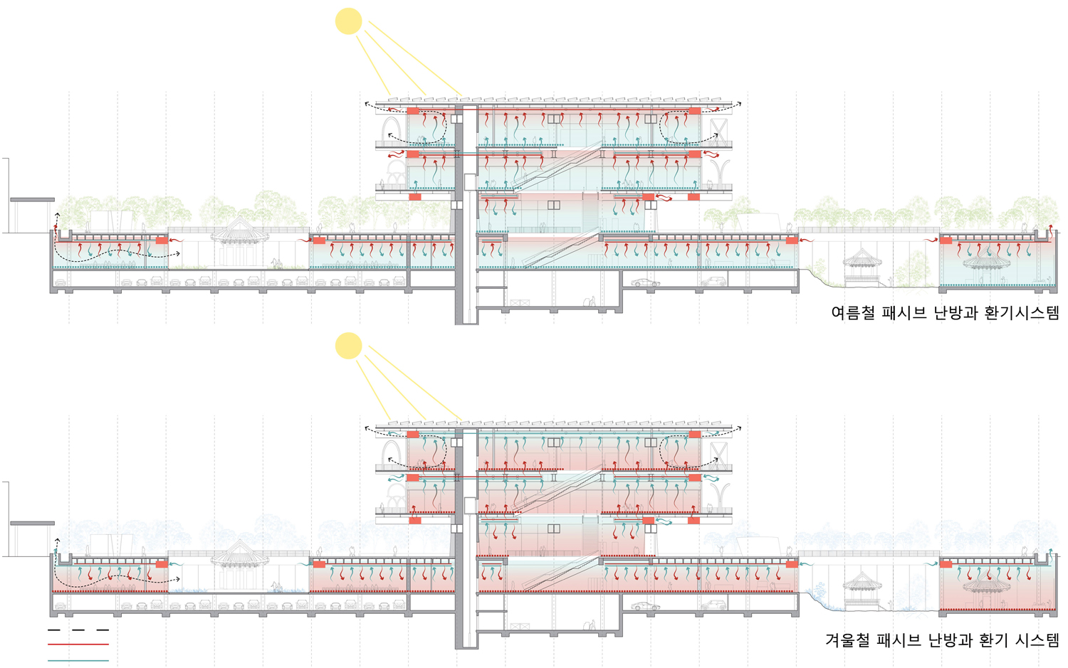 The building’s environmental conditioning systems have been designed to perform mostly through radiation and natural ventilation. When necessary, we will use a decentralized mechanical ventilation system which will not only will be more economic than the customarily centralized air-supply systems, but also more quintessentially “Korean”, in the use of a distributed Variable Refrigerant Flow system to climatize the spaces. A decentralized system will also offer a much safer performance in respect to the management of volatile organic compounds, such as covid-19.