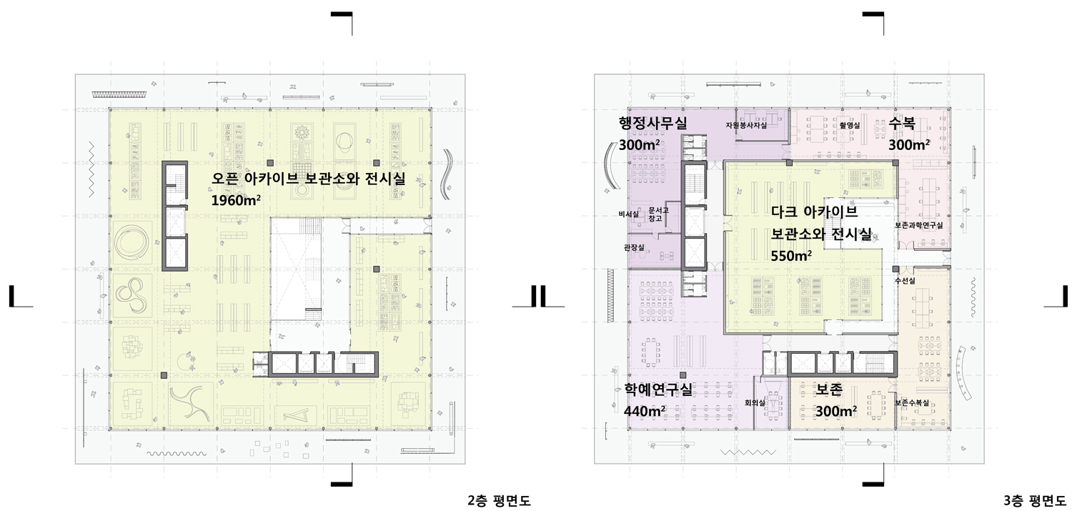 The building provides a generous canopy over the public space as a shield from rain and sun while providing a monumental access to the building. The lobby opens onto a central void linking visually to the temporary galleries and the accessible storage spaces above. Two vertical circulation cores covered with stones from historical Korean fortresses are located around this Piranesian Space.