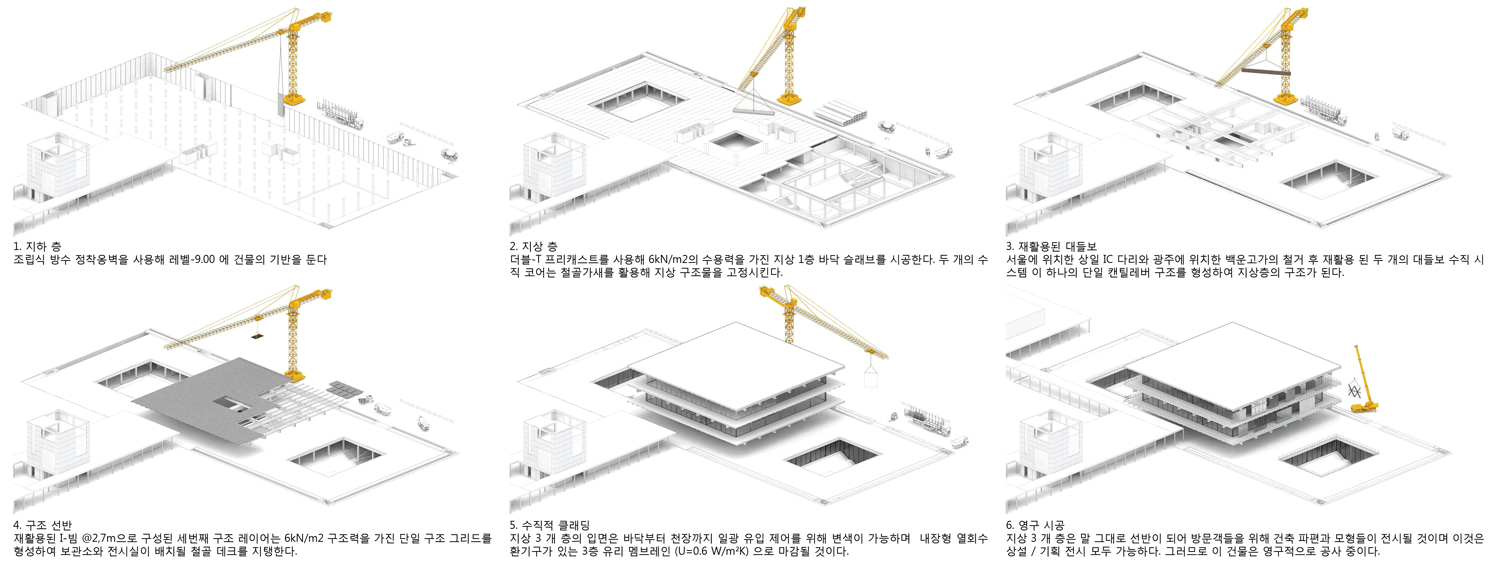 The building construction sequence is structured primarily through a piling sequence of prefabricated elements, which will explicitate the construction by using exclusively dry assembly methods. The KMUA will be a global example of reusing and recycling in the building industry, adopting an anatomic, surgical approach to the detailing of the building where the different elements of the construction will be exposed and systematically detached from each other through dry construction methods, making their assemblage evident, as part of the didactic mission of the project.