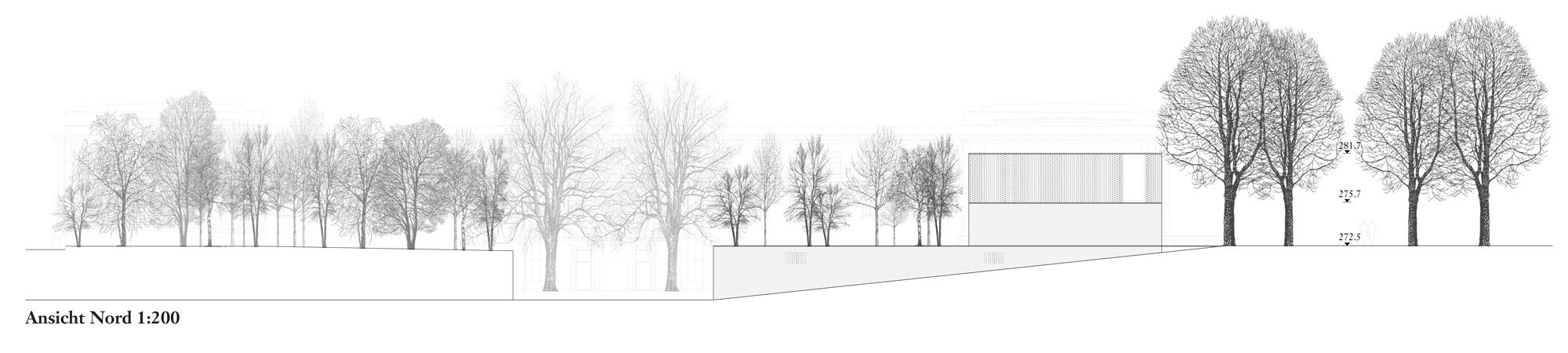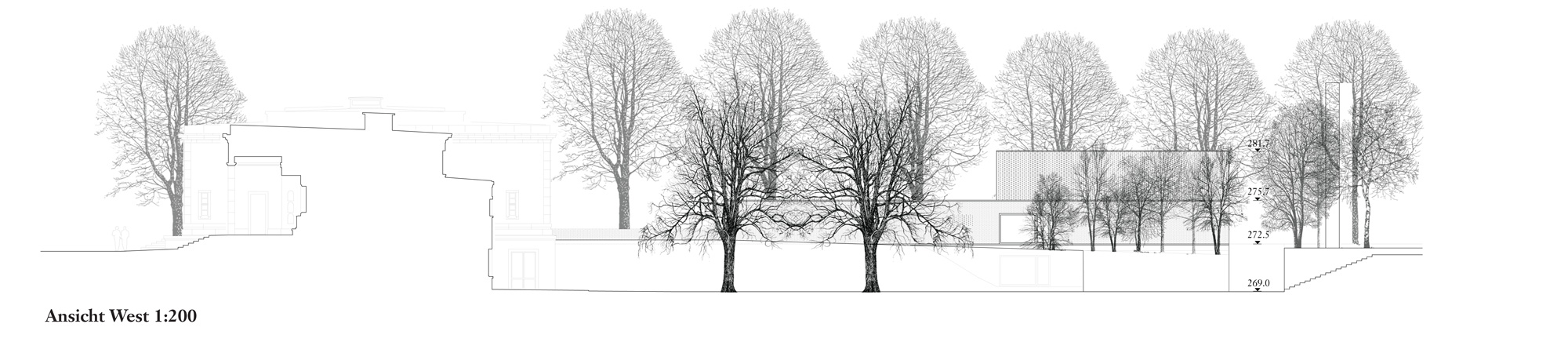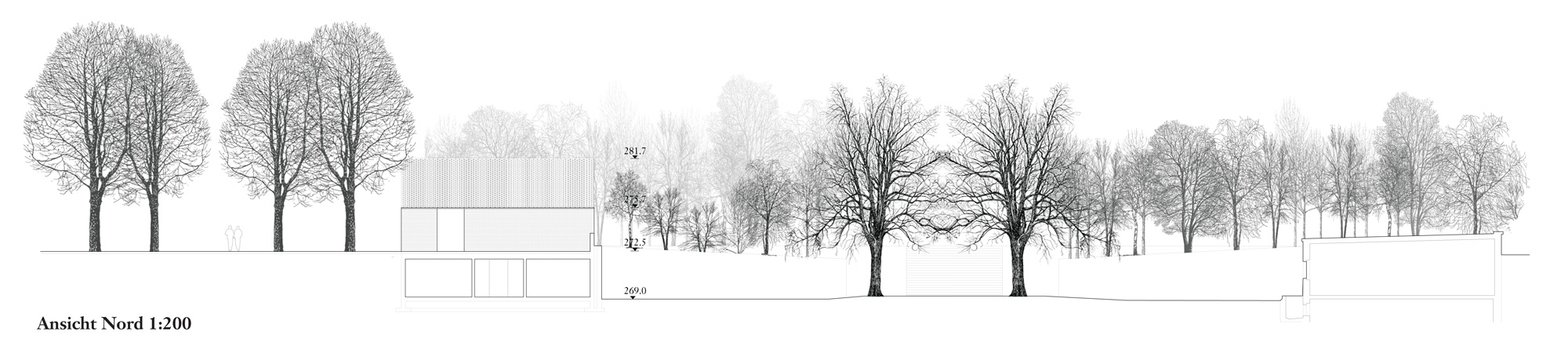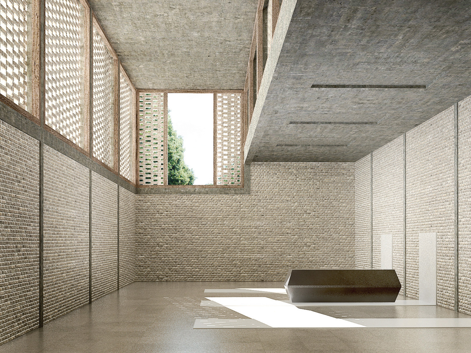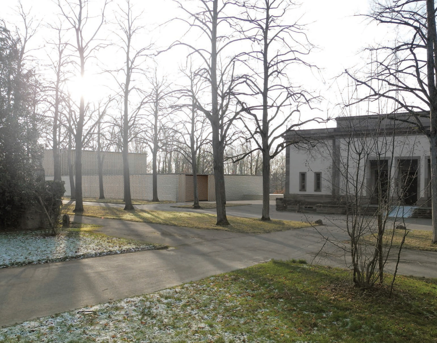 Dass der sarg des Verstorbenen im untergeschoss den gleichen Weg nimmt, ist ein schöner, wenn auch akademischer gedanke. entsprechend dem dramatischen Verlauf der oben beschriebenen raumfolge, sind die Volumen in einer souveränen Folge aufgespannt. Vom sockel des alten gebäudes bis zur spitze des Kamins liegen die dominierenden gebäudeecken alle auf einer linie, auf einem tracé régulateur. Die längsfassade selber gleicht eher einer gartenmauer mit aufgesetztem Körper, schön rhythmisiert durch die davor stehenden alleebäume. der backstein, als tragendes und allgegenwärtiges material, ist eine ganz selbstredende Wahl. ob es dieser helle, vielleicht zu direkt an den schamottstein der brennöfen erinnernde stein sein muss, ist fraglich. zu prüfen wäre allenfalls ein dunkler Klinker, der mit dem grün der anlage harmonisieren würde. Und wenn wir schon beim grün sind, dann wissen auch die Verfasser, dass sich das Flachdach über dem technikraum nicht mit so grossen bäumen bepflanzen lässt. die geforderte Verbindung von Werkhof und allee ist einfach realisiert. die leichte Verschiebung der Wegachse wird in der realität kaum stören.