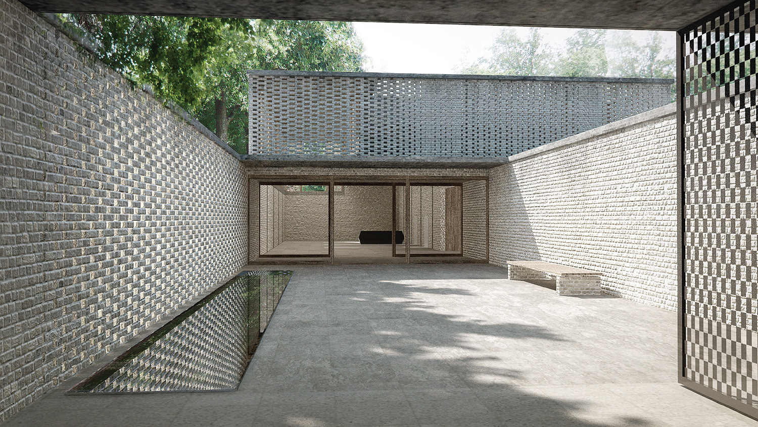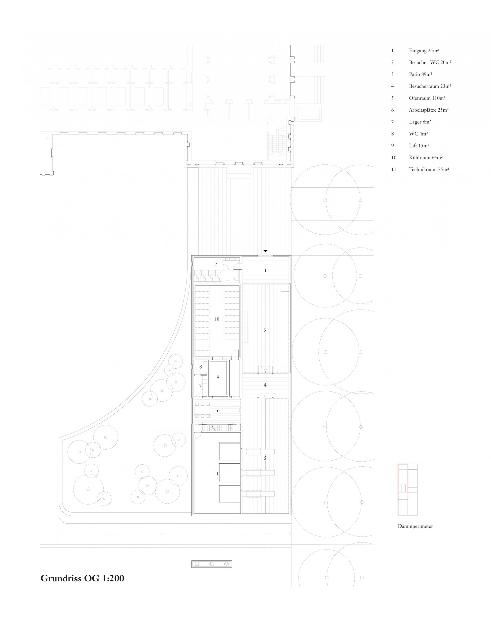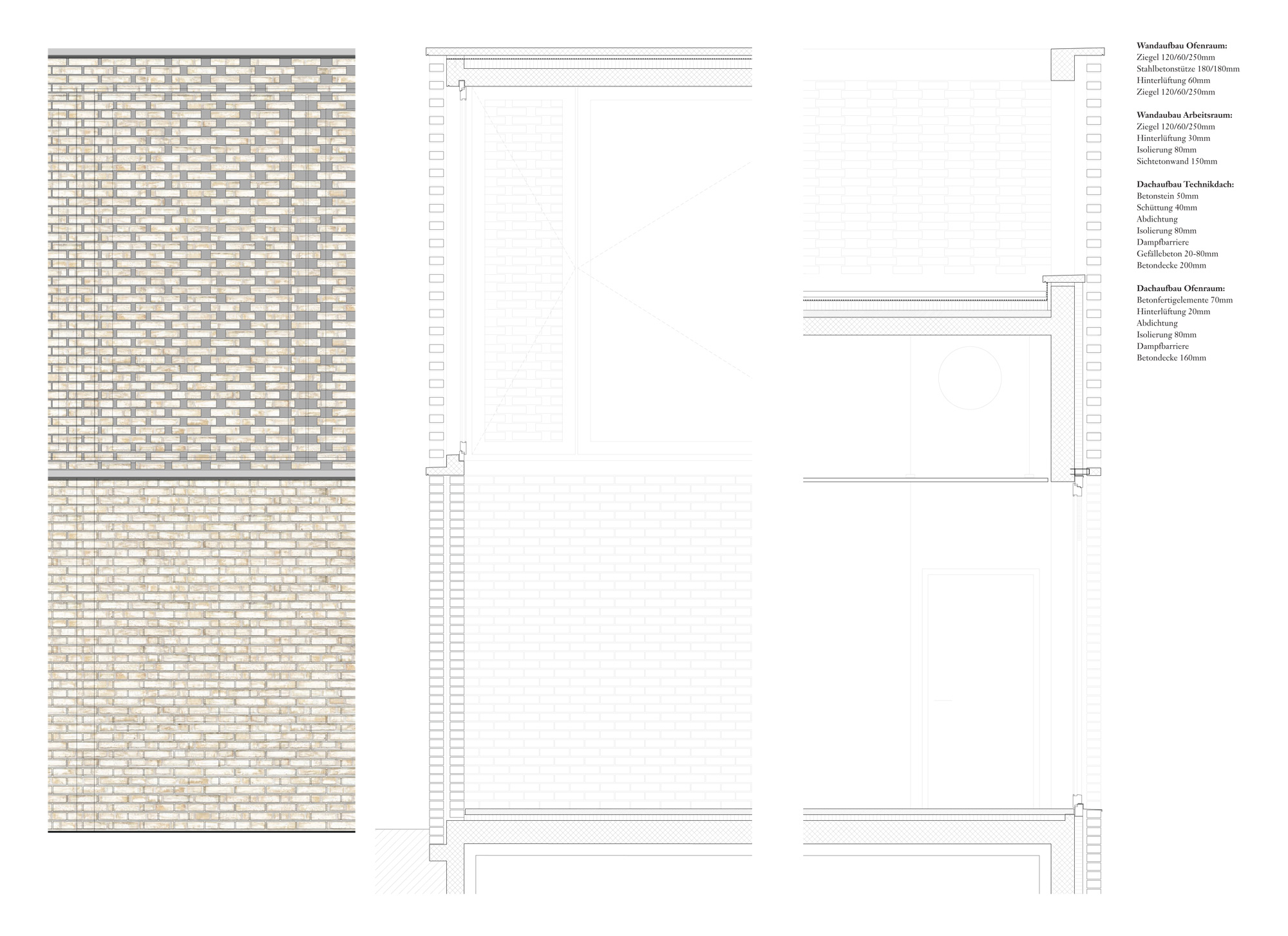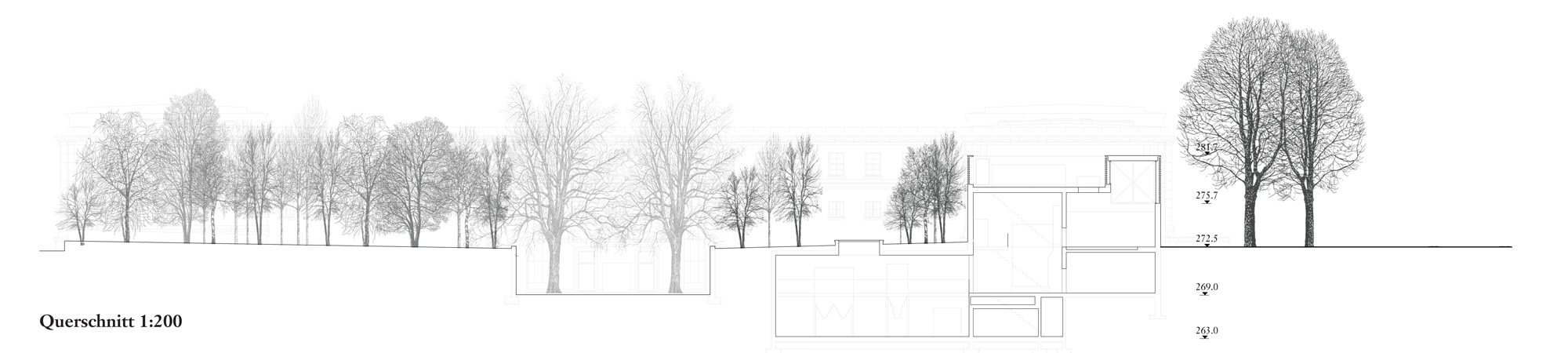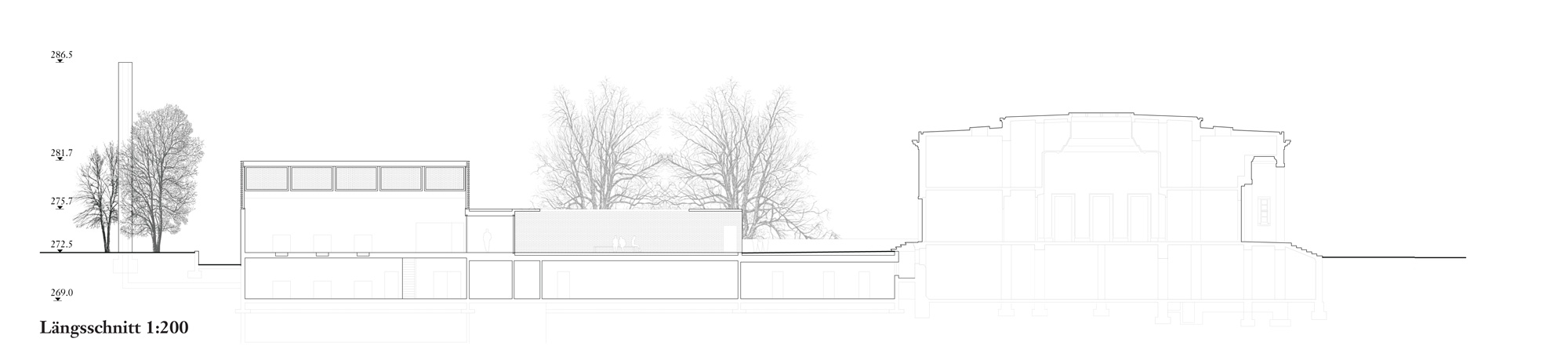 Dass der sarg des Verstorbenen im untergeschoss den gleichen Weg nimmt, ist ein schöner, wenn auch akademischer gedanke. entsprechend dem dramatischen Verlauf der oben beschriebenen raumfolge, sind die Volumen in einer souveränen Folge aufgespannt. Vom sockel des alten gebäudes bis zur spitze des Kamins liegen die dominierenden gebäudeecken alle auf einer linie, auf einem tracé régulateur. Die längsfassade selber gleicht eher einer gartenmauer mit aufgesetztem Körper, schön rhythmisiert durch die davor stehenden alleebäume. der backstein, als tragendes und allgegenwärtiges material, ist eine ganz selbstredende Wahl. ob es dieser helle, vielleicht zu direkt an den schamottstein der brennöfen erinnernde stein sein muss, ist fraglich. zu prüfen wäre allenfalls ein dunkler Klinker, der mit dem grün der anlage harmonisieren würde. Und wenn wir schon beim grün sind, dann wissen auch die Verfasser, dass sich das Flachdach über dem technikraum nicht mit so grossen bäumen bepflanzen lässt. die geforderte Verbindung von Werkhof und allee ist einfach realisiert. die leichte Verschiebung der Wegachse wird in der realität kaum stören.