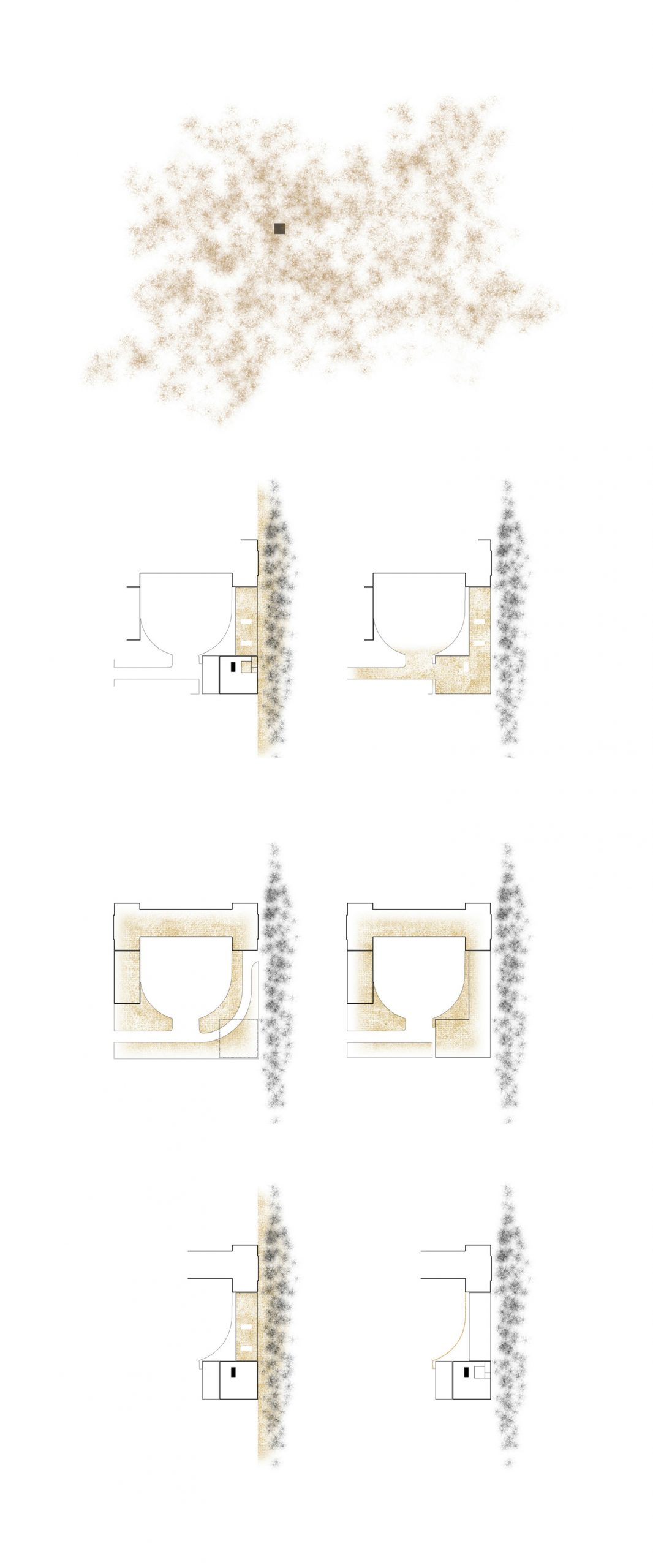 The Building Department of the Canton of Basel, Switzerland has conducted an architectural competition for the construction of a new crematorium in the Hörnli cemetery. This extension project responds on the one hand to the intention of respecting the identity of the protected existing building by leaving a distance, in appearance, at the upper street level without disturbing it and on the other hand to the intention of establishing a void between them, a “door space”. This “empty-built” space between the two buildings, the existing one and the new one, becomes the entry square because of their connection in the underground level. In this way the new building appears as an independent and representative piece, isolated among the trees. The covering material, polished black concrete, allows the trees’ girths and shadows be “tattooed” into the building skin, putting it into context. It pretends to be an elegant and sober architecture that responds to the demanded multicultural character. The new building also generates a distance and a dialogue with the protected curved wall that becomes the down level base.
