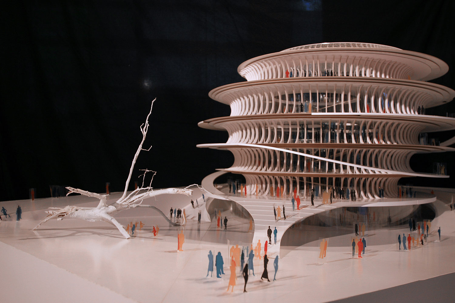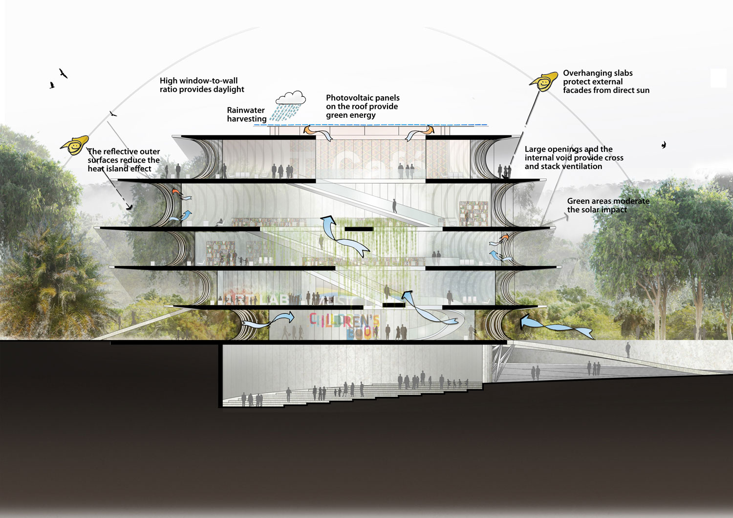 ☉ Kwame Nkrumah National Library is a proposal by Mario Cucinella Architects designed in 2013. It is located in Akosombo Ghana in a forest setting. Its scale is medium with a surface of 4.600 sqm. Key materials are glass and wood. collaborated as visualizer. Concepts such as atrium ramp and zenithal light are explored.