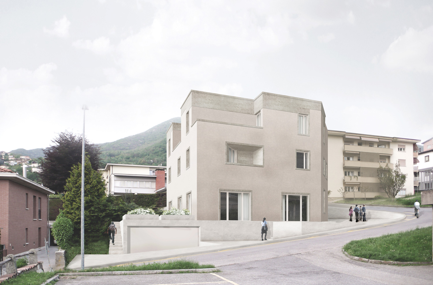 On the second floor are developed 3 atelier and a little space for a kitchen, related to the terrace. Takes place also a massage room and toilette for ladies, gents and disabled. On the second floor we thought 3 apartments for young guy, each one has its bathroom, living room, bedroom and one little kitchen. We decide to create a terrace for each apartment giving to the tenants the possibility to stay out and observ the nice south landscape on the roof of the old Nucleo di Mendrisio. The building has a clear perimetral structure made by concrete, linked to the slab, also in concrete. The expression of fassade is quiet simple, made in plaster and wood frame for windows; Just as a conclusion for the roof we thought precast concrete elements that marks the end of the tower.