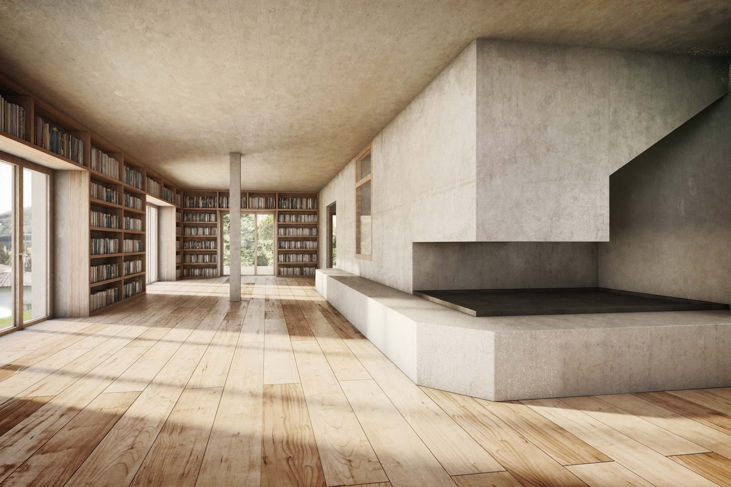 The ground floor allows public function which are a library, a tea room, an office and a reading room. We gave some importance to the vertical circulation which cross the building generating relations between levels and permitting to have a sense of spatial unity. It becames sculptural going in the reading room space and becoming the covering for the chimney. Linked to the inside space of the library takes place an outside terrace which is also the covering of the garage placed on the basement floor. On the groundfloor, structural walls surrounds an external secret garden where young guy can work during summer or organize expositions or happenings.