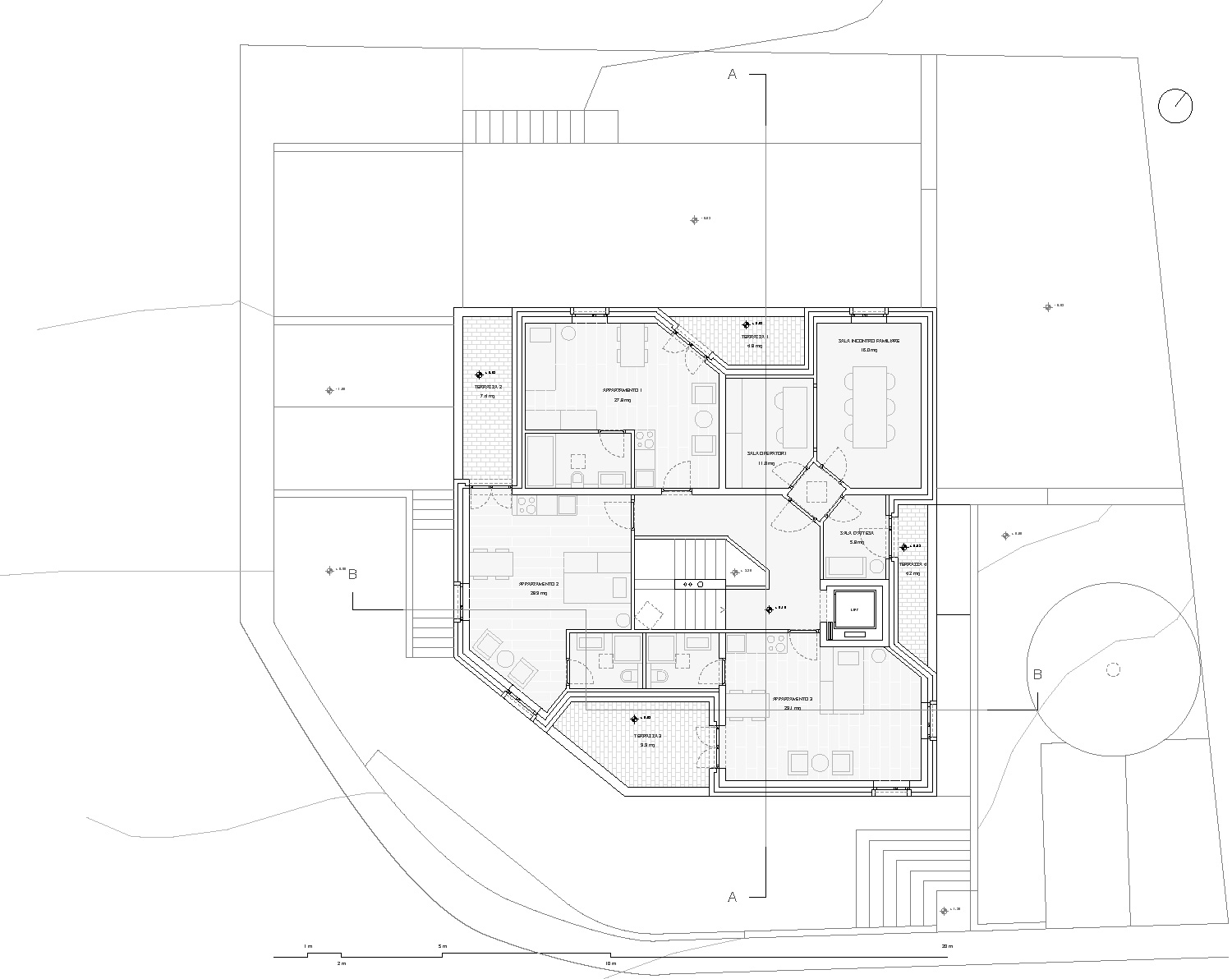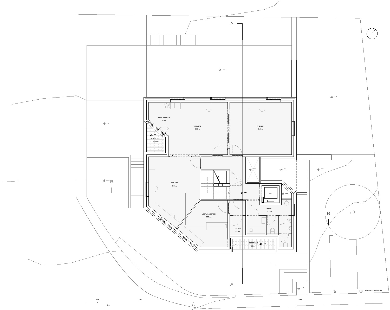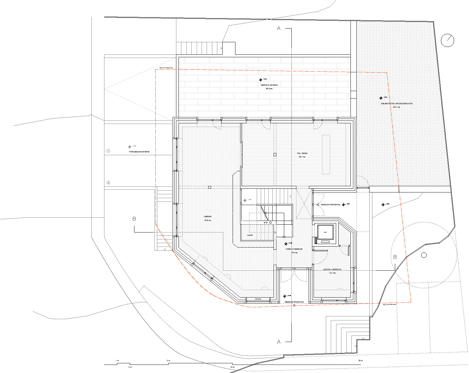 The buiding we thought It’s a space where young person who have familiar problems can live and learn a job before moving to be indipendent. The new house has three levels upper ground and one level underground which has technical and parking function. Clients asked a ‘ tower building ‘ but the program and also buildin laws do not allow more then 10.60 meters high. For this reason we decided to put the new tower on the highest point on the site, using the basement of the underground parking space as an extra level, able to slender the house, placed on it. Structurally, the building is placed on the wall and pillars of the parking. To increase the sense of verticality, we decided to create some different terraces on each level and especially on the second ( and last ) level where the volume is broken by the rhythm of the terraces.