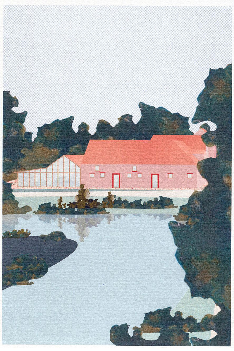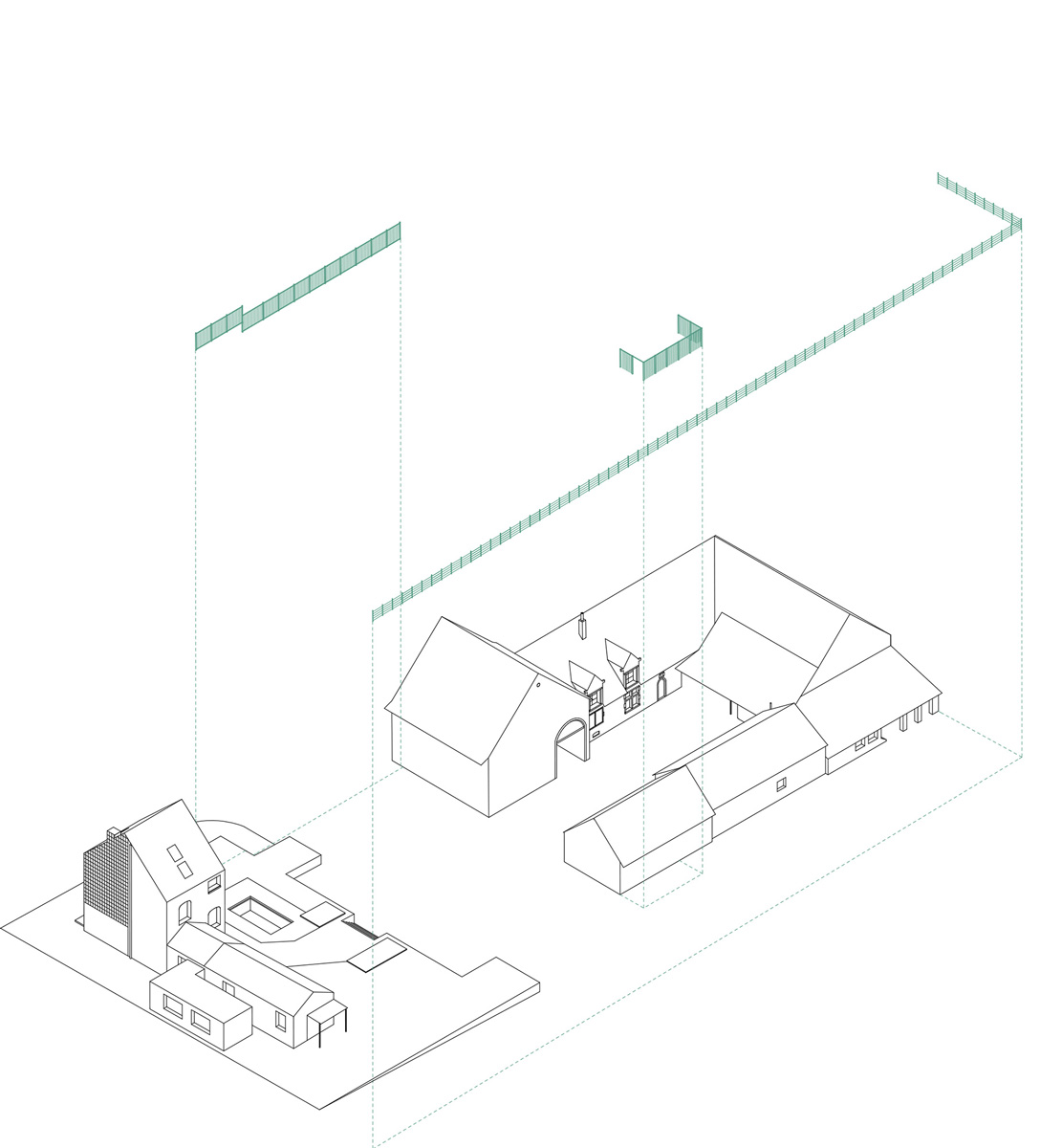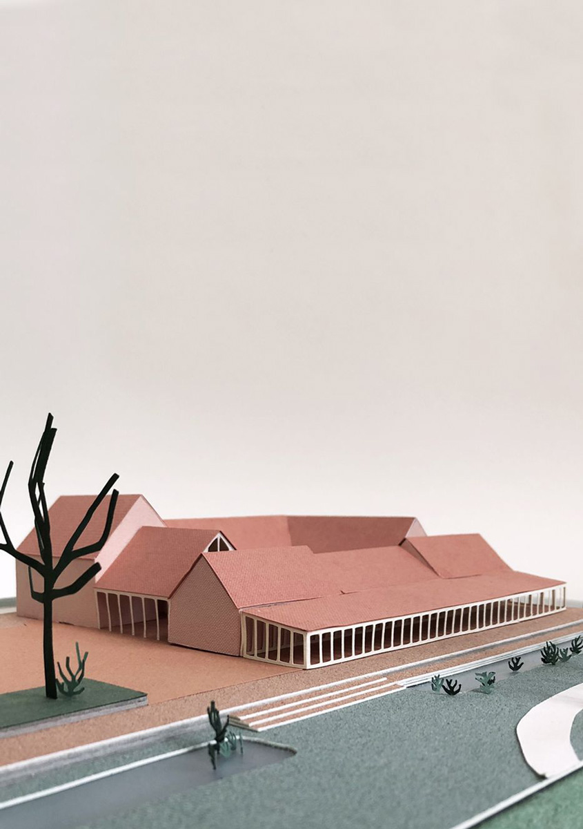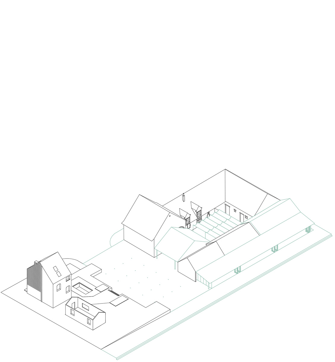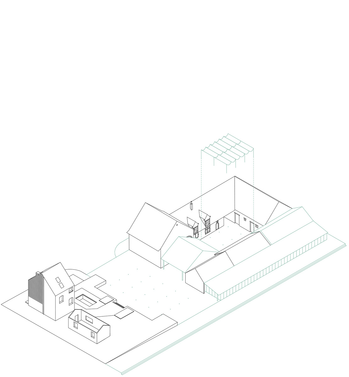 The pond, the trees, the fields. The children ride the horse around the pond, someone walks slowly, watching the reflections of the leaves in the water. If you are silent, you can hear the birds calling, and towards evening, the crickets sing. And nearby, some buildings remind us that we are at home, we are in Brussels. Shades of red and pink. The old bricks of the farm; the new roofs of the farm; the square and the courtyard. The soil is made with the old roofs of the farm: the old tiles have colored the soil with a red gravel on the outside, and a smooth and shiny cocciopesto on the inside. Everything is still here at the farm. Everything is so similar. Yet, everything is so different. Different shades of wood from different ages. The porch has new wooden columns and beams. From there, it is possible to see the old wooden beams of the barn.