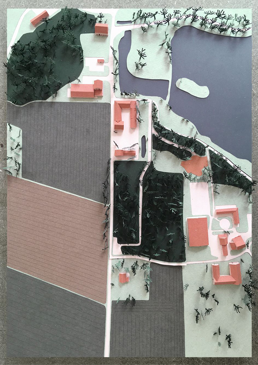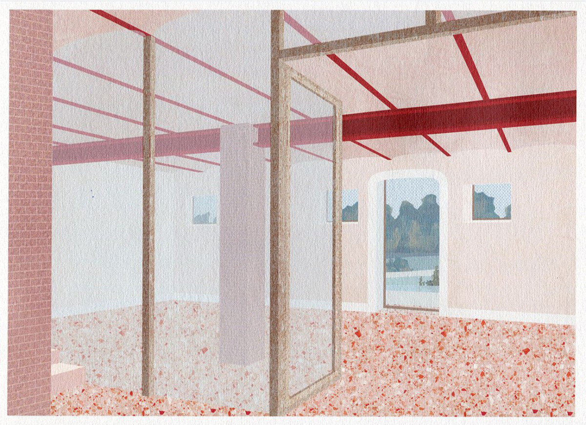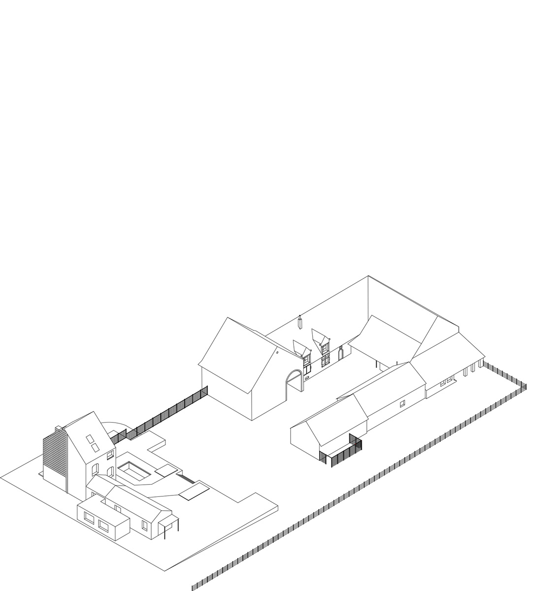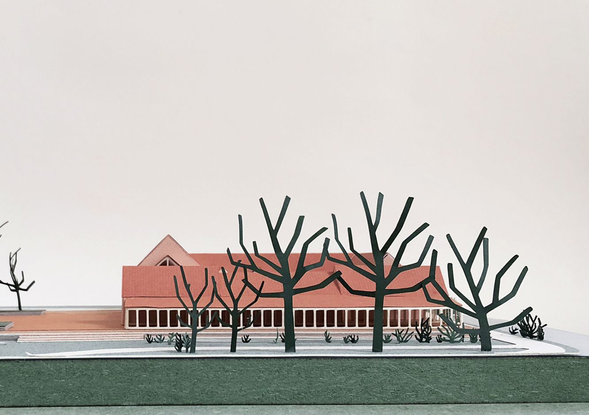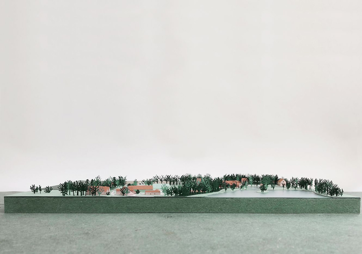 The pond, the trees, the fields. The children ride the horse around the pond, someone walks slowly, watching the reflections of the leaves in the water. If you are silent, you can hear the birds calling, and towards evening, the crickets sing. And nearby, some buildings remind us that we are at home, we are in Brussels. Shades of red and pink. The old bricks of the farm; the new roofs of the farm; the square and the courtyard. The soil is made with the old roofs of the farm: the old tiles have colored the soil with a red gravel on the outside, and a smooth and shiny cocciopesto on the inside. Everything is still here at the farm. Everything is so similar. Yet, everything is so different. Different shades of wood from different ages. The porch has new wooden columns and beams. From there, it is possible to see the old wooden beams of the barn.
