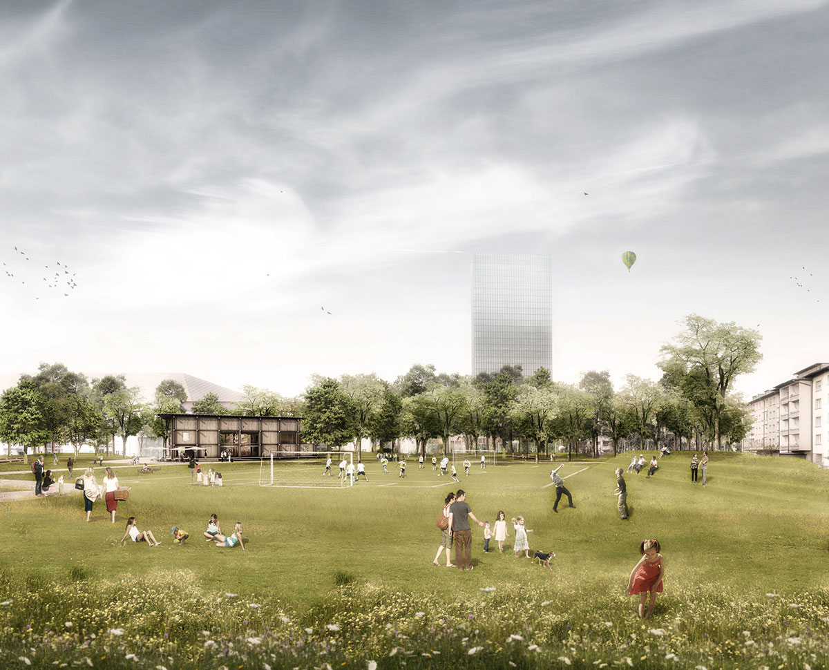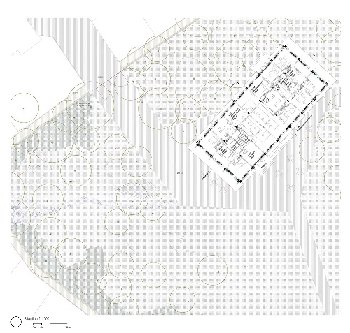 Das Haus basiert auf einer ebenso einfachen als auch logischen Grundstruktur aus Holz. Die Wahl einer Holzstruktur schafft eine klare Abgrenzung zu den grossmassstäblichen Messebauten aus Stahl und fügt sich selbstverständlich in den Landhof ein. Das neue Haus ist ein schmaler und langgezogene Körper, eine archaische und begehbare Struktur, die spielerisch und atmosphärisch auf den Ort und die Nutzer eingeht. Das Gebäude ist ein System bestehend aus einer festen Struktur aus Träger und Ständer, und beweglichen dazwischen liegenden Feldern. Durch Bewegen einzelner Teile durchläuft die Struktur Verwandlungen abgestimmt auf tages-, jahreszeitliche und klimatische Verhältnisse. Die verstellbaren Wandfelder können so den jeweiligen Bedürfnissen nach Austausch, Veränderung und Intimität entsprechend in unterschiedliche Positionen gebracht werden. Dabei wird die Gestalt verändert und steht im stetigen Wechsel.