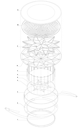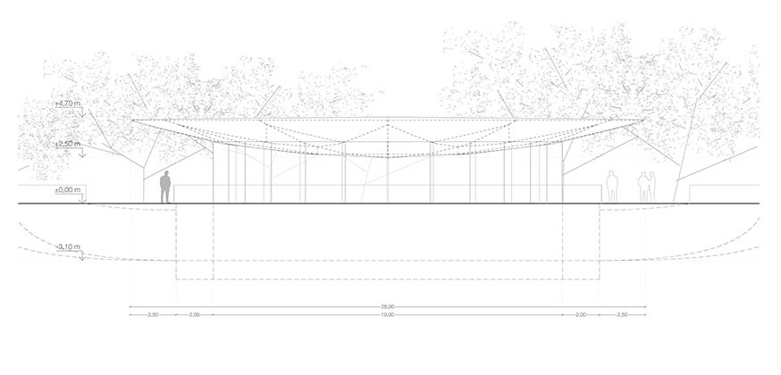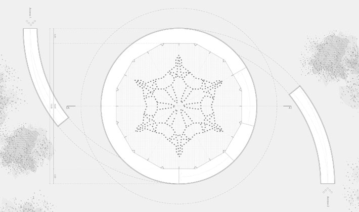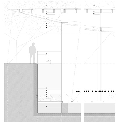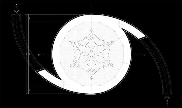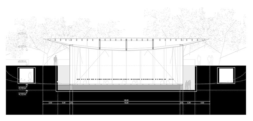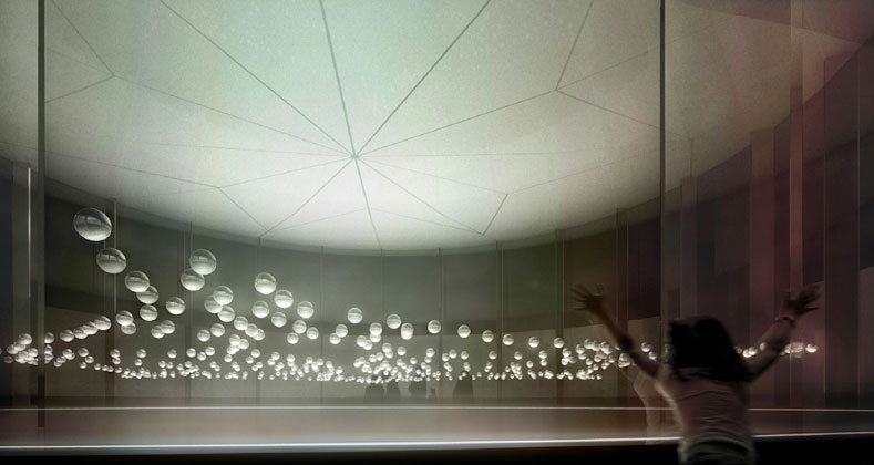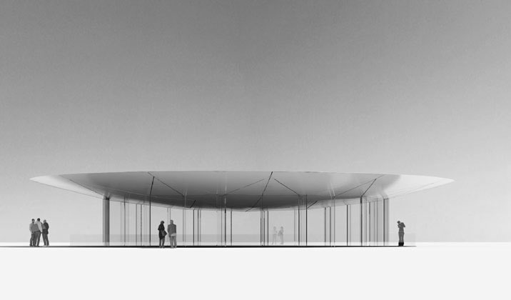 El “Pabellón Levitaciones” alojará la instalación de la obra homónima de la artista Mónica Fuster. La pieza en cuestión consiste en un conjunto de esferas metálicas que forman una figura de 16 m de diámetro gravitando a 1 metro de altura gracias al campo magnético creado por un equipo oculto bajo el pavimento. Por su constitución técnica y también por su propio carácter mágico, la pieza debe permanecer confinada en un espacio no accesible pero ofreciendo la máxima visibilidad y liviandad gracias a una arquitectura a la que se impone la desaparición en el momento de la visión de la obra de arte. El proyecto se concibe como una cubierta en forma de patena que descansa sobre un cerramiento cilíndrico de planos y costillas de vidrio que aparece enigmáticamente en el paisaje. Si nos acercamos, descubrimos desde la barandilla perimetral que el suelo del pabellón está unos metros más abajo, rodeado por un foso aparentemente infranqueable. Pronto se descubre que desandando los últimos metros, un túnel de traza curvada nos deposita en la directriz tangente del pasillo que rodea el espacio vidriado descubriendo la enigmática figura en suspensión. Pasear en círculo este corredor, experimentar los diferentes reflejos emitidos por la cubierta pulida, emocionarse con la pérdida de referencias, explorar otro eco, otra luminosidad acompañando un fenómeno que se produce ante nuestros ojos y que quedará allí impasible también cuando nos hayamos ido, es el objetivo de esta construcción elemental. En ella se recogen las inquietudes más primigenias de la arquitectura: proteger, dialogar con la naturaleza y proporcionar una serie de experiencias espaciales que gravarán la memoria de sus visitantes.