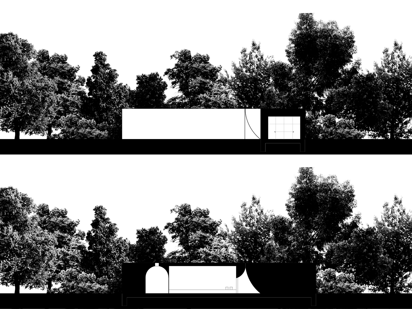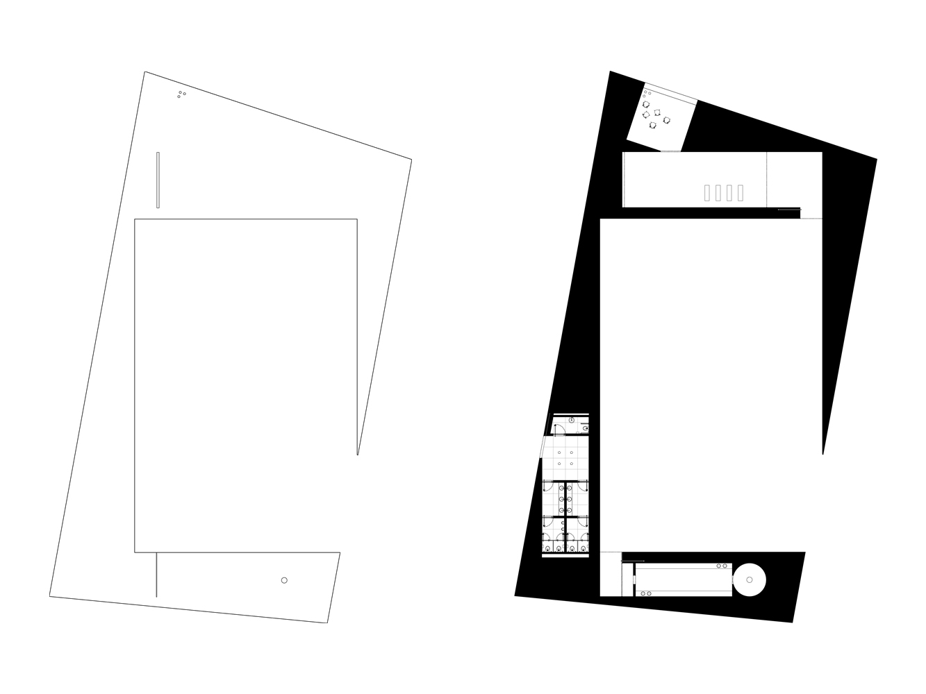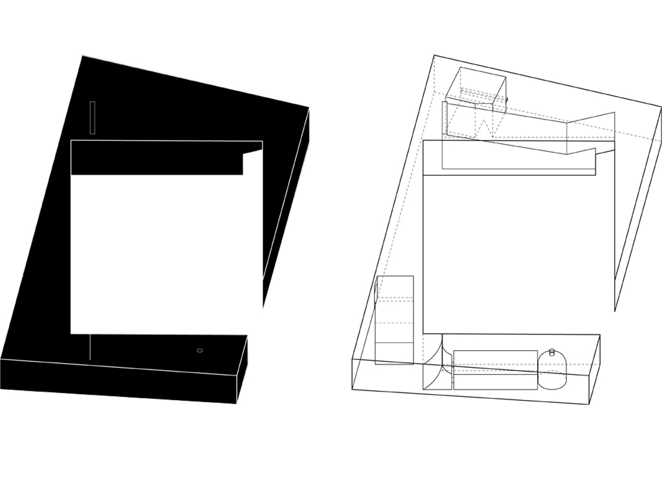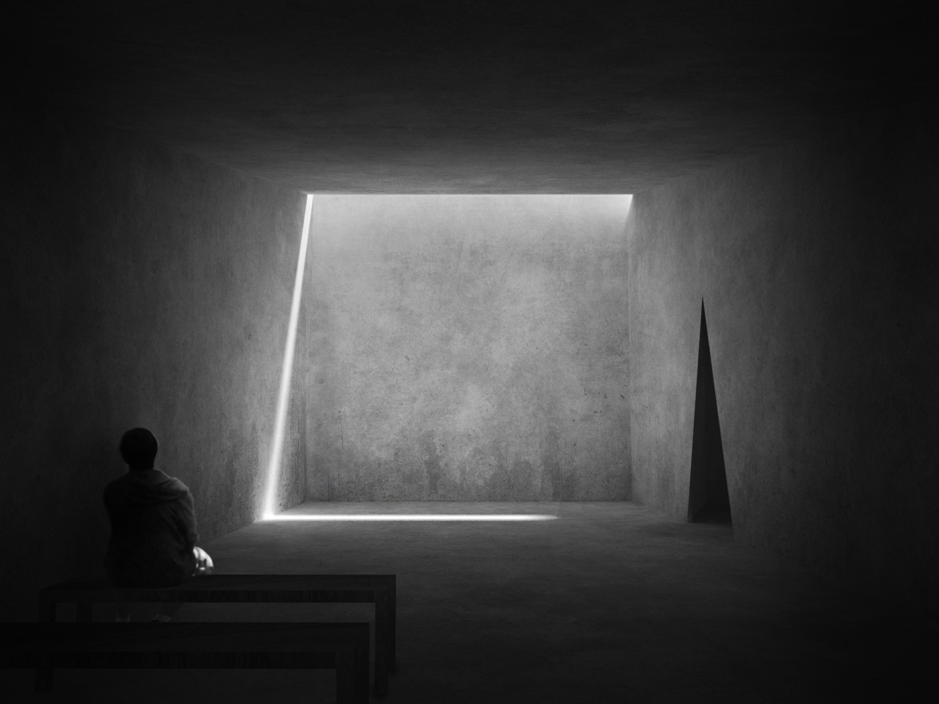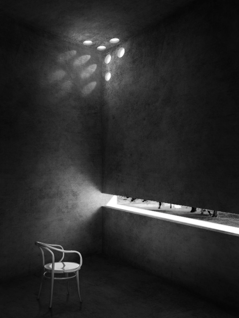 The entry to this space is made through a very low area, conceived to the man scale, where you can feel that dominate the space, as well as observe your own shadows, but then you move forward and leave your shadows and ghosts behind and at this moment the space opens toward a skylight pointing to the sky, and here you can finally rest without any distraction, just contemplating a natural light beam. Adjacent to this space there is a small room for contemplation accessed by a triangular passage that leads us to the city’s iconic rooftops. This room has panoramic view that is displayed through a long and slim window which only transmits this to whoever is sitting, providing the space to be lived in a slow and quiet way and not with the hustle and bustle of those potentially found standing.