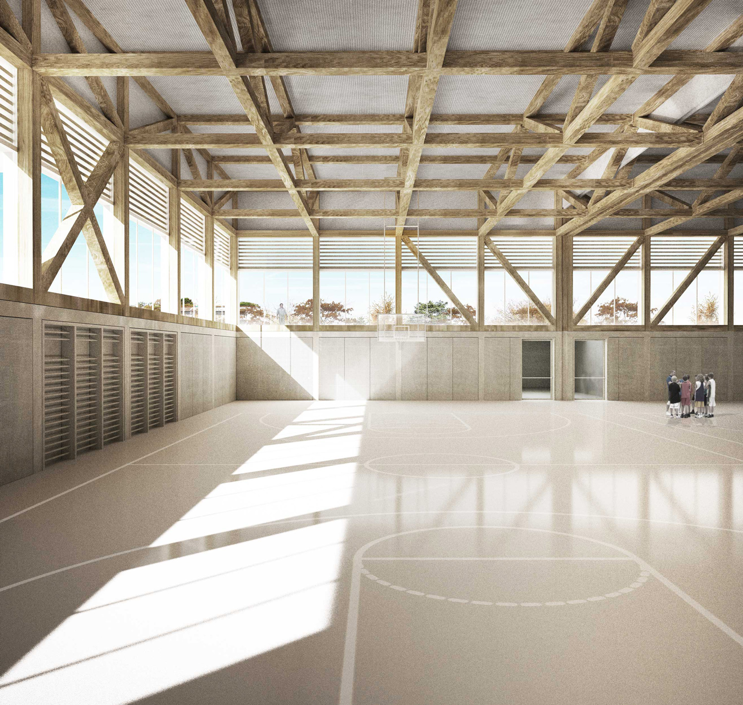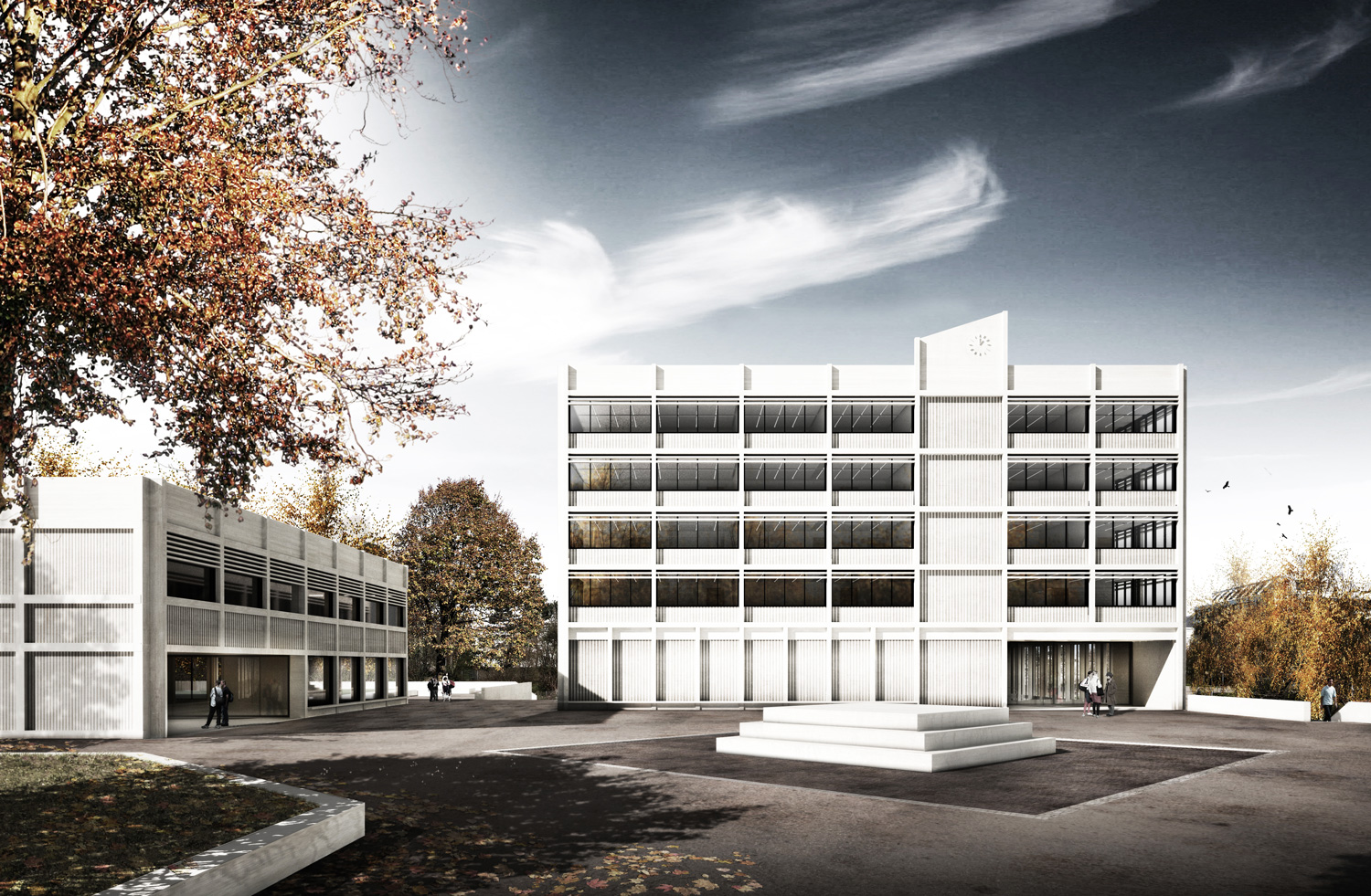 The scale of the new buildings is in harmony with nearby industrial and manufacturing buildings. Design elements and principles from the existing school and its surroundings have been adopted, adapted and freshly interpreted. The two forms thus appear as concrete buildings. Inside, the supporting structure of the school building is constructed as a reinforced concrete skeleton. For reasons of economy the sports hall’s supporting system is realised as a timber frame.