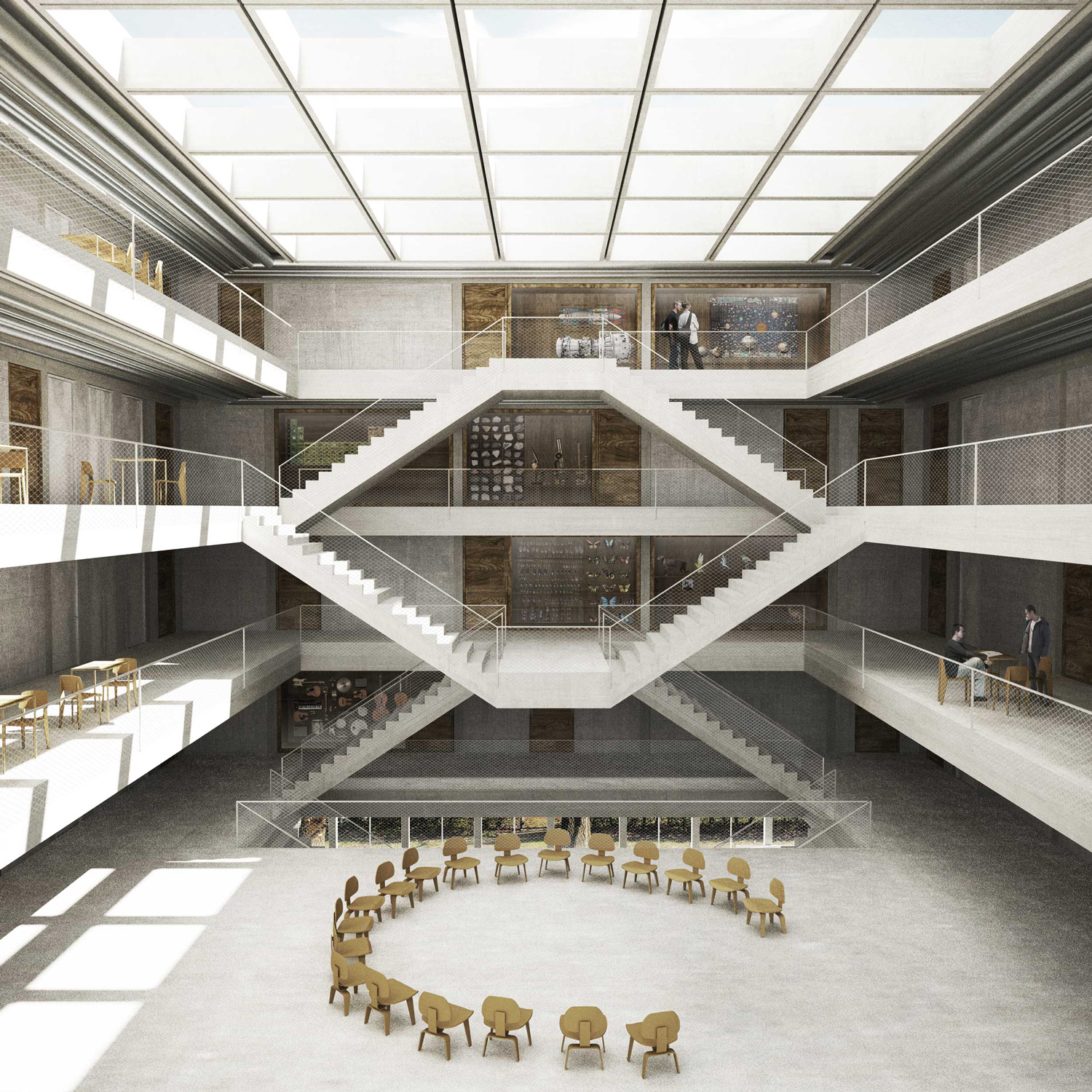 The teaching section that lies over the lecture theatre in the head building is organised on the four upper storeys as rings around an atrium with the central main staircase. Each storey is dedicated simply and logically to a subject. The staircase is divided into two zones, like the building sections: in the lower section, in combination with the different levels at ground storey level, the staircase is designed as a rest area and spatially connects both access levels. On the teaching levels, double flights of steps lead to vitrines where objects from the collection rooms are exhibited.