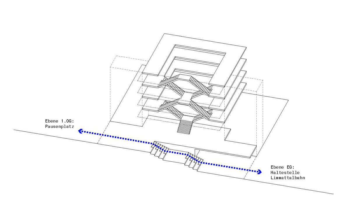 The public part of the school building beside the Limmattalbahn station, with the lecture theatre, connects the sportsfield level and the level of the higher placed school yard in front of the existing canteen.