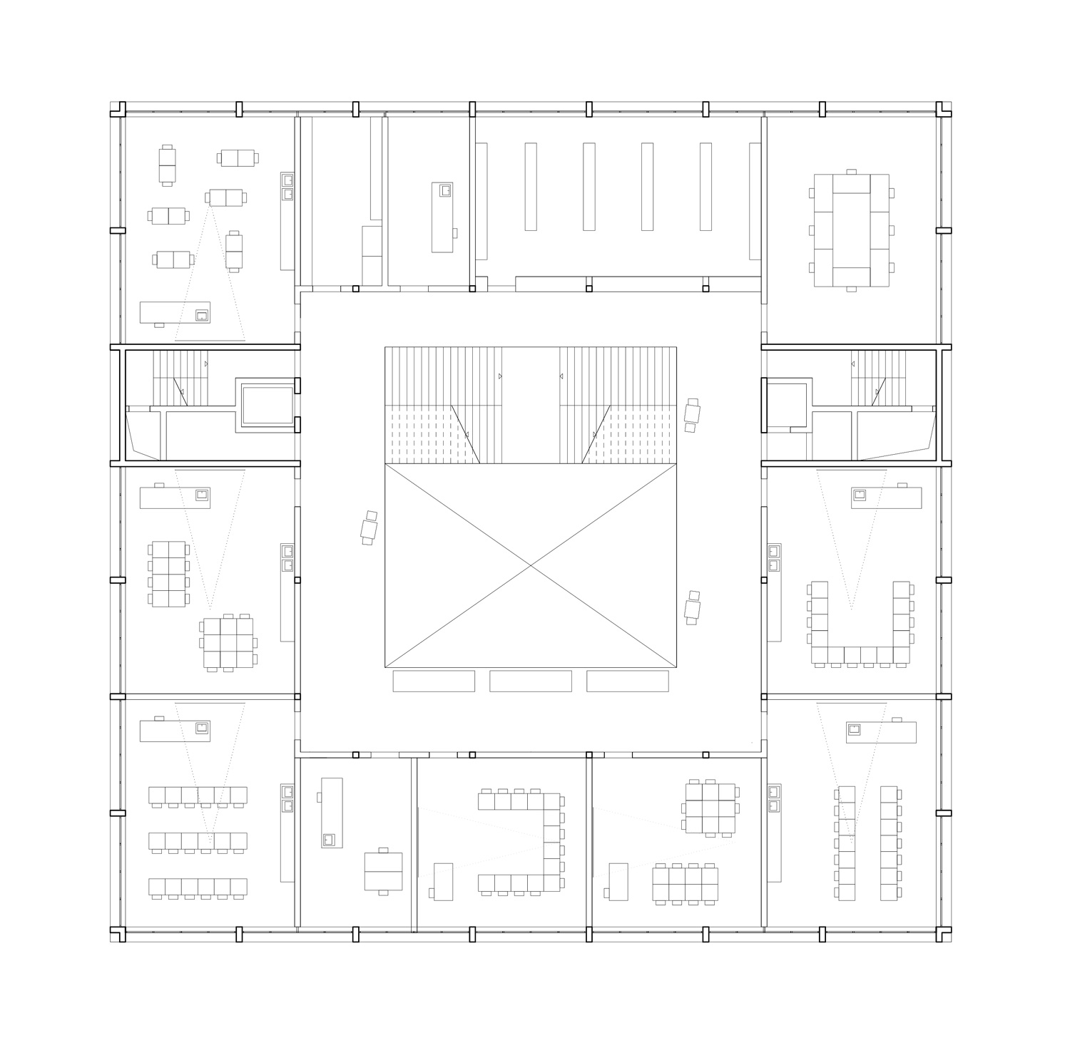 The additional buildings are accessible from various directions and on different levels and thus fit with the logic of the existing campus, which equally has several access points. The ‘head building’ is divided into two parts horizontally: a public section and a teaching section.