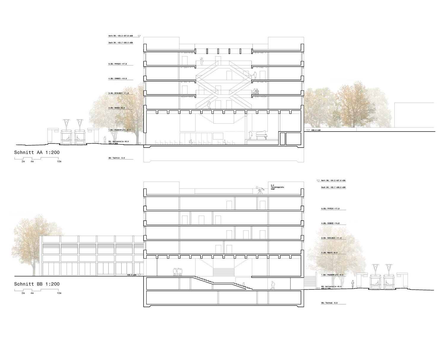 The school campus is completed with the proposed taller structure as a ‘head building’ beside the new Limmattalbahn train station; this volume will distinguish the site and create an entry point to the north. The cube flanks both outside sports fields and also, together with the new sports hall building, flanks the southern school yard.