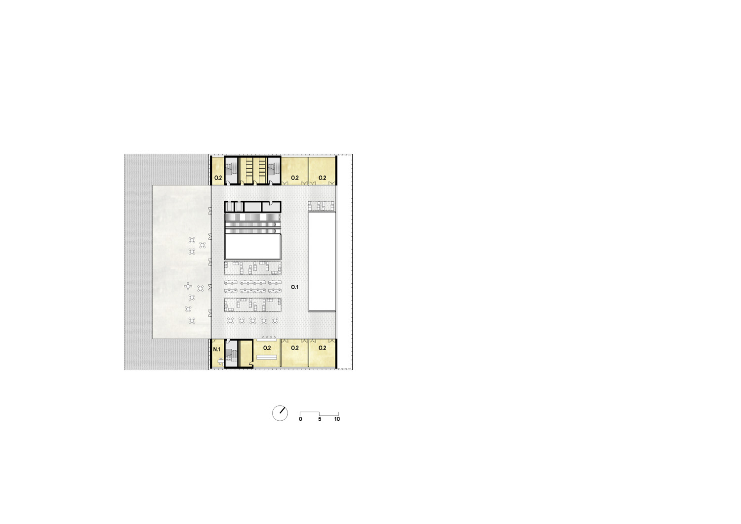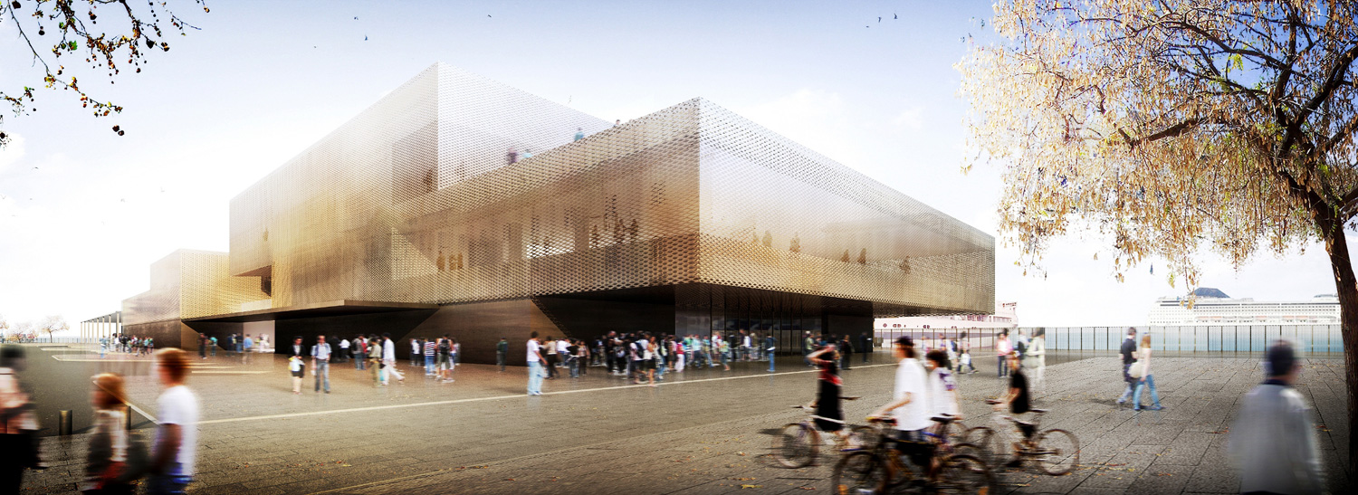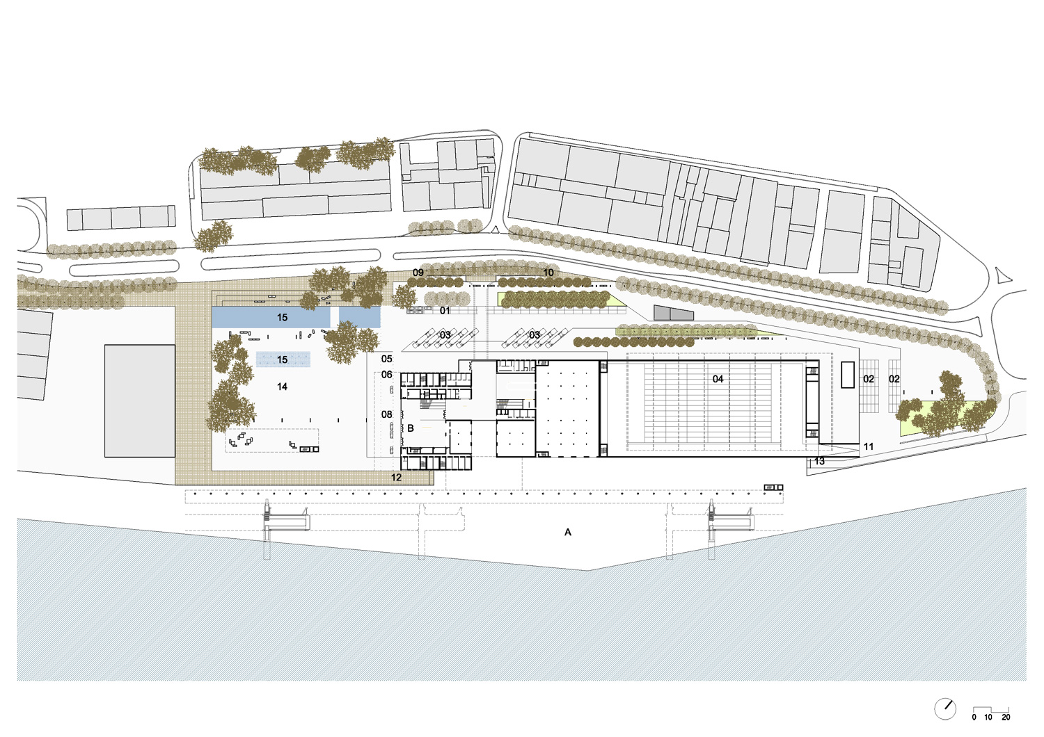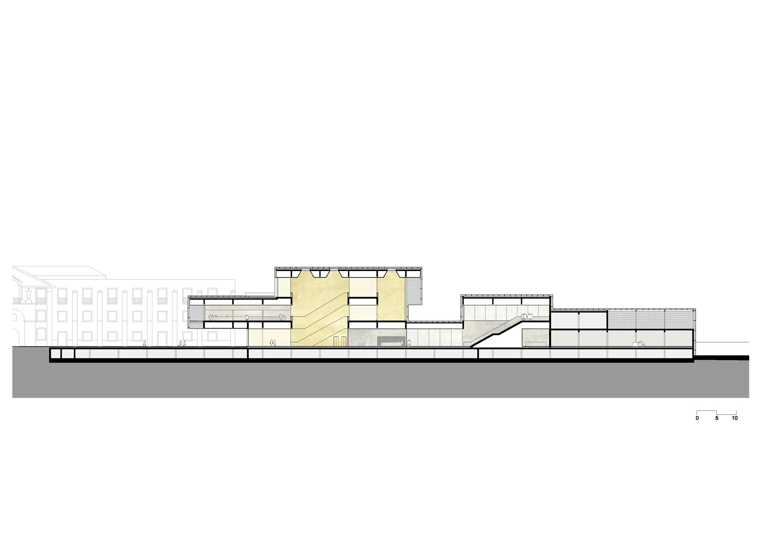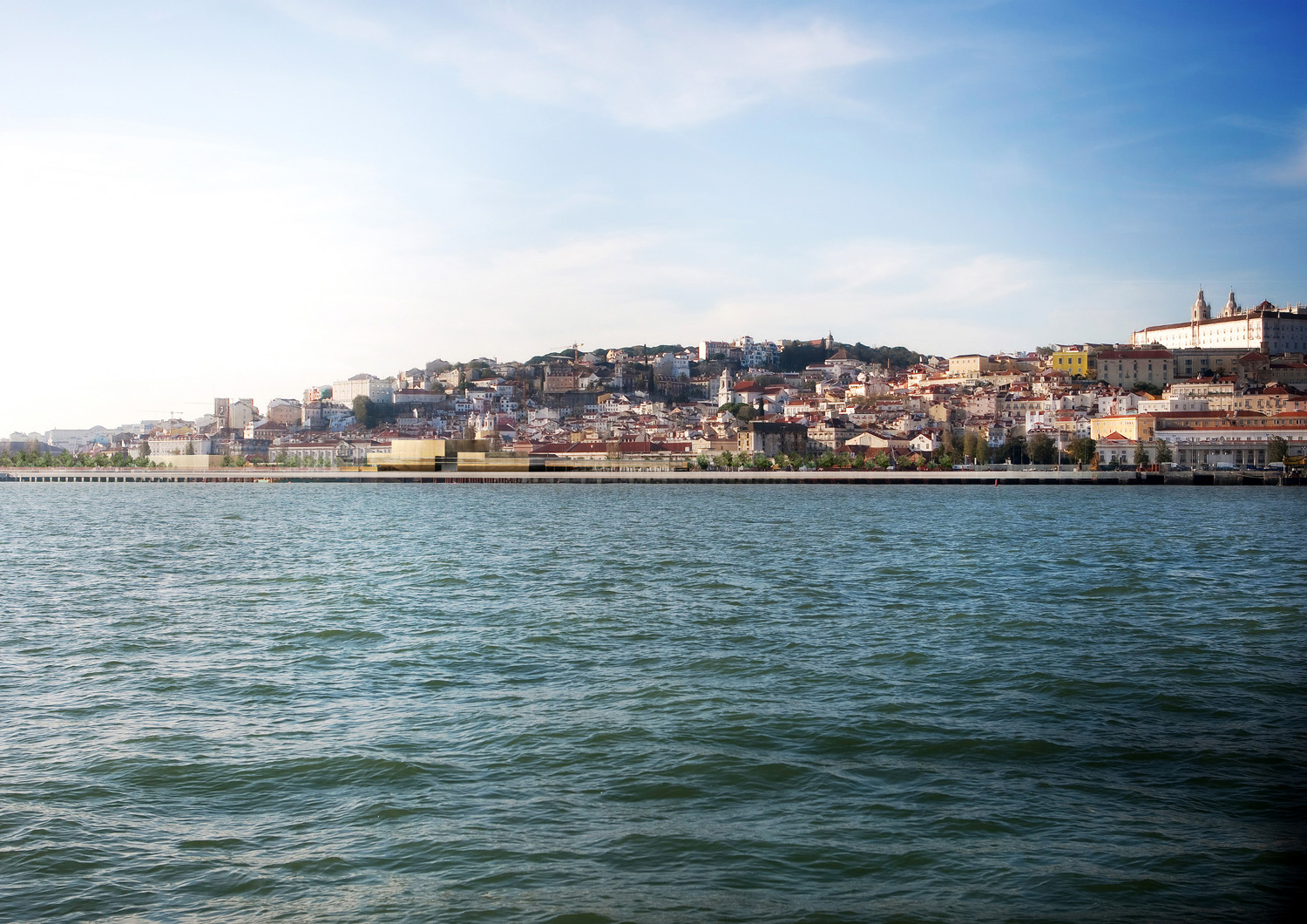 The Terminal is part of the grading scale of the city fabric, which as it descends the hill changes from the fina grain of the steep streets of Alfama to the larger buildings placed below, alongside the riverbank. The building takes its role as the city gate and symbol of the desired revitalization of the area. The project seeks to encourage mobility across the space and between it and the rest of the city, separating and organizing the different types of circulation, waiting areas and pockets of vehicles parking in the intervention area. The new main access square of the Terminal is conceived as a large urban plaza-belvedere, equipped as a comfortable public living room which resolves a broad and easy access to the interior of the equipment and an eventual pleasant waiting time on the exterior. On the periphery of the main square, the provided circulation channels have a special mission to facilitate access, parking and waiting for the private and collective vehicles. The square will be softened with a few nucleus of trees, with a similar scale to the small spaces that can be found scattered across the hills of Alfama, using the species characteristic of Portugal, adapted to the proximity of the river, such as alder or ash. On the edge of the square, near the Customs building is expected to build a mirrored layer of water, thus recalling that the complex is located on a valuable piece of land conquered to the river.