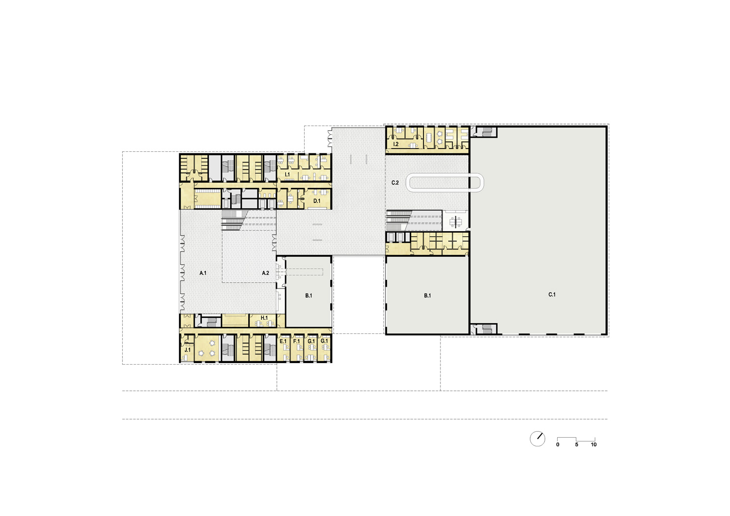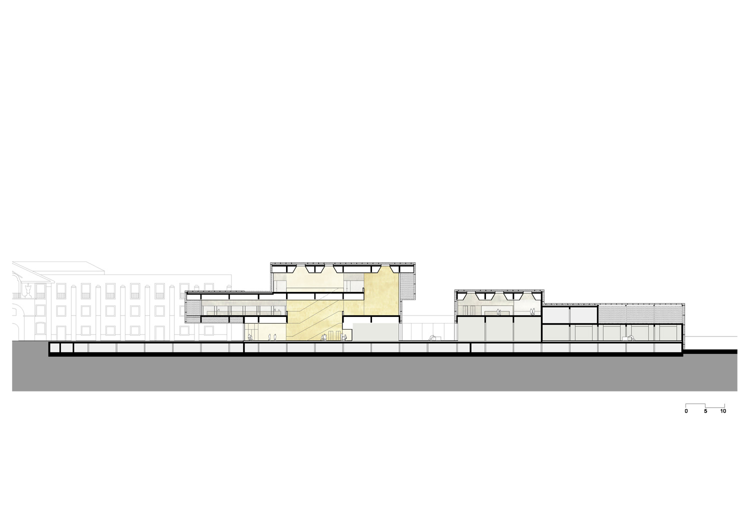 The larger building consists of three major elements of which two are formed by volumes that house the programs of boarding and unboarding of the Terminal and another lower one is defined by the roof plan of the bus terminal area. The building cantilevers over the entrance of the public space sheltering the large waiting room and check-in areas located on the first floor. In this gesture, the building highlights its unique character while setting up a threshold between the building and the large plaza, almost like a chamber with exterior access protected from the direct actions of the elements. The building volumes are coated with a metal skin that merges the volumes of the program in one body next to the river when viewed from a distance, giving it a city scale. Shading the differences between opaque and transparent areas, this material will create a contemporary image, durable and committed in the future. Its distant image will seek to relate to the close surroundings, which will be facilitated by the material’s response to changes in light throughout the day.