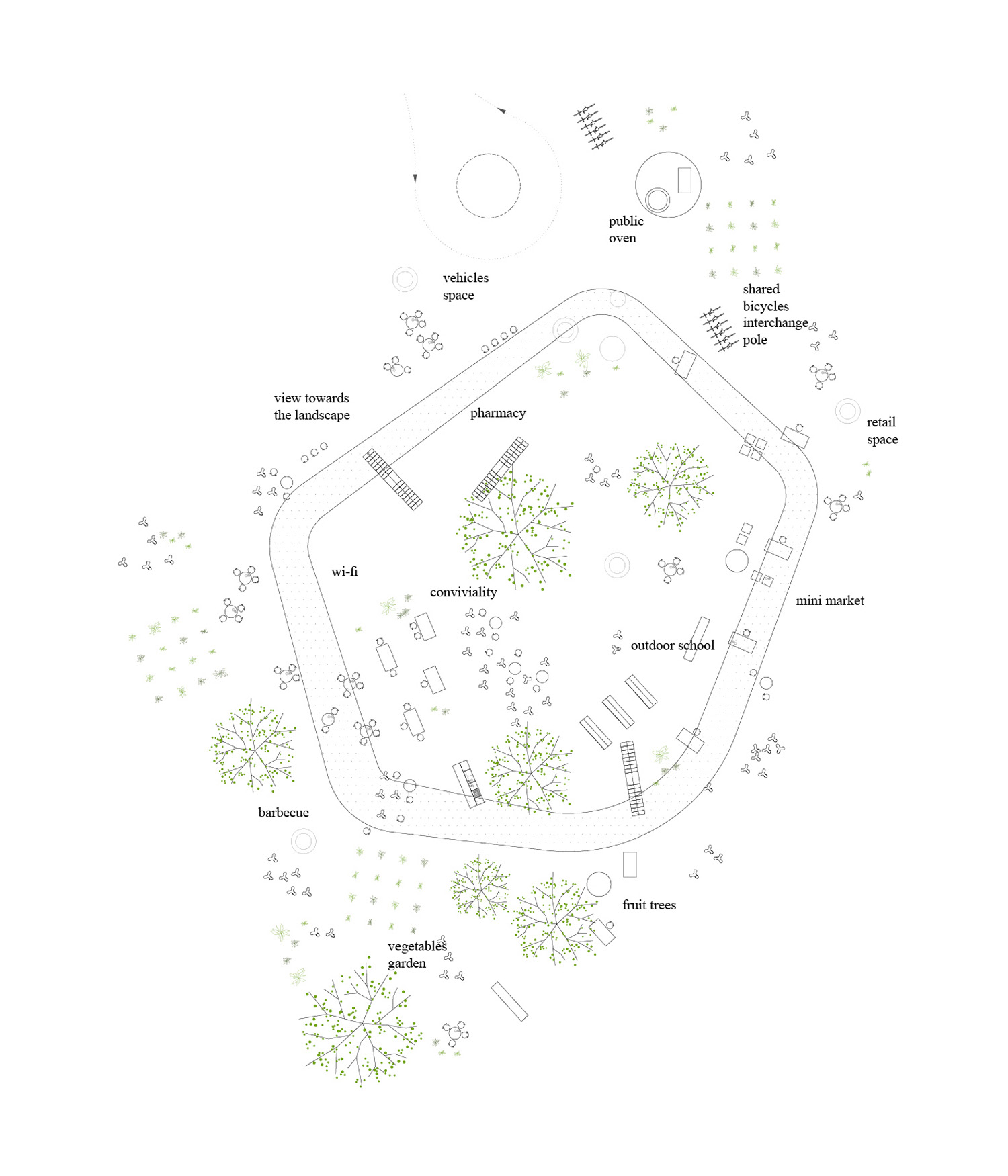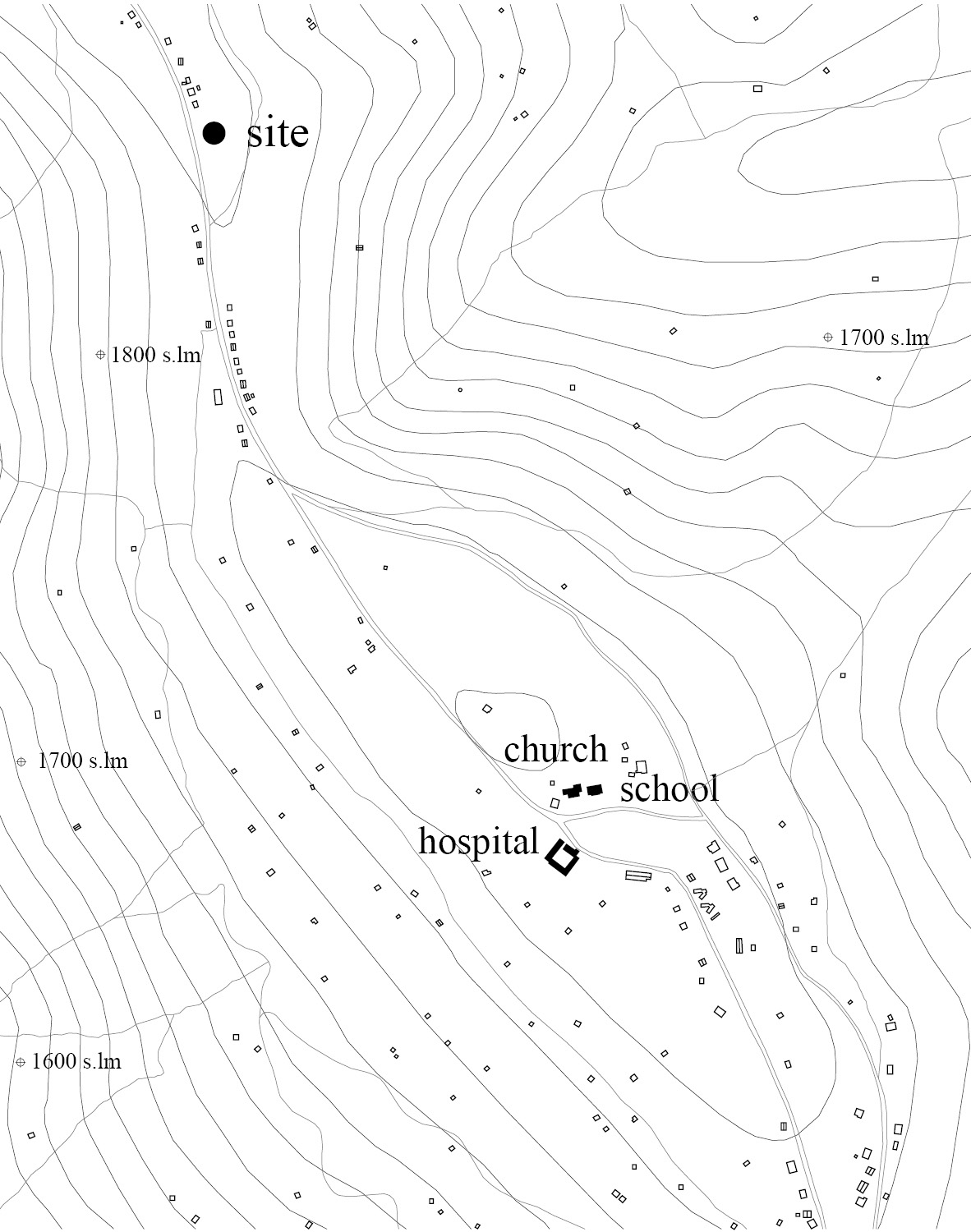 The project is located in Muhura on the hill’s ridge line following the church, the school and the hospital. The new centrality should be able to establish a new site for the idea of community. The program conceives essential services as stationery, pharmacy, bread oven, polyvalent room, with the special cathartic power of a relational space where exchange of experiences is allowed and advocated. For the fact of being in a vast territory of an endless succession of green hills, it is important to define a space, to circumscribe a place that brings back a human scale and that people can grab, reaching a sense of domesticity and everyday life.
