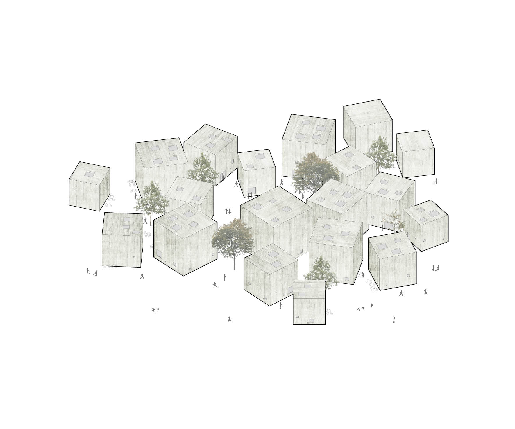 It was proposed the design of a cultural program in a transition zone between the historic center of ljubljana and an uncharacteristic residential area, south of the city. The program, composed of several units, spoke of parts which formed a whole. Going to the cafe, museum, or a conference, should be possible without disturbing the rest of the programs. The circulation spaces, halls and corridors, were defined as public spaces. Doors would separate the grass from each program, which would inhabit a volume, a cube, a unit of the composition. Outside would be a maze where each person would get lost and found. The interior, white and regular, contrasts with the exterior, rough and expressive. The abstract side of each cube would lead it to be what he wanted: the dynamism of the place would be a choreography of intuitions as in the city of zoe, reported by calvino: ‘everywhere in this city we could sleep, manufacture harnesses, cook, accumulate gold coins, disrobe, reign, sell, ask oracles.’ Each window would be a cluttered view of the surrounding bodies. Remains the hope that the spaces would be suitable to a constant metabolism; it was left a place for what is to come.