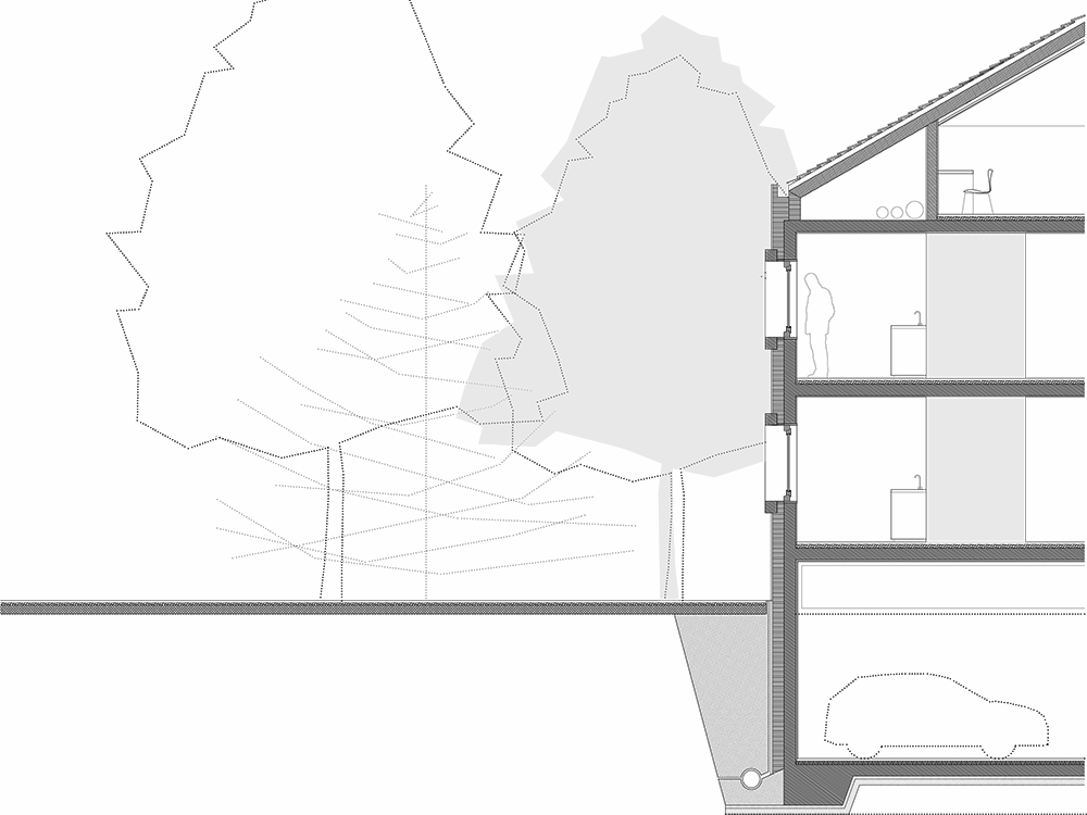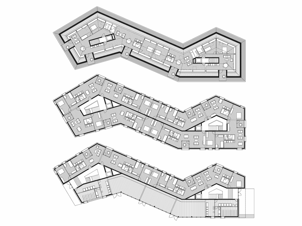 Le projet est surtout attentif aux logements. La géométrie accidentée de la pièce et la libération de la structure des éléments de distribution de celles-ci permettent d’optimiser le recours des orientations, ce qui génère un périmètre continu et lumineux à tous les logements à parts égales, sans établir aucune hiérarchie. De même, les arbres déjà plantés servent comme référence à partir de laquelle on peut proposer une extension du terrain planté pour délimiter chacune des pièces proposées. De cette façon, l’idée de « forêt » est étendue dans tout le parcours du chemin piéton longitudinal principal. Dans les rez-de-chaussée sont situées les zones publiques et communautaires requises par le programme, tel que les blanchisseries, les magasins et les commerces. Ils sont séparés en fonction de sa relation avec le chemin piéton et leur connexion avec le reste des usages commerciaux qui apparaissent dans les édifices les plus prochains. De cette façon, au sud et en relation directe avec la route de Meyrin, sont concentrés les usages commerciaux. D’un autre côté, les logements du rez-de chaussée ainsi que les locaux techniques et communs gardent une relation directe avec la zone jardinée et les chemins piétons, ce qui leur donne plus d’intimité. Chaque appartement possède son espace de séjour orienté au sud, prolongé par une loggia. La chambre séparée par une porte coulissante peut devenir le prolongement du séjour. Le bois, que l’on retrouve aussi en touches sur la façade, apporte une ambiance chaleureuse à l’intérieur.