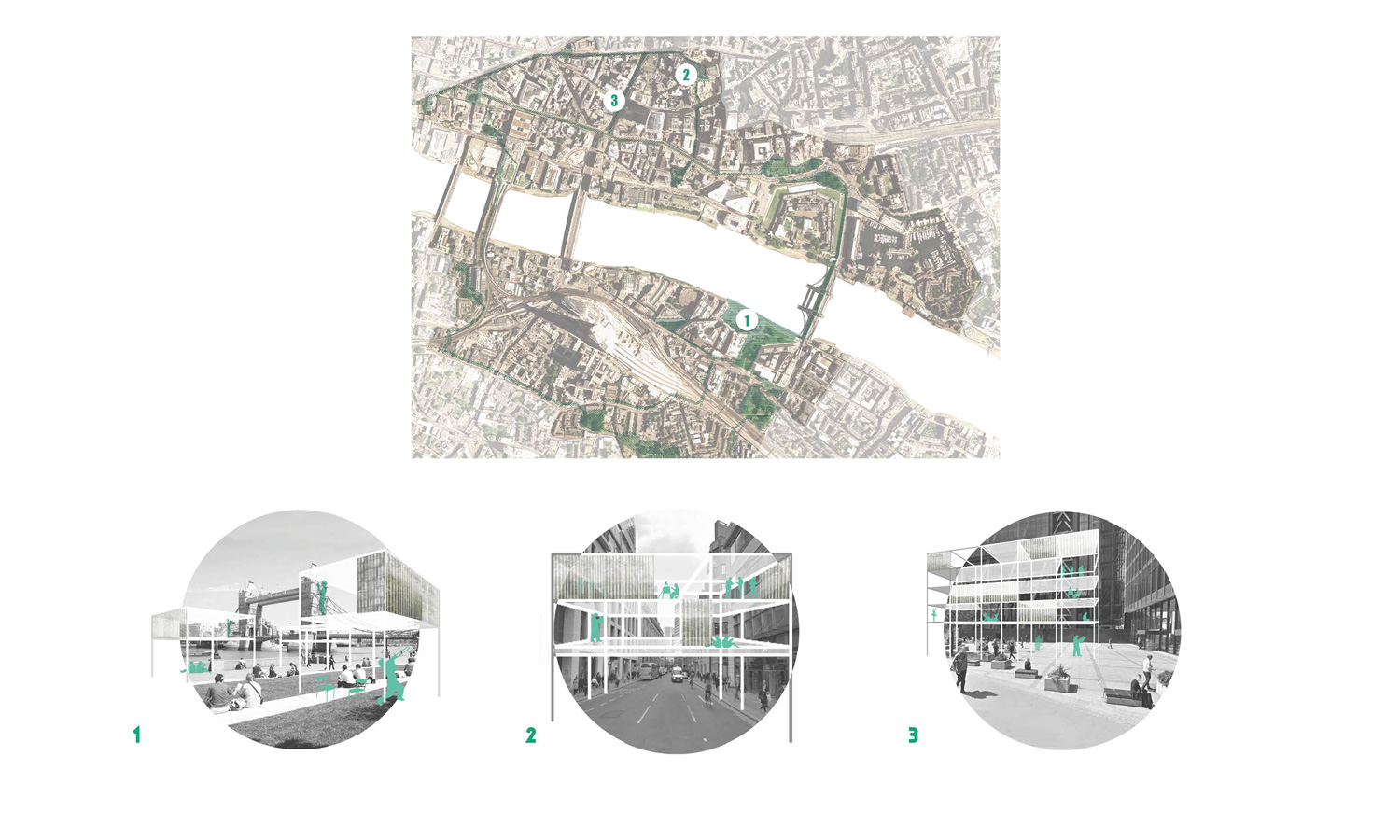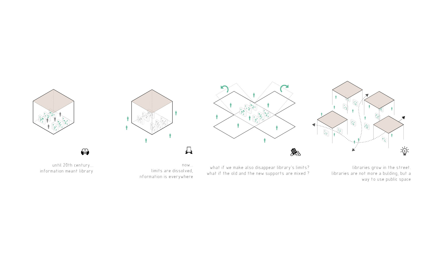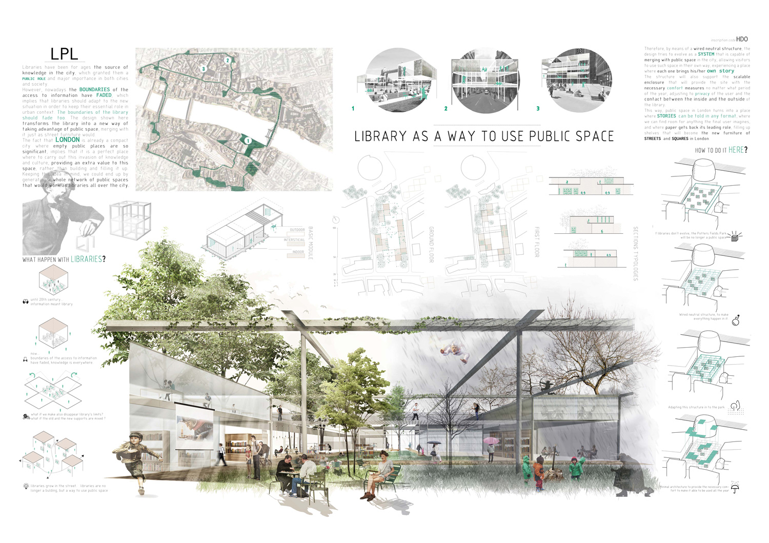What’s the definition of a library today? Libraries have been for ages the source of knowledge in the city, which granted them a public role and major importance in both cities and society. However, nowadays the boundaries of the access to information have faded, which implies that libraries should adapt to the new situation in order to keep their essential role in urban context. The boundaries of the library should fade too. The design shown here transforms the library into a new way of taking advantage of public space, merging with it just as street furniture would. The fact that London is already a compact city where empty public places are so significant, implies that it is a perfect place where to carry out this invasion of knowledge and culture, providing an extra value to this space, rather than building and filling it up. Keeping this idea in mind, we could end up by generating a whole network of public spaces that would work as libraries all over the city.