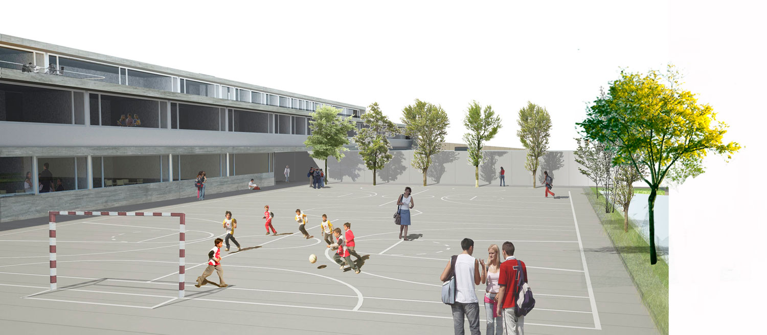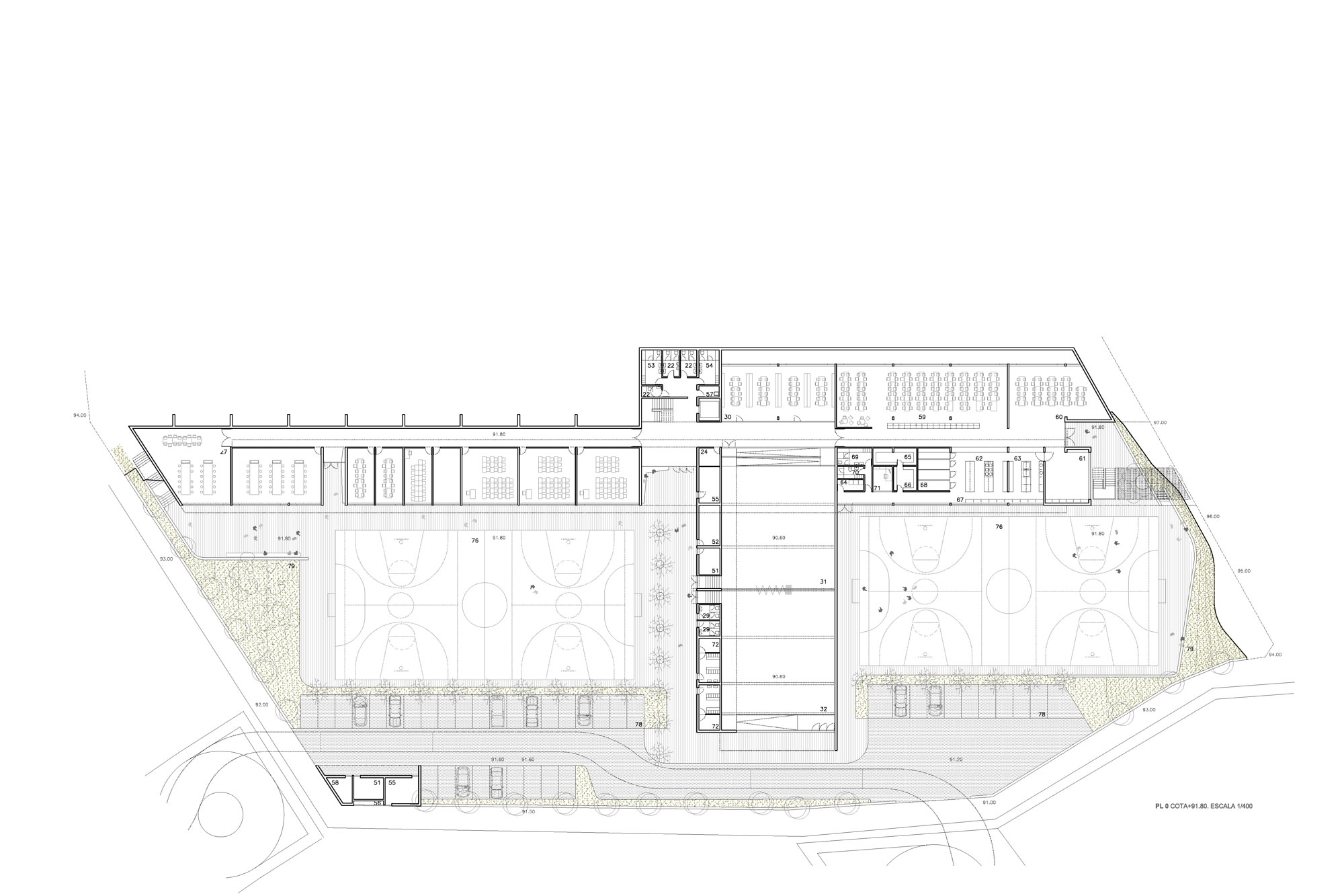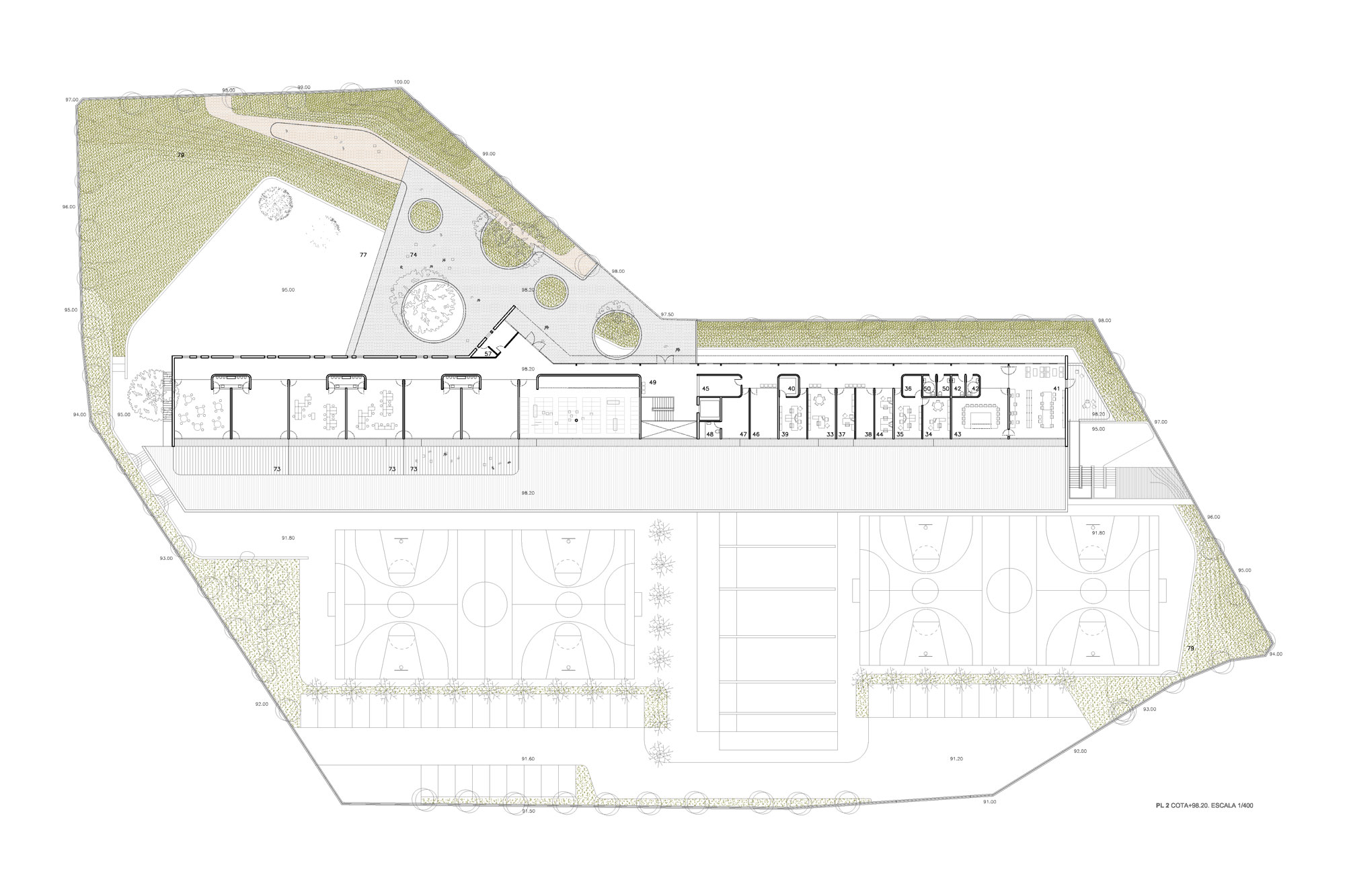 En la planta más baja, en perfecta continuidad con las pistas deportivas y los accesos rodados desde el vial más al sur, se ubica el área de Bachiller. Su disposición permite también la doble salida a las zonas de patio así como una relación directa con vistas y sol. En ese mismo nivel, en el extremo este, se proyecta todo el equipamiento de comedores. Esta situación permite su utilización en horarios muy concretos y su no interferencia en las actividades del resto de la jornada. Desde ellos se realiza con gran eficacia la salida a patio tras las comidas. El acceso pavimentado tras la pista deportiva permite el acceso rodado hasta la zona de almacenes para las labores de carga y descarga. Por último, el cuerpo transversal situado entre ambas pistas, alberga las aulas polivalentes y los programas auxiliares a las zonas deportivas. Esta ubicación permite una continuidad entre usos de recreo, una agradable articulación de las áreas de exterior (evitando la continuidad de grandes zonas pavimentadas y sin arbolado) y, muy especialmente, la facilidad de uso de todos estos equipamientos y sus servicios en horarios y días diferentes a los de uso habitual del centro. Todos los espacios exteriores no definidos por el programa y que resultan de retranqueos, y espacios de intercomunicación se elaboran y acondicionan de modo que lejos de resultar residuales se constituyan en espacios de encuentro y estancia para los alumnos propiciando su encuentro y comunicación más allá de las prácticas deportivas.