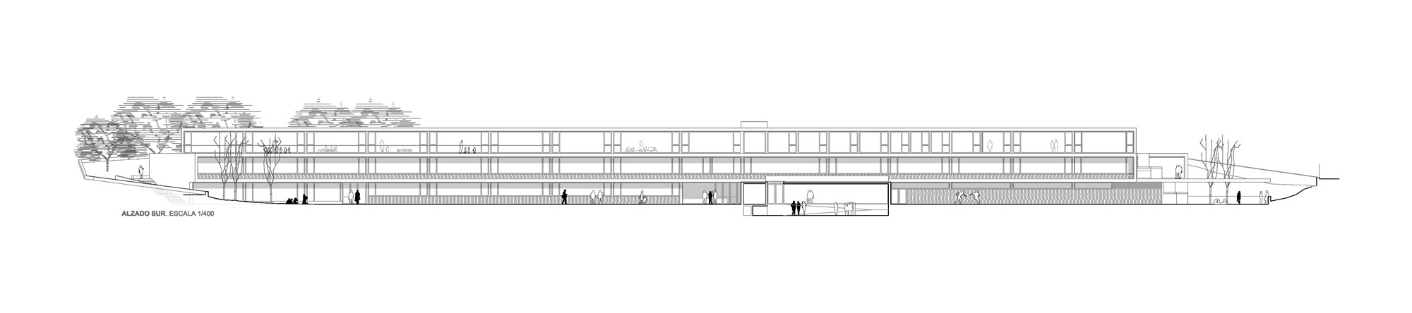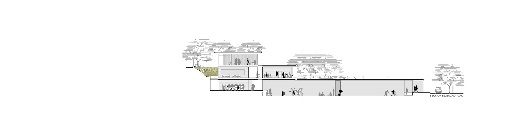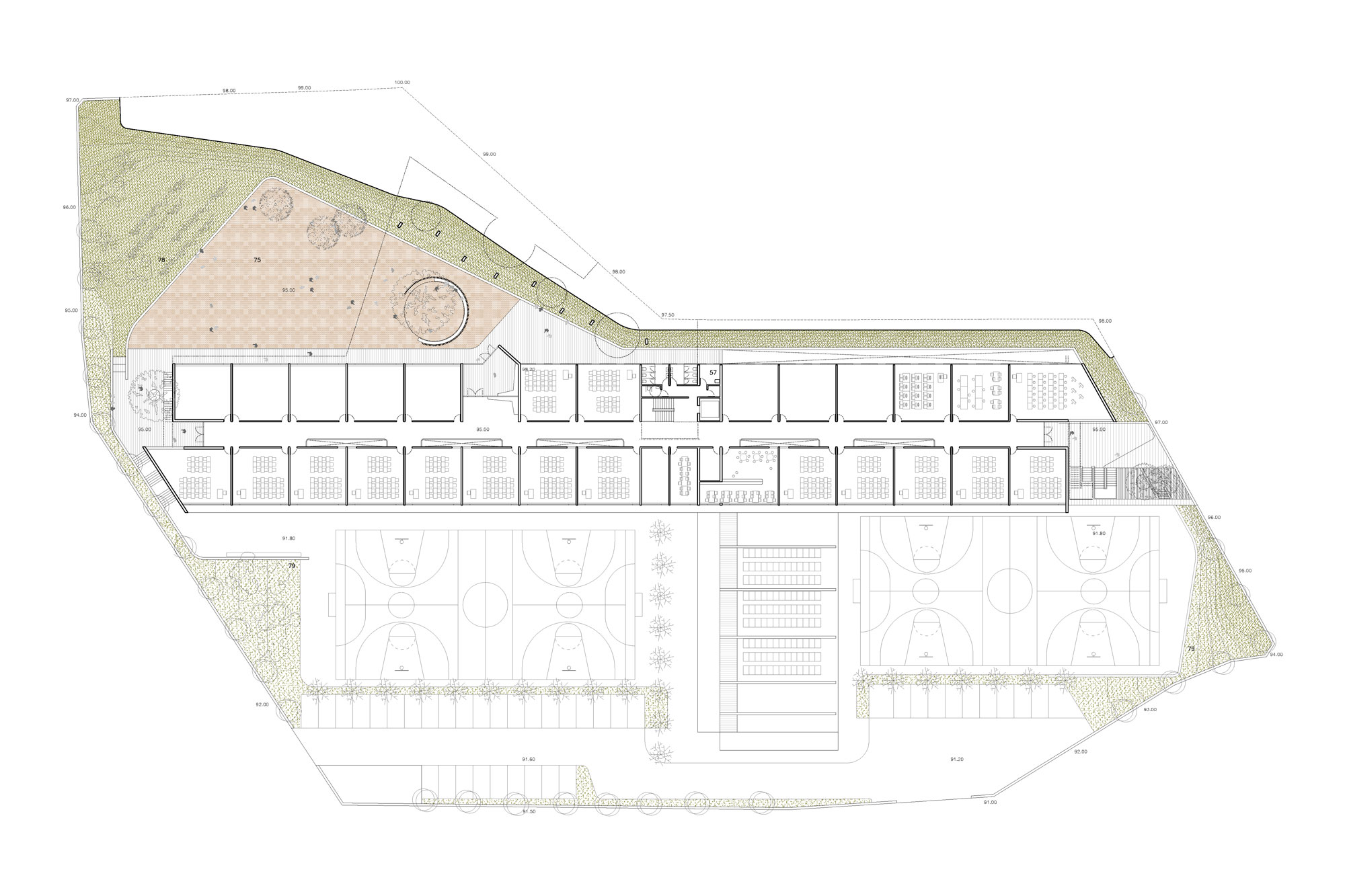En la planta más baja, en perfecta continuidad con las pistas deportivas y los accesos rodados desde el vial más al sur, se ubica el área de Bachiller. Su disposición permite también la doble salida a las zonas de patio así como una relación directa con vistas y sol. En ese mismo nivel, en el extremo este, se proyecta todo el equipamiento de comedores. Esta situación permite su utilización en horarios muy concretos y su no interferencia en las actividades del resto de la jornada. Desde ellos se realiza con gran eficacia la salida a patio tras las comidas. El acceso pavimentado tras la pista deportiva permite el acceso rodado hasta la zona de almacenes para las labores de carga y descarga. Por último, el cuerpo transversal situado entre ambas pistas, alberga las aulas polivalentes y los programas auxiliares a las zonas deportivas. Esta ubicación permite una continuidad entre usos de recreo, una agradable articulación de las áreas de exterior (evitando la continuidad de grandes zonas pavimentadas y sin arbolado) y, muy especialmente, la facilidad de uso de todos estos equipamientos y sus servicios en horarios y días diferentes a los de uso habitual del centro. Todos los espacios exteriores no definidos por el programa y que resultan de retranqueos, y espacios de intercomunicación se elaboran y acondicionan de modo que lejos de resultar residuales se constituyan en espacios de encuentro y estancia para los alumnos propiciando su encuentro y comunicación más allá de las prácticas deportivas.