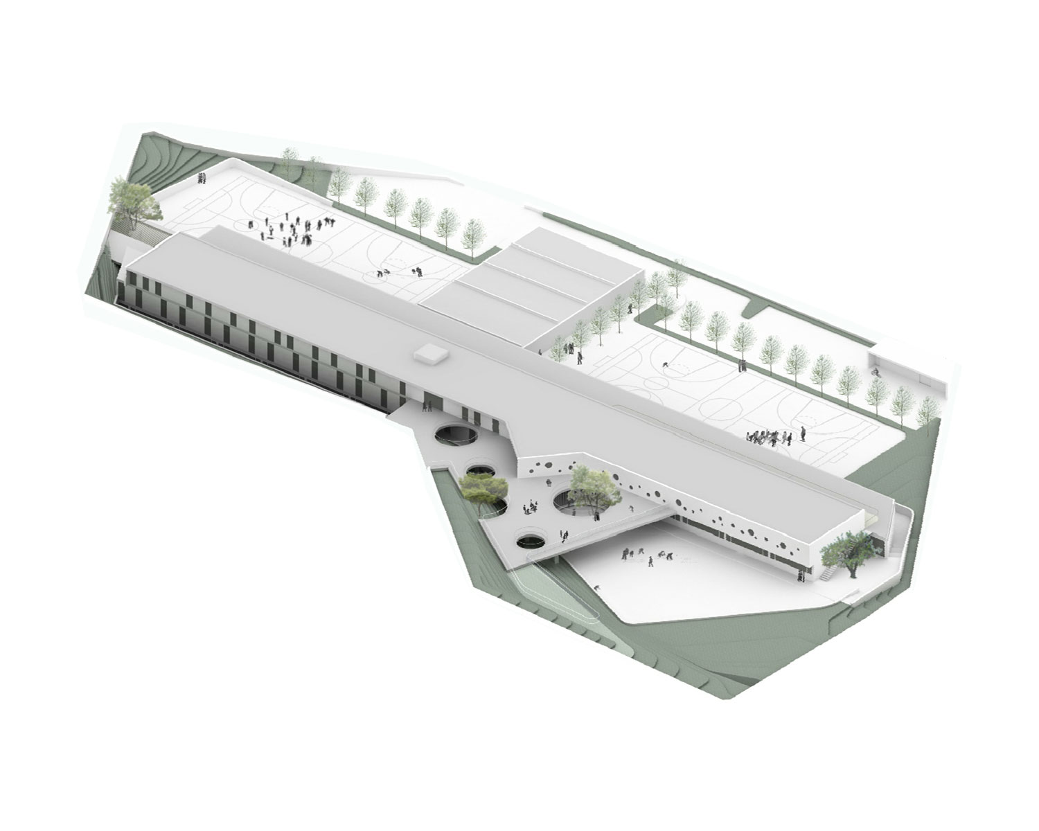 Abundando en esta intención se plantea que todo el ajardinamiento y arbolado se realice con especies autóctonas de perfecta adaptación al clima y al paisaje natural de la zona. Por último, todo el tratamiento general de la parcela se hace con especial cuidado para minimizar la incidencia que una edificación y pistas de tal tamaño puedan llegar a tener sobre una ladera de especial valor paisajístico. Propone una diferenciación no excluyente de áreas, una eficacia funcional no incompatible con una pertinente convivencia y una potenciación de la relación entre personas y entre ellas y el medio construido y natural como base para una convivencia armoniosa. Como se ha dicho, el proyecto confía en la capacidad de la arquitectura para acompañar al alumno, en consideración a su potencial sensibilidad e inteligencia, en la construcción de un medio social a través de las vivencias propiciadas por el medio construido en que se produce su iniciación en el aprendizaje y el conocimiento.