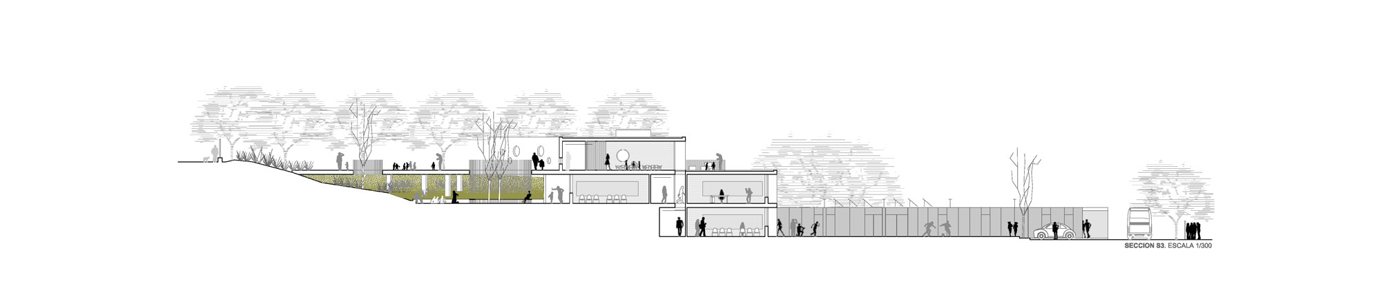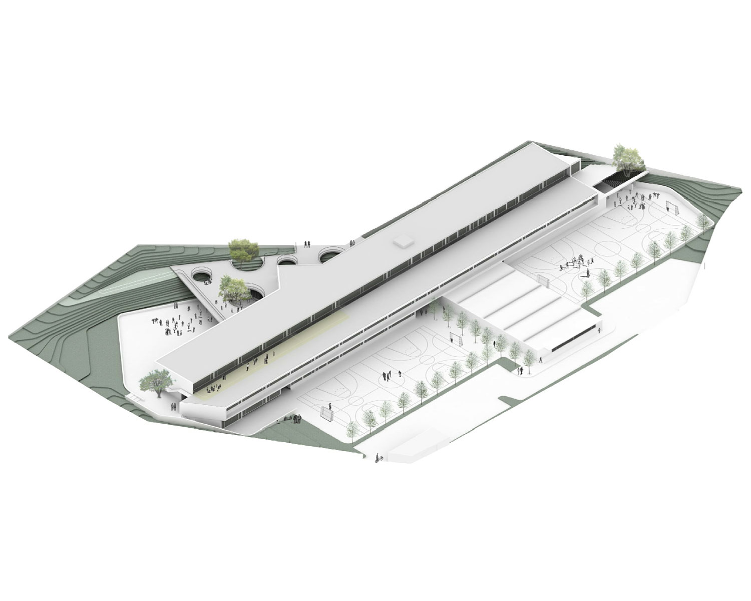 La planta intermedia se destina a las dependencias de Primaria y Secundaria debidamente diferenciadas y con posibilidad de salida independiente hacia las respectivas áreas de exterior. Para primaria, como patio de juegos, se reserva una amplia zona horizontal en la parte norte del solar que, por su tamaño, se prevé perfectamente soleada y arropada por la vegetación que conforma los taludes de borde que acomodan las plataformas a los viales perimetrales. Parte importante de esta zona de juegos se encuentra cubierta por la gran plataforma de juegos de infantil que propicia espacios de sombra los días de sol y secos en días de lluvia. Los grandes vanos circulares en el suelo del espacio exterior de los más pequeños permiten golpes de sol o lluvia en esta zona de gran porche y una relación visual directa entre niños de diversas edades propiciando su interacción. Los alumnos de secundaria ocupan un extremo opuesto de esa misma planta y tienen doble posibilidad de salida hacia las zonas de pistas de juego situadas una planta por debajo de sus aulas.