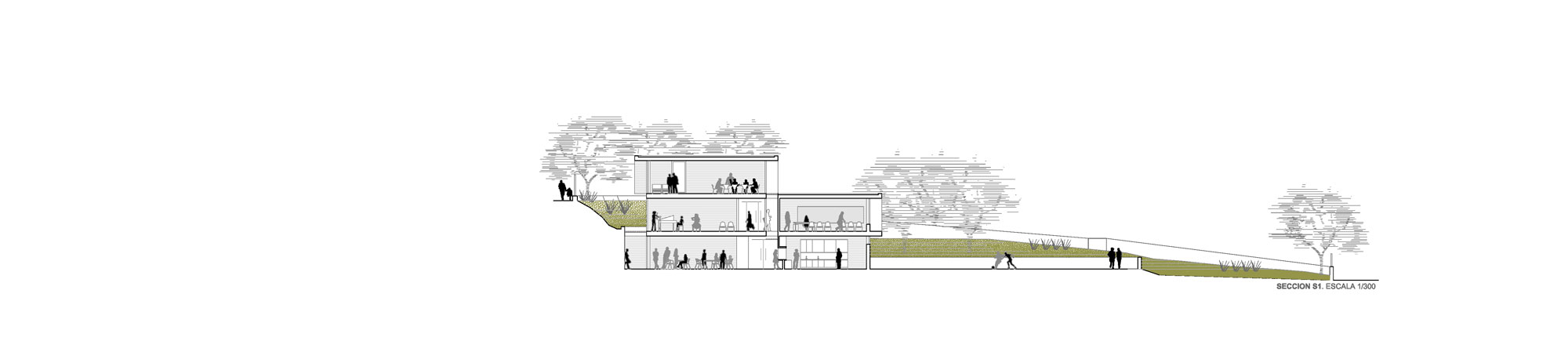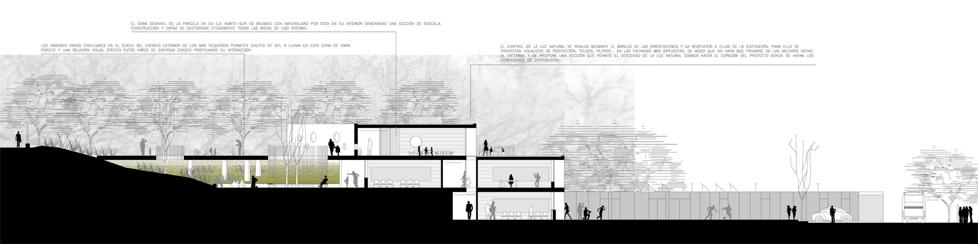 Esta posición del cuerpo construido permite la utilización diferenciada de la totalidad de la parcela según niveles educativos generando en todas las orientaciones posibilidades de buenas vistas y de uso exterior acorde con los espacios a los que se ofrecen y eliminando en todo caso los espacios residuales en ningún punto del solar. En la parte más alta, y con posibilidad de acceso independiente, se ubica el área de Infantil con perfecta orientación al sur desde las aulas y sus contiguas aulas de exterior y con salida a pie llano hacia la zona exterior de juegos. Esta última se constituye como un gran plano horizontal de pavimento blando que abre su suelo en una diversidad de rotos circulares que permiten la visión hacia abajo sobre el área de juegos de primaria y a su vez la continuidad de uso con una pequeña zona de terreno natural arropada por el talud que separa de la vía peatonal en su lado norte. Esta disposición de las zonas de uso de los más pequeños permite horarios diferenciados del resto y una gran relación visual con el paisaje y el resto de la parcela, así como con las actividades de los alumnos mayores, sin producir injerencias molestas con ellos. Un gran ascensor con capacidad para veinte adultos permite bajar de modo directo a estos alumnos más pequeños a las zonas de comedor situadas en la planta más baja del conjunto. En ese mismo nivel, el más alto, al margen de interferencias con las áreas de alumnado y en relación directa con el acceso de visitas desde la calle, se dispone toda el área de adultos: administración, dirección y profesorado.