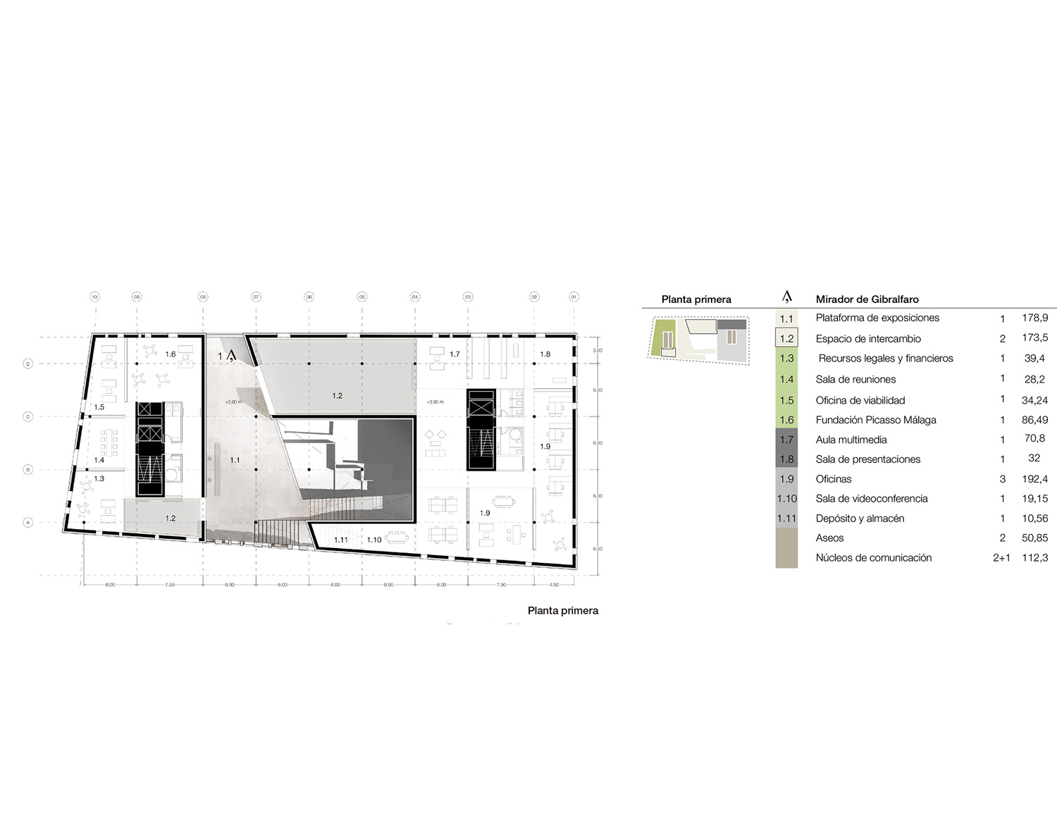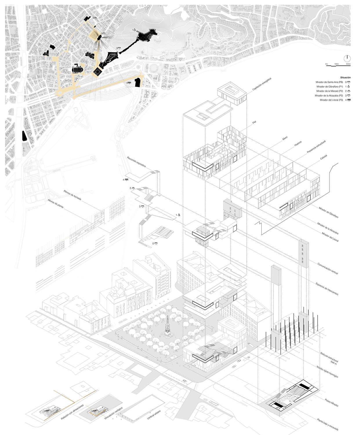 El proyecto da un mirador a la ciudad. Conecta la Plaza de la Merced con un gran mirador público a través de un paseo pautado, prolongación de los recorridos urbanos que confluyen en el lugar. Una calle interior que ofrece ventanas a la historia de la ciudad vinculando la cota romana con la Málaga actual, la de nuestro tiempo. Un mirador público en una ciudad sin miradores. Se parte de una premisa clara: a la disciplina arquitectónica no le corresponde decidir sino proponer. Conscientemente no se define un modelo de uso y gestión cerrado, se exponen una serie de soluciones abiertas para la reflexión y el debate. Este concurso debe ser el punto de partida para un diálogo en el que participen distintos actores, ciudadanos y representantes públicos, que definan el modelo que más se adecue al interés general